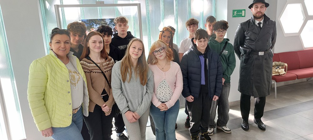 Dnia 27.03.2026 r. ósmoklasiści wraz z wychowawczynią zostali zaproszeni na przedstawienie pt. „Praca, cierpienie i tęskne marzenie” przygotowane przez zespół Grupy Teatralnej Strzegomskiego Centrum Kultury, którego reżyserzy odtworzyli brutalną obozową rzeczywistość FAL Graben funkcjonującego podczas II wojny światowej na terenie Strzegomia.