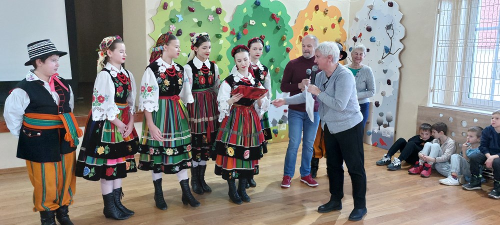 W piątek – 21 listopada 2025 r. – przedszkolaki oraz uczniowie z klas 1-4 z ZSP w Jaroszowie wzięli udział w wyjątkowym spotkaniu w sali gimnastycznej z artystami z Zespołu Folklorystycznego „Kostrzanie”.