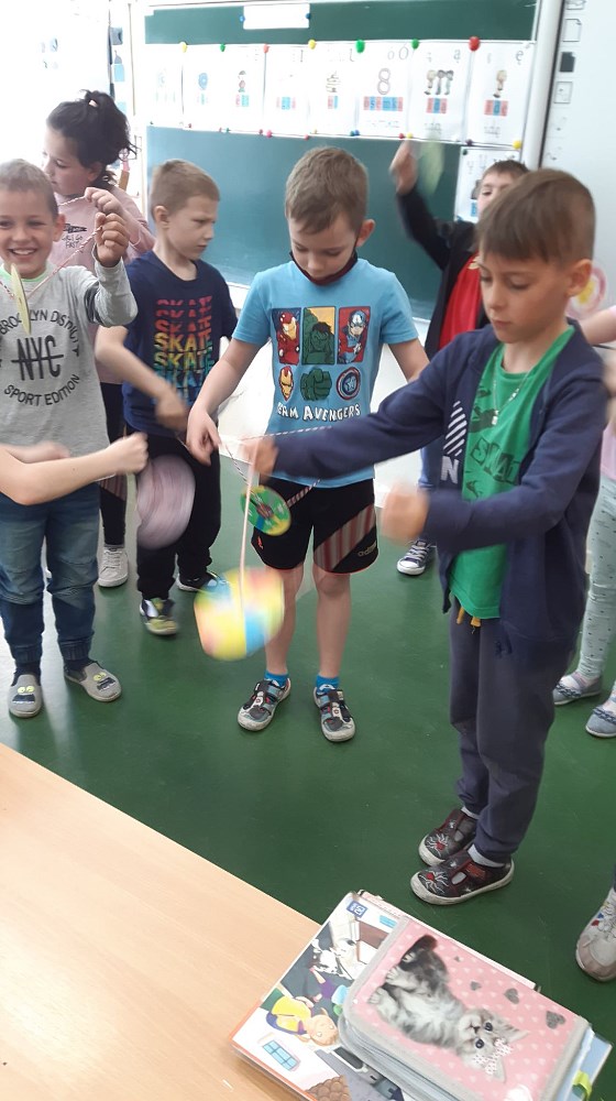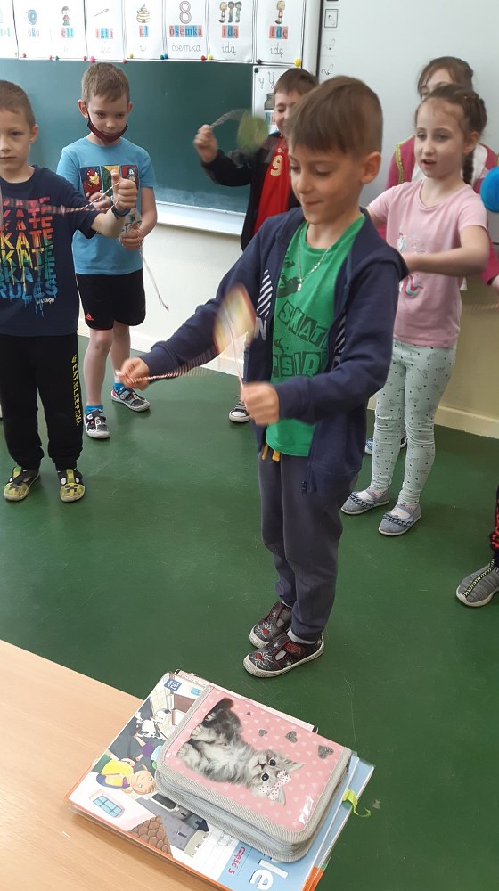 Z okazji Dnia Dziecka na uczniów klasy pierwszej z ZSP w Jaroszowie czekały w szkole różne atrakcje przygotowane przez wychowawczynię – Annę Madej. Jedną z nich była nowa zabawka, którą Pierwszaki zrobiły same. Wykorzystały do tego tylko pokolorowane kółka i kawałek sznurka. Radości było co niemiara zarówno podczas pracy, jak i podczas zabawy. „Zabawka – hit”, tak nazwali ją Pierwszoklasiści.