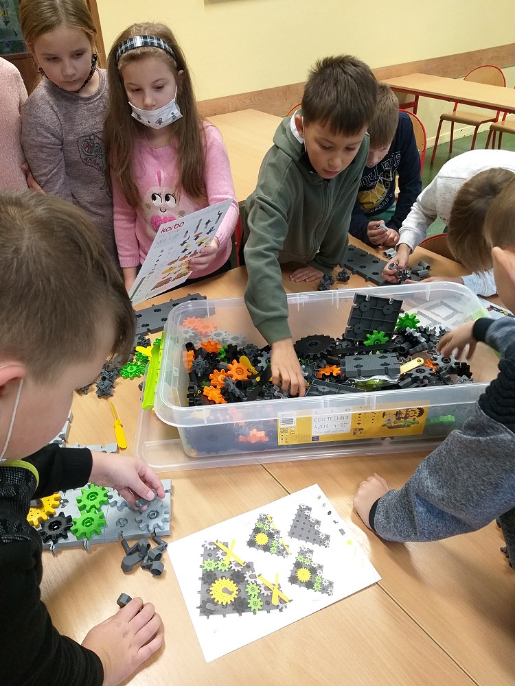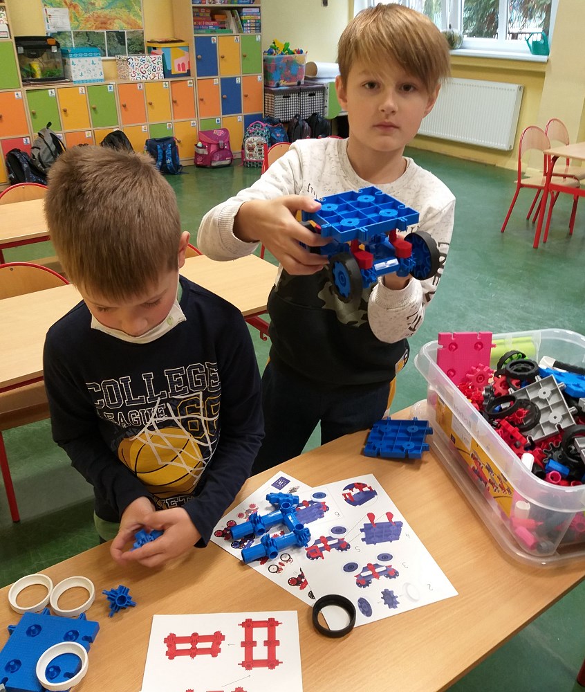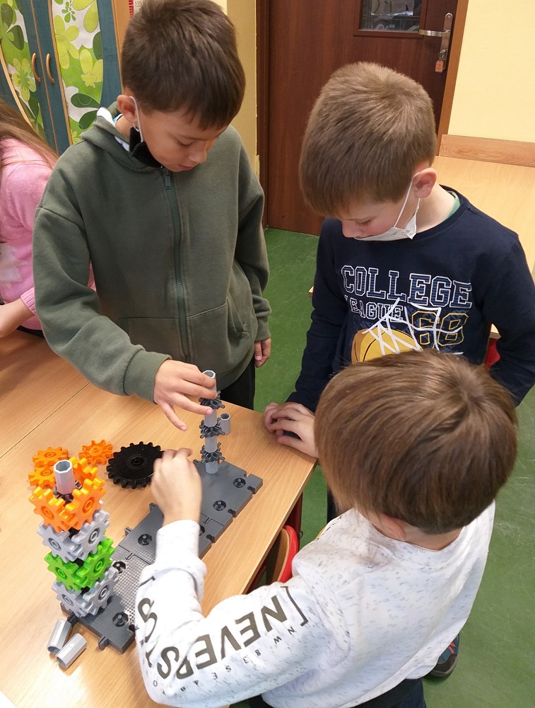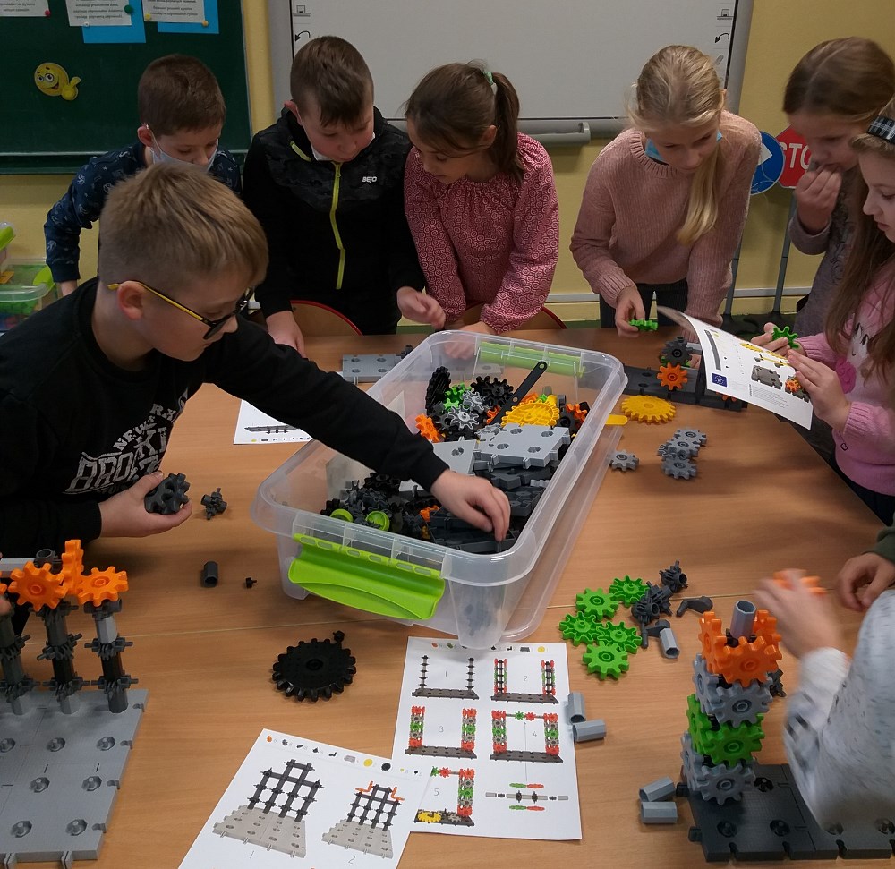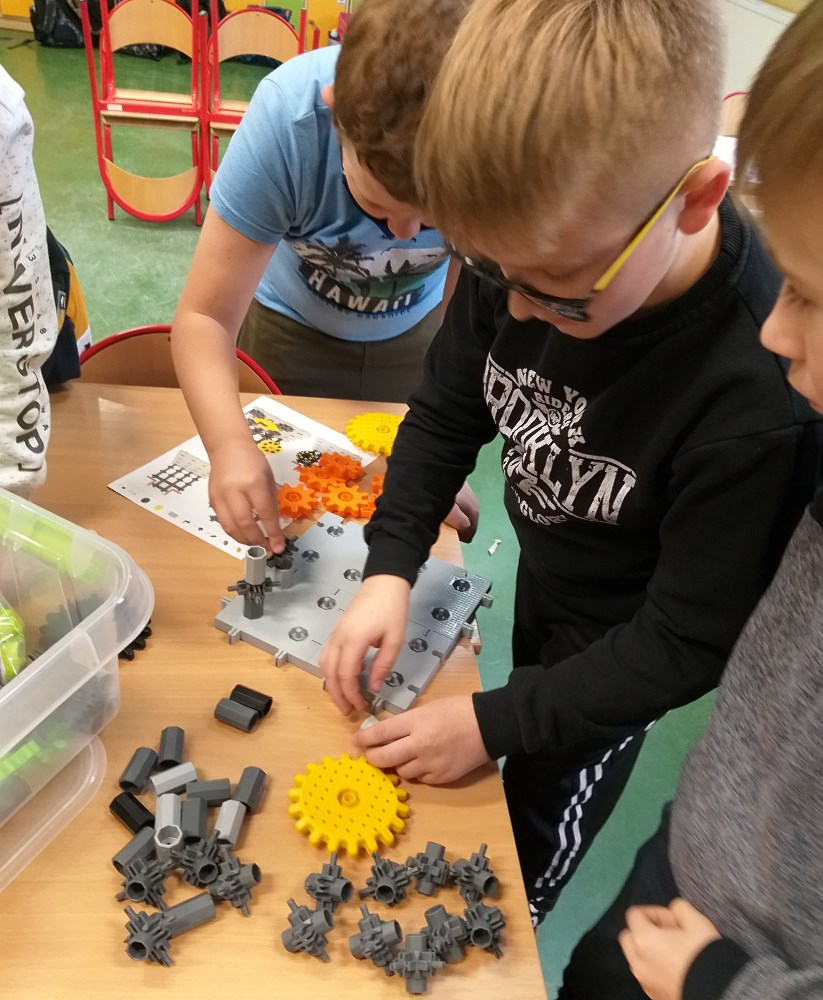 Uczniowie wykorzystali klocki do nauki podstawowych zagadnień z zakresu mechaniki i techniki. Nauka działania kół zębatych, przełożeń z pomocą klocków staje się naprawdę dziecinnie prosta. Tłumaczenie nawet skomplikowanych zjawisk jest znacznie prostsze i poparte konkretnym, namacalnym przykładem, co na zajęciach z dziećmi udowadnia prowadząca – Barbara Zbrożek.