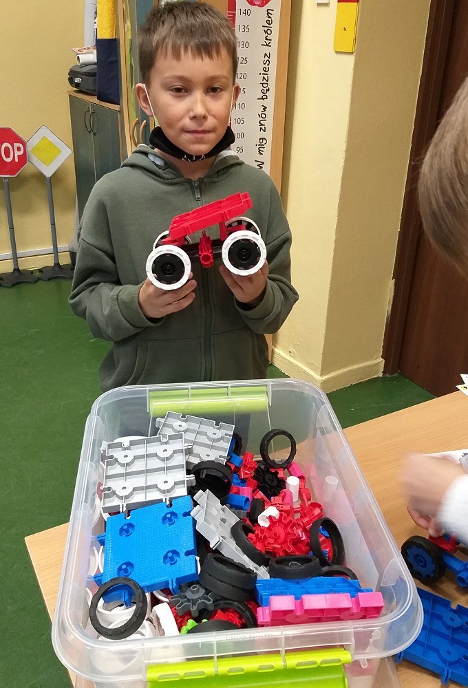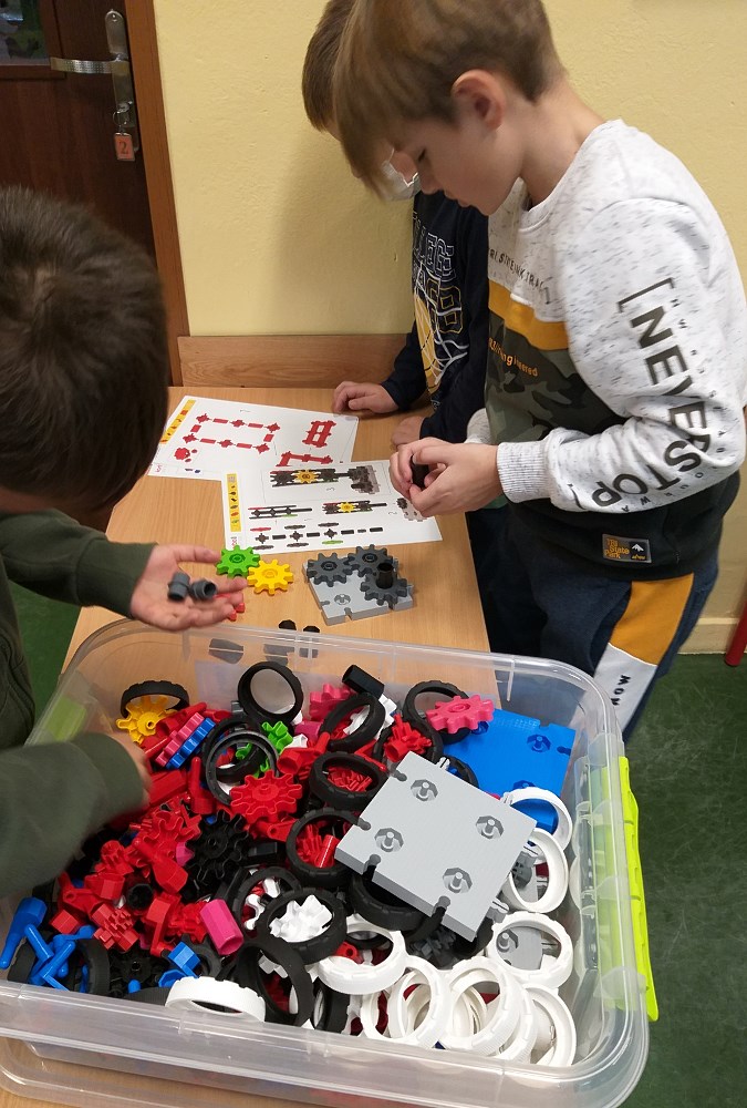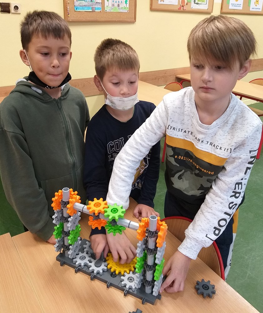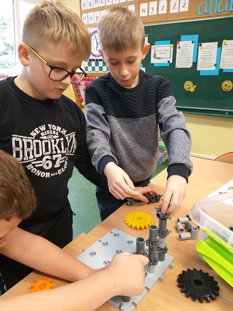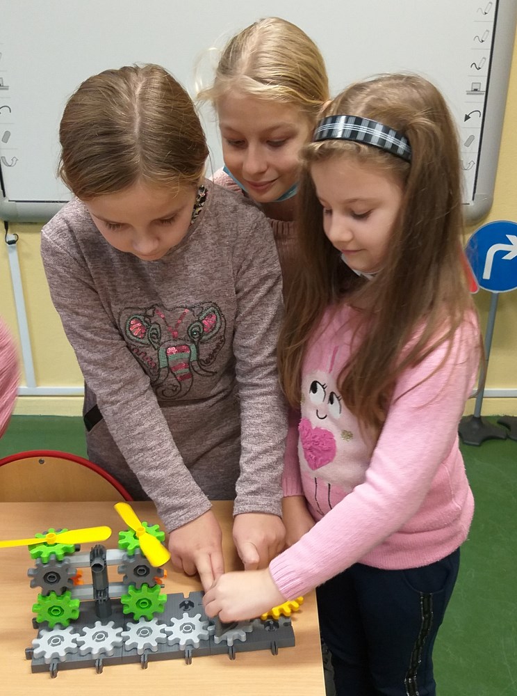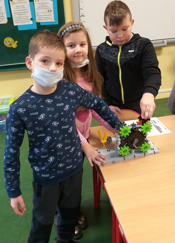 Uczniowie wykorzystali klocki do nauki podstawowych zagadnień z zakresu mechaniki i techniki. Nauka działania kół zębatych, przełożeń z pomocą klocków staje się naprawdę dziecinnie prosta. Tłumaczenie nawet skomplikowanych zjawisk jest znacznie prostsze i poparte konkretnym, namacalnym przykładem, co na zajęciach z dziećmi udowadnia prowadząca – Barbara Zbrożek.