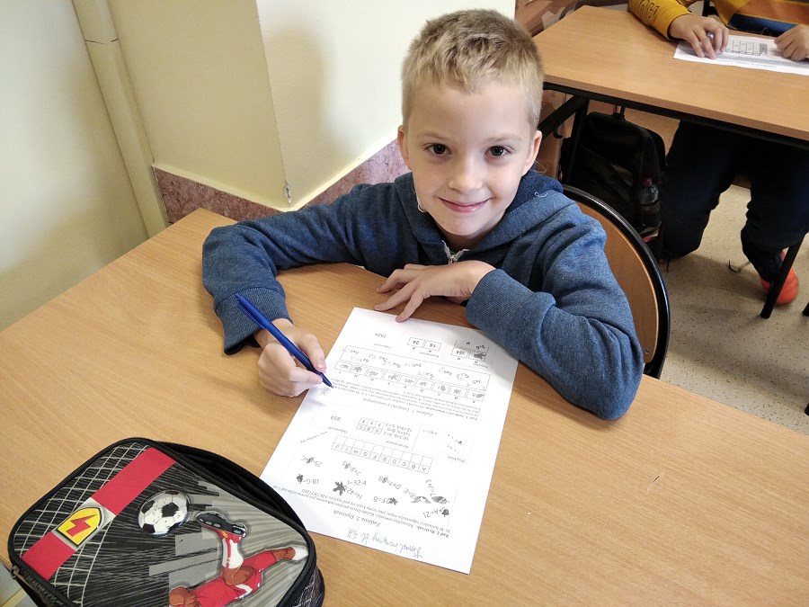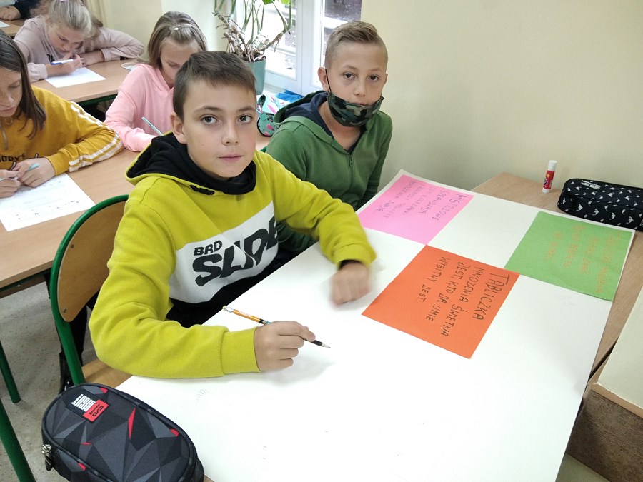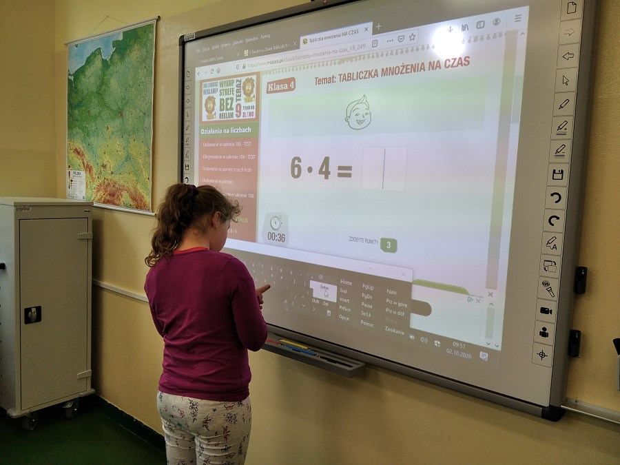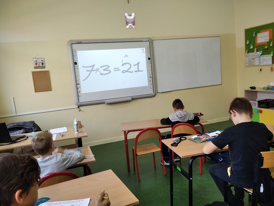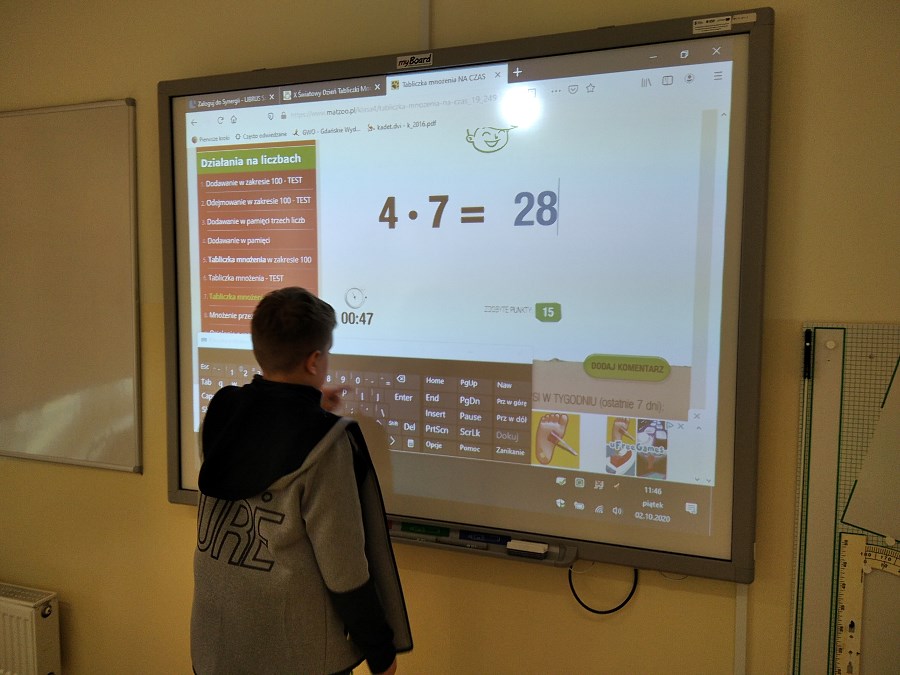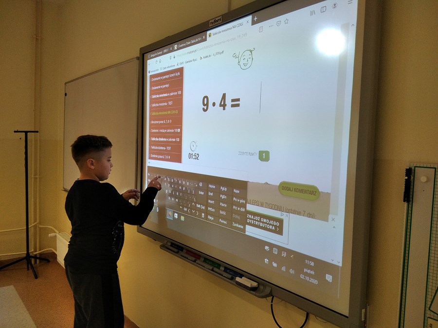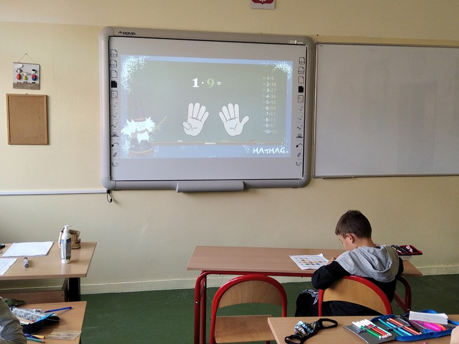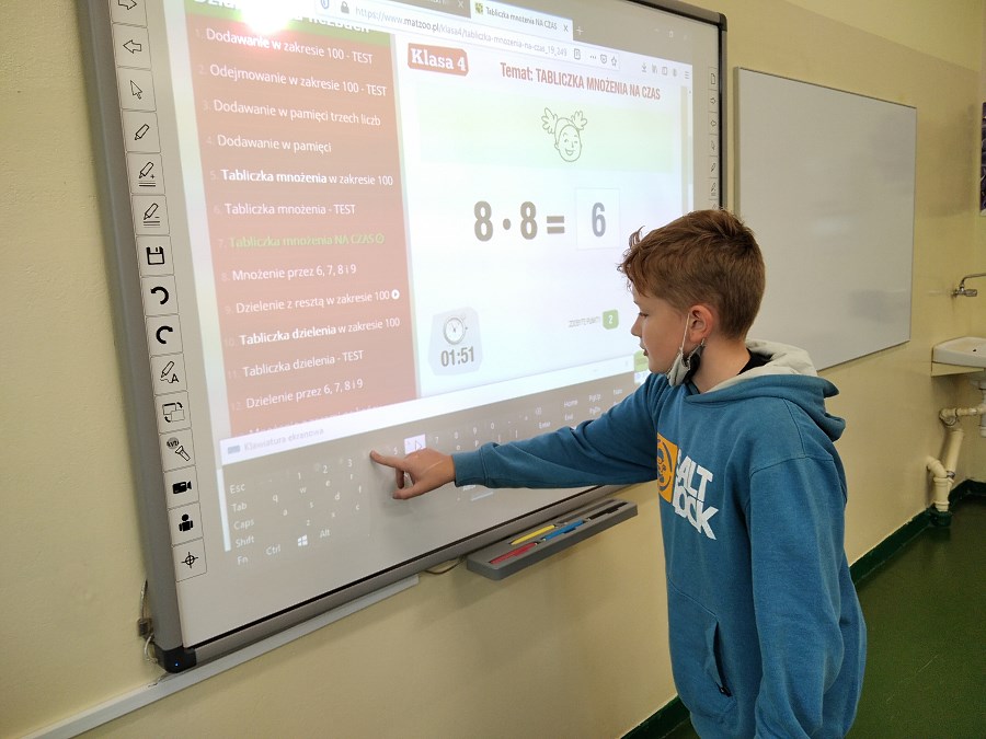 Tego dnia także podczas lekcji matematyki, uczniowie mieli okazję zmierzyć się z różnymi zadaniami, rebusami, krzyżówkami, zagadkami związanymi z tabliczką mnożenia. Wykonywali plakaty, gazetki. Niektórzy uczniowie - korzystając z tablicy interaktywnej – zmagali się z tabliczką mnożenia „na czas” – trzeba przyznać, że niektórych wychodziło to bardzo dobrze. Uczniowie klasy 4 wysłuchali piosenki oraz obejrzeli film dotyczący nauki tabliczki mnożenia „na palcach”.