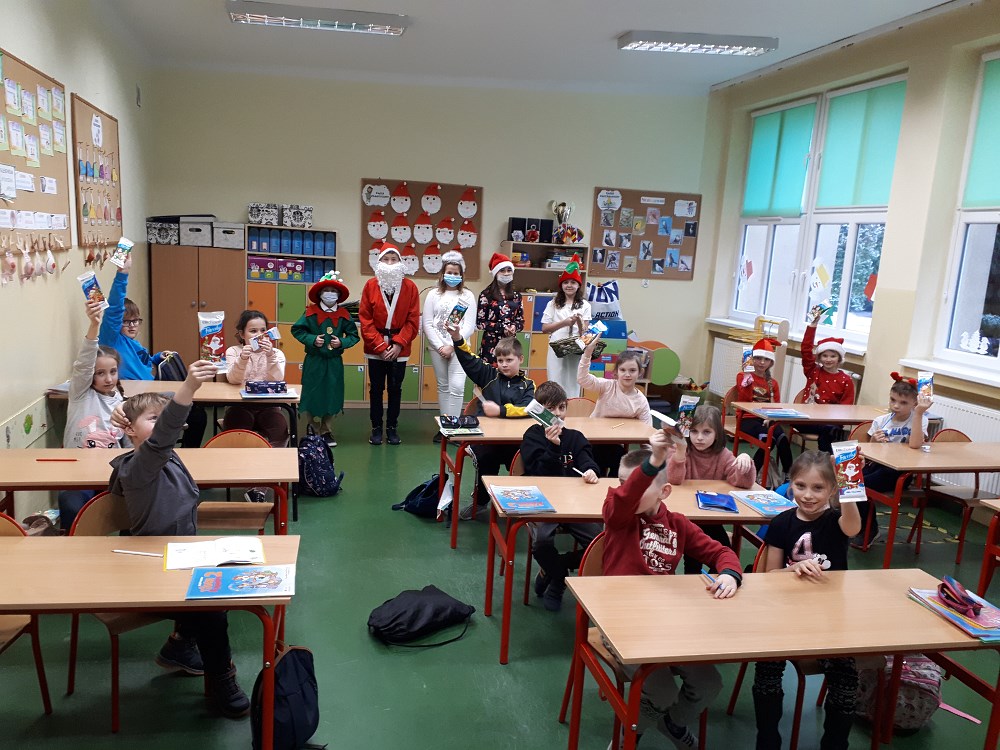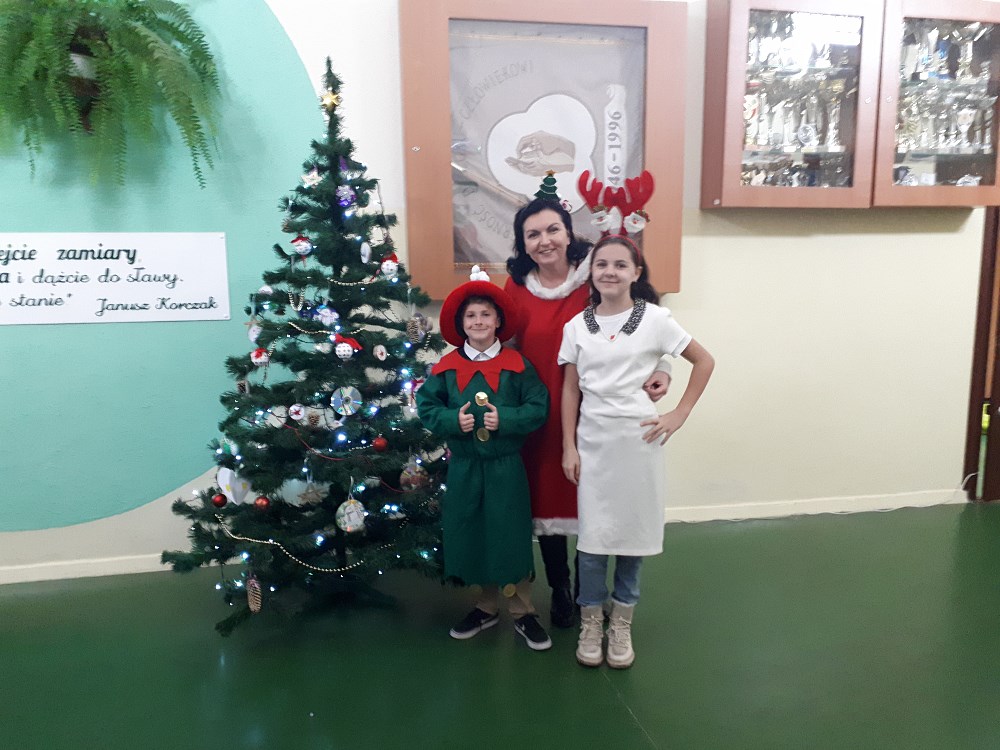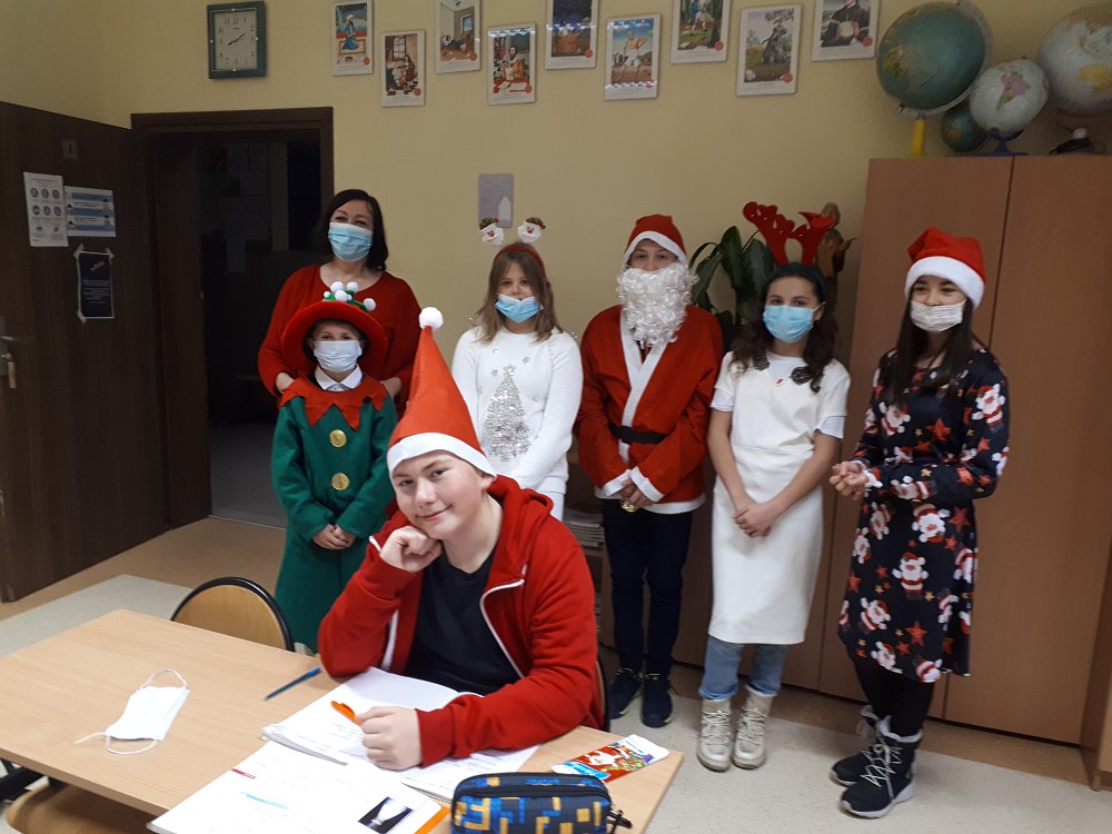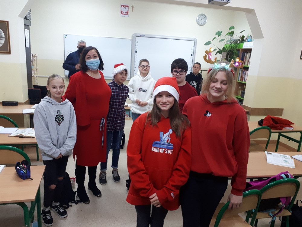 Orszak św. Mikołaja wraz z dyrektor szkoły – Beatą Jankiewicz odwiedził uczniów w klasach, a Śnieżynki i Mikołajki wręczyły im słodki poczęstunek. Uczniowie oraz niektórzy nauczyciele także przyłączyli się do zabawy, ubierając wyjątkowe przebrania.