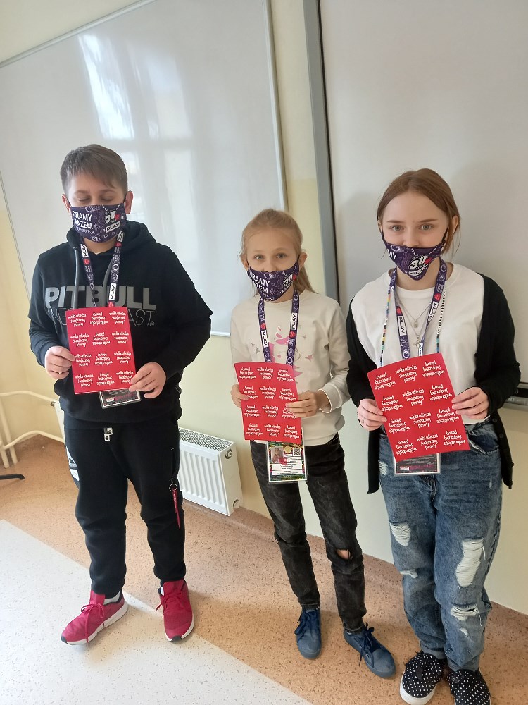 Tym razem Wolontariuszami byli nasi uczniowie: Anna Kowalczyk, Łucja Kołodziej, Patryk Mac, Przemysław Januś, Patrycja Kowalczyk, Aleksandra Hućko, Julia Wiraszka, Julia Adamczyk i Kornelia Adamczyk.