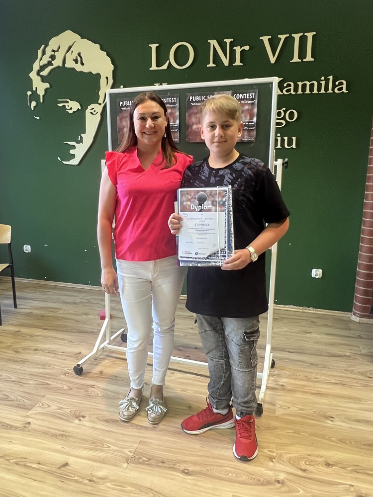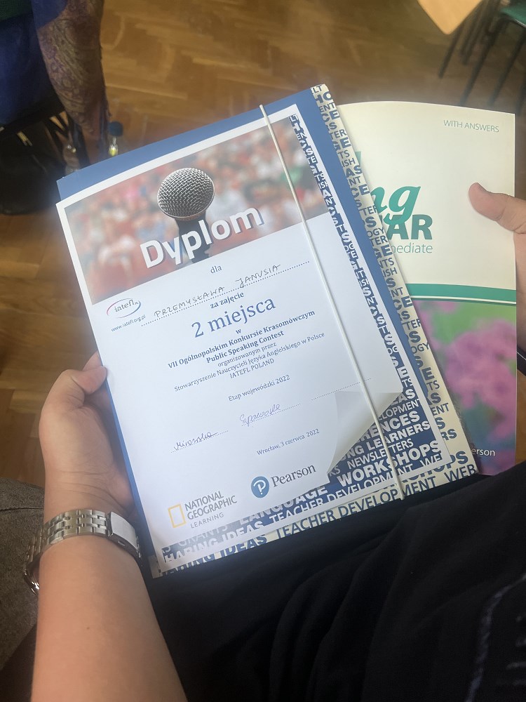 w VII Ogólnopolskim Konkursie Krasomówczym „Public Speaking Contest” pt. „Attitude is a little thing that makes a big difference” i zajął w nim II miejsce.