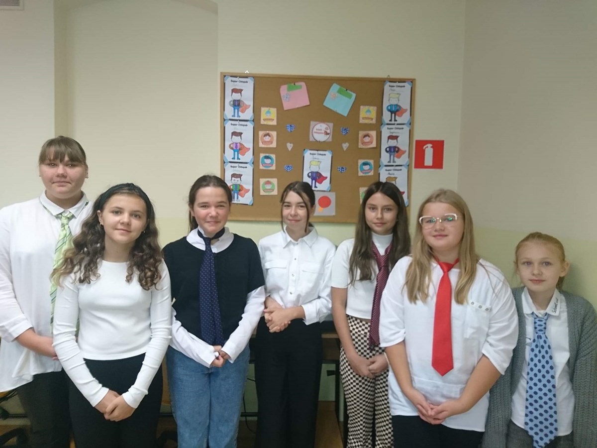 Klasy ozdobiły gazetki tematyczne, a w zadaniu pt. „Elegancja ponad wszystko” dziewczęta swoimi „męskimi” elementami stroju bawią się modą. Zawsze miło jest jak dołączają do nich Panowie w eleganckich koszulach i garniturach. Od razu atmosfera robi się wyjątkowa!