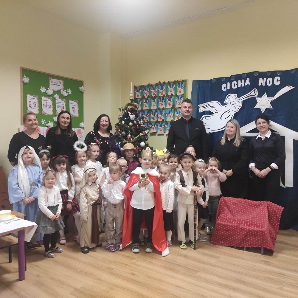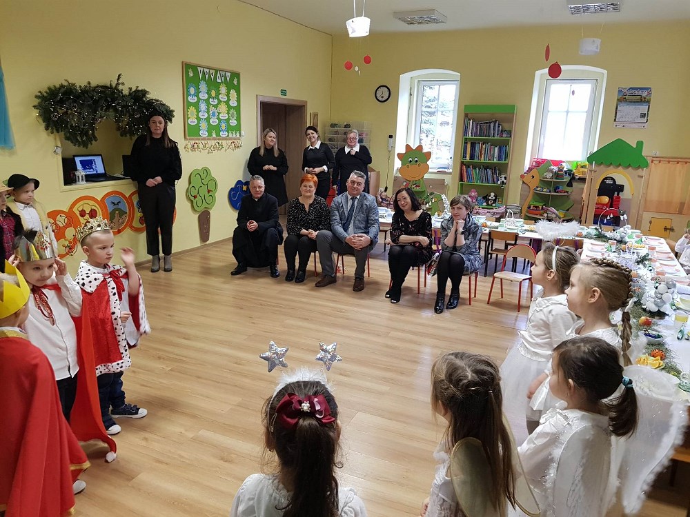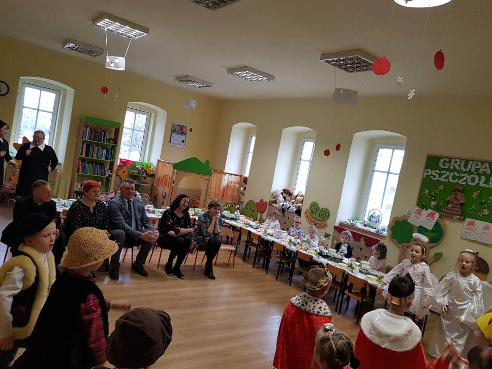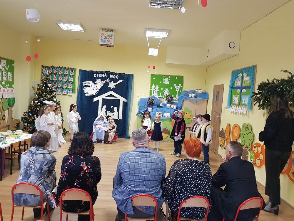 Dzieci, przygotowane przez swoje wychowawczynie, przedstawiły Jasełka, do których bardzo pilnie się przygotowywały. Mali aktorzy, we wspaniałych strojach, prezentowali się doskonale na tle bożonarodzeniowych dekoracji. Po przedstawieniu, dyrektor szkoły Beata Jankiewicz, złożyła dzieciom i nauczycielom i wszystkim obecnym bożonarodzeniowe życzenia. Był także czas na tradycyjne połamanie się opłatkiem.