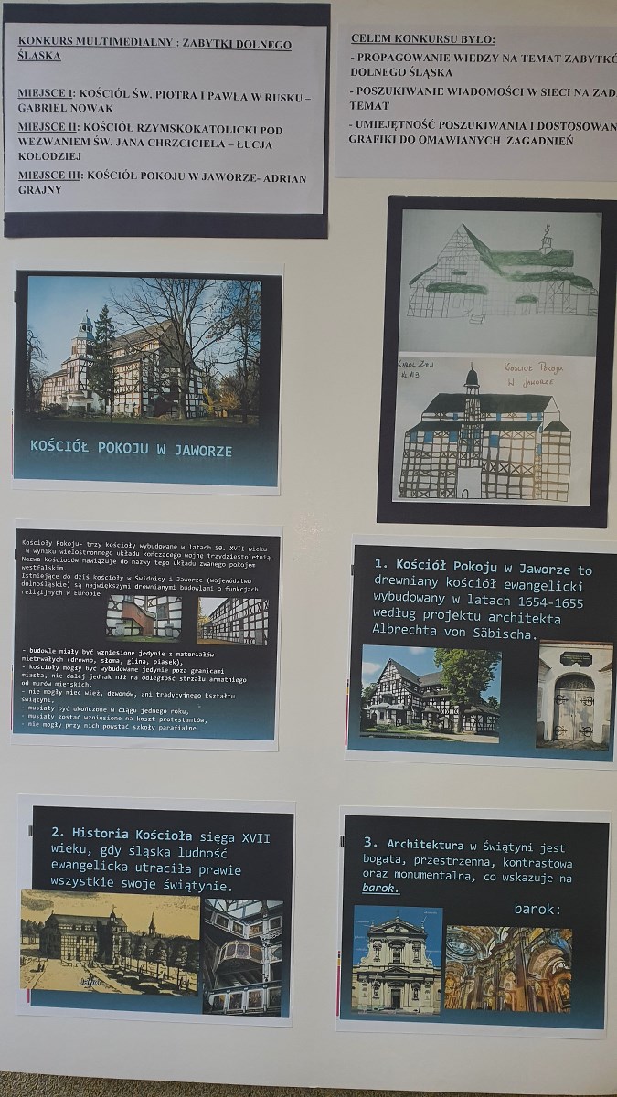 Celem konkursu było: propagowanie wiedzy na temat zabytków Dolnego Śląska, poszukiwanie wiadomości w Internecie na zadany temat, umiejętność poszukiwania i dostosowania grafiki do omawianych zagadnień i posługiwanie się technologiami informatycznymi