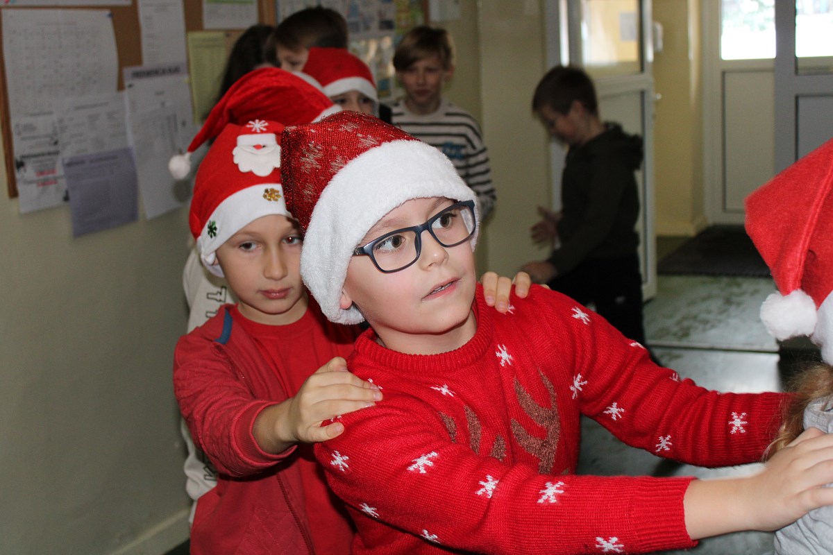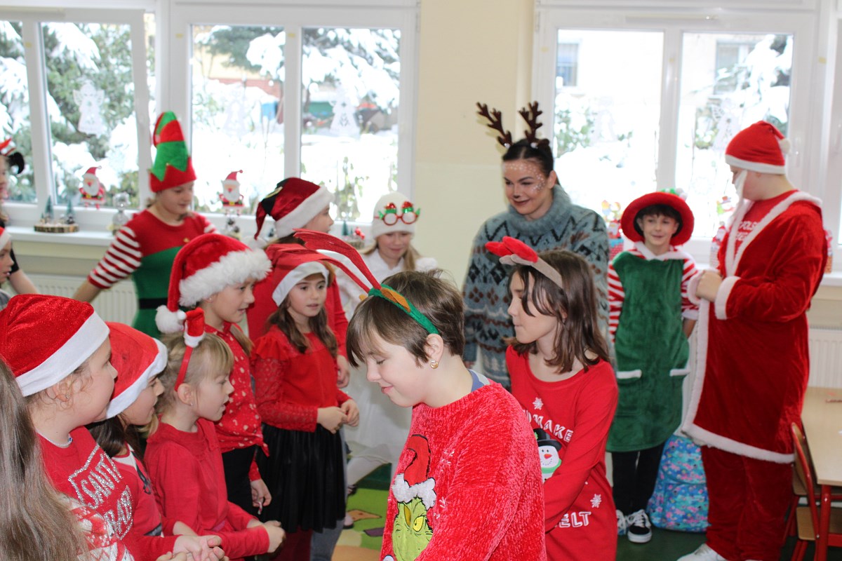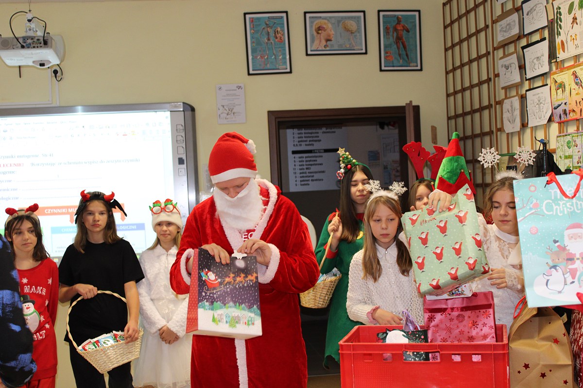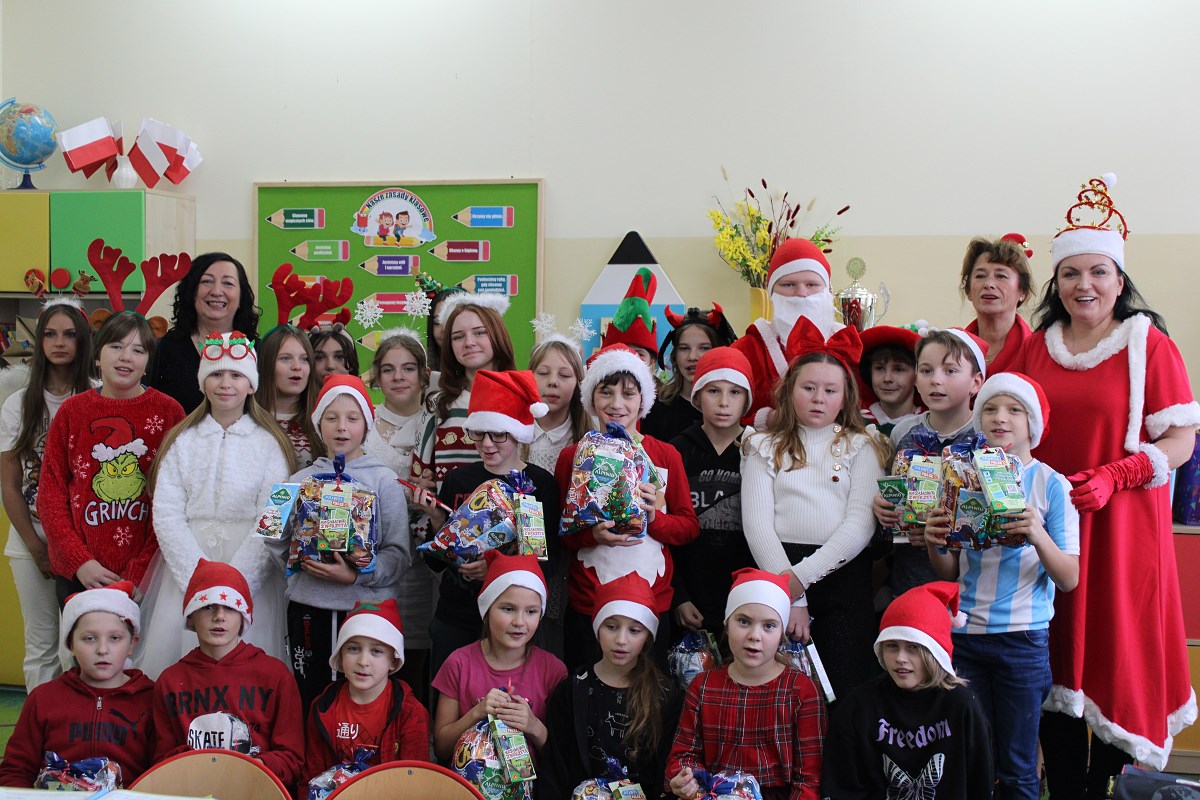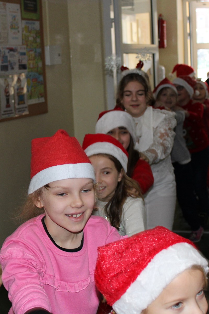 Orszak odwiedził uczniów z klas 4 – 8 rozdając im prezenty i czekolady. Było wesoło, radośnie i głośno, bo grała świąteczna muzyka.