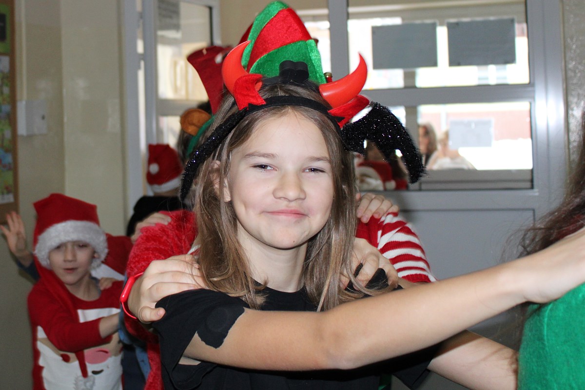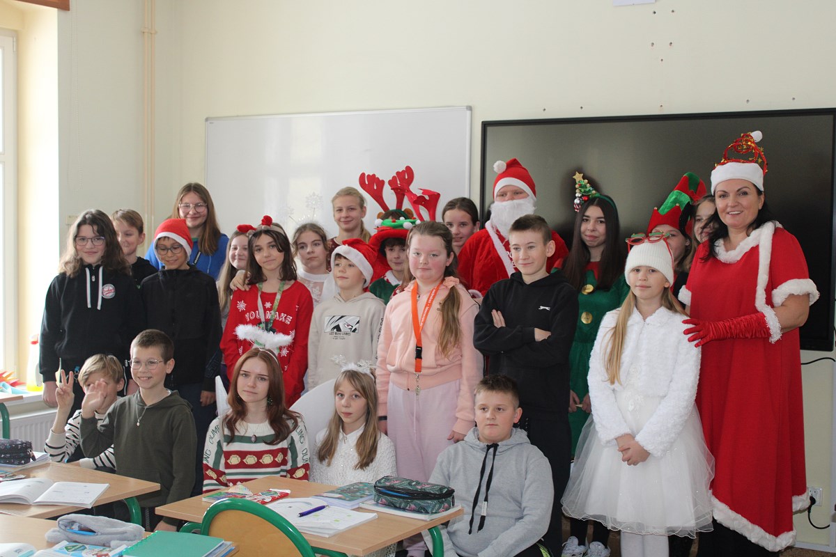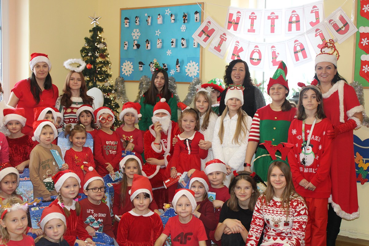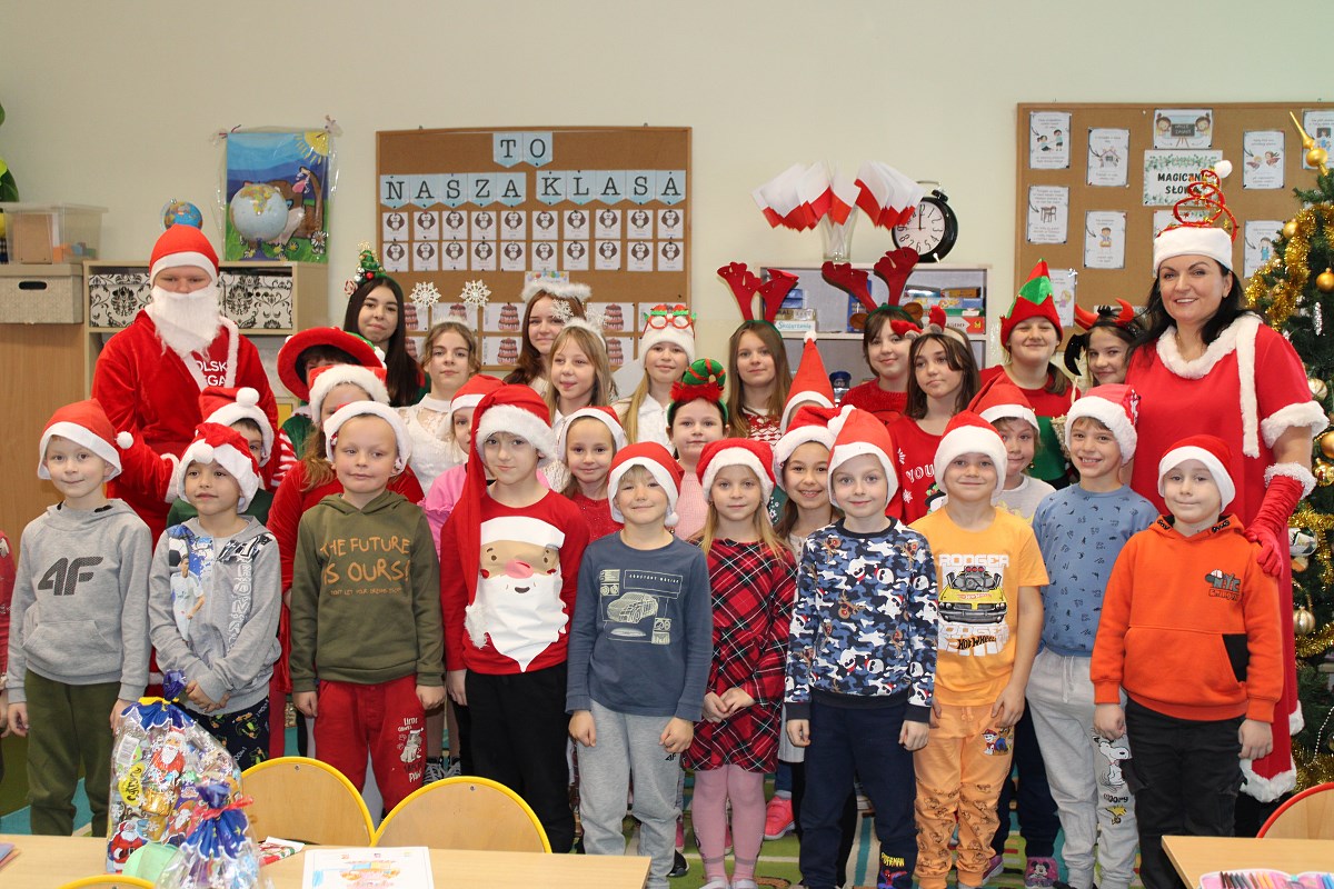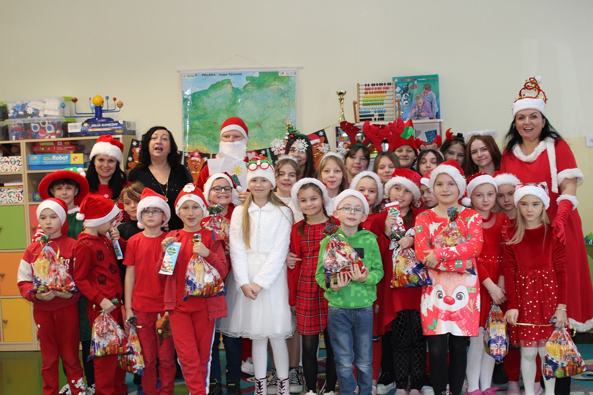 Orszak odwiedził uczniów z klas 4 – 8 rozdając im prezenty i czekolady. Było wesoło, radośnie i głośno, bo grała świąteczna muzyka.