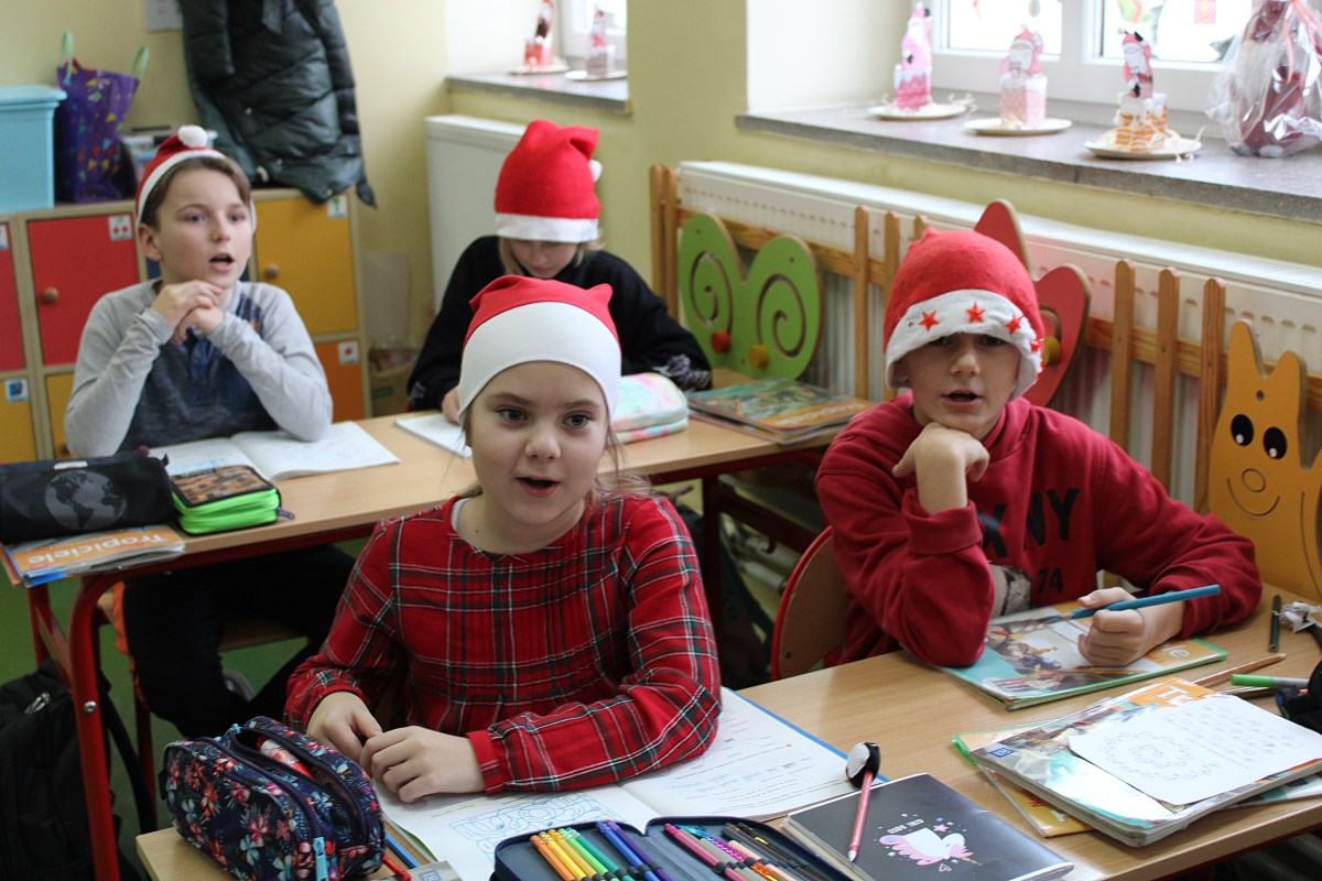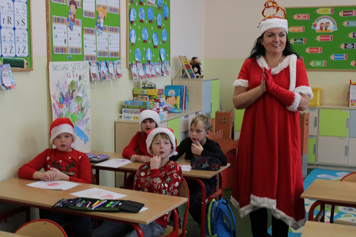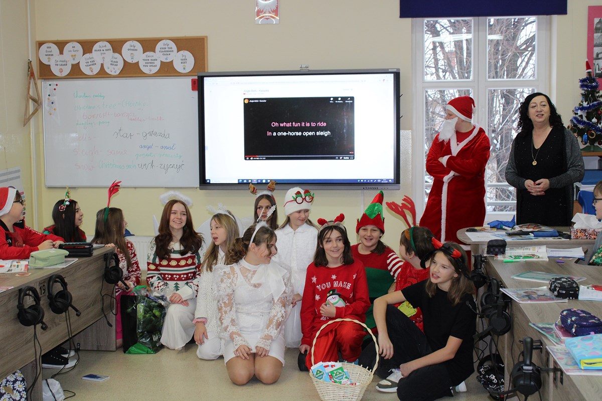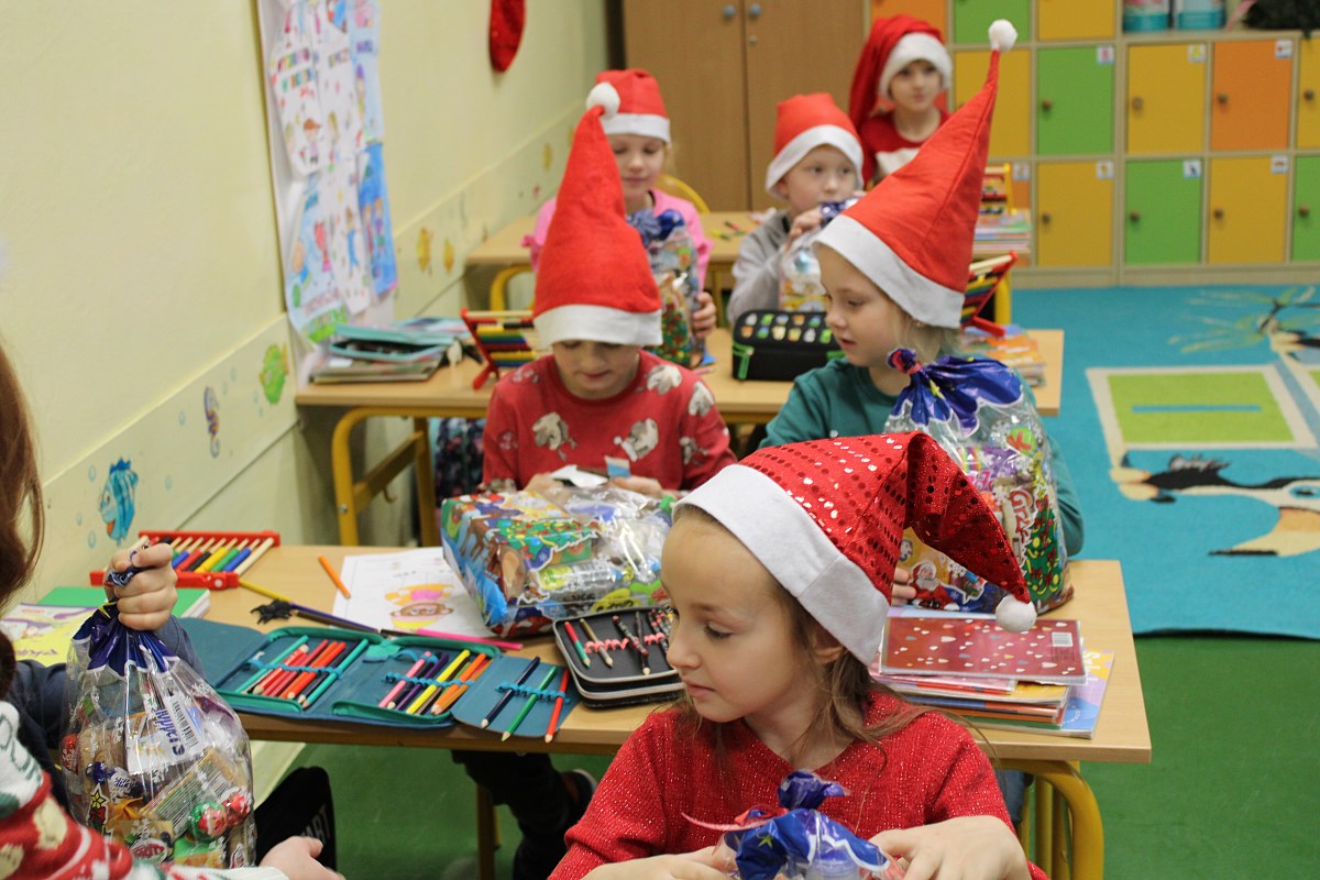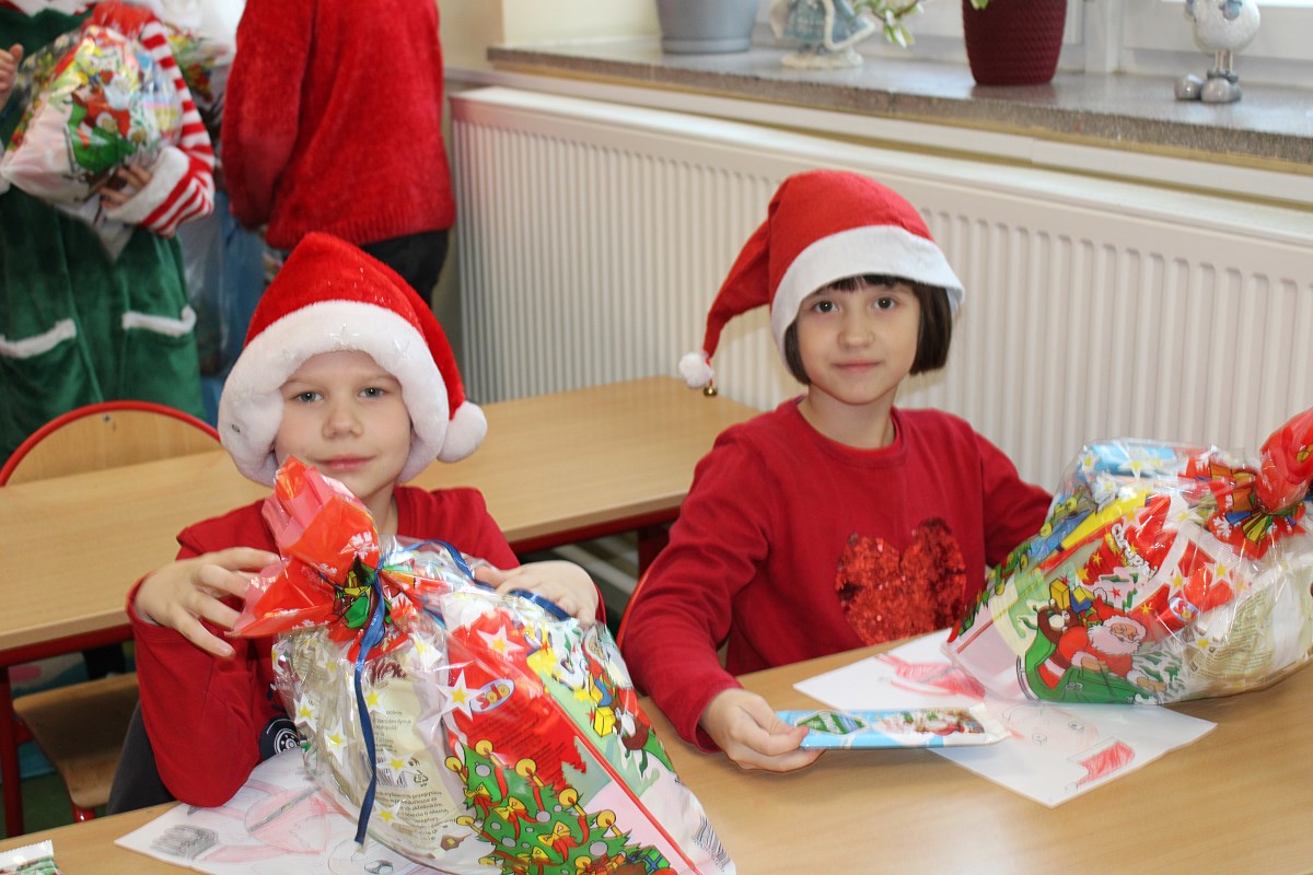 Orszak odwiedził uczniów z klas 4 – 8 rozdając im prezenty i czekolady. Było wesoło, radośnie i głośno, bo grała świąteczna muzyka.