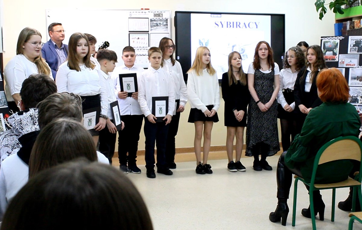 Uczniowie naszej szkoły od kilku lat przygotowują z tej okazji uroczysty apel, który dla młodego pokolenia jest swoistą lekcją historii. W tym roku uczniowie klasy 7 mówili o cierpieniu, głodzie, nieludzkim traktowaniu, chorobach i pracy ponad siły tysięcy obywateli na zesłaniu. Słowa wierszy Sybiraków i fragmenty wspomnień mocno wybrzmiewały na tle muzyki poważnej i przy zdjęciach prezentacji o losach zesłanych na „nieludzką ziemię”. Słowom z uwagą przysłuchiwali się uczniowie klasy 6 i 8 .