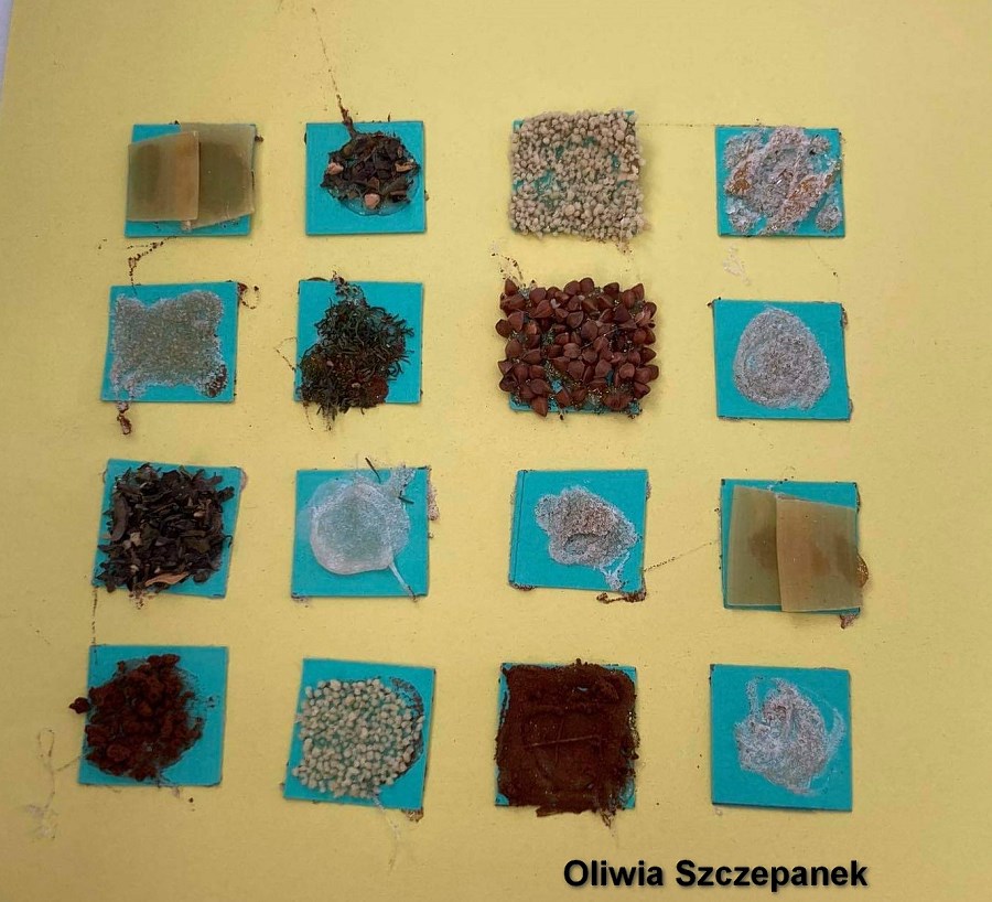 Dlaczego „calineczki”? Ponieważ kwadraciki w pracach były calowe (2,50 cm x 2,50 cm) i stąd ich nazwa. Tak naprawdę, prace były praktyczną formą zajęć teoretycznych o fakturze w sztuce, także tej użytkowej.