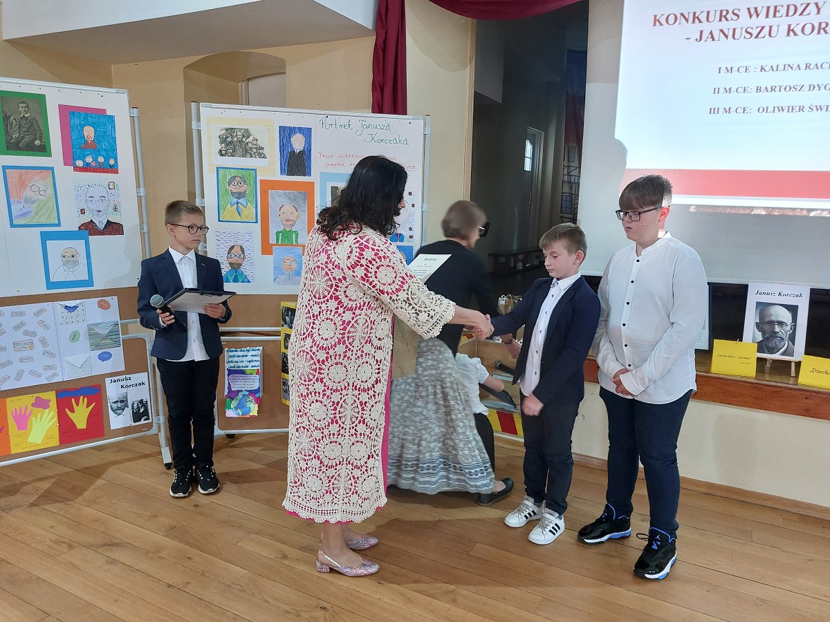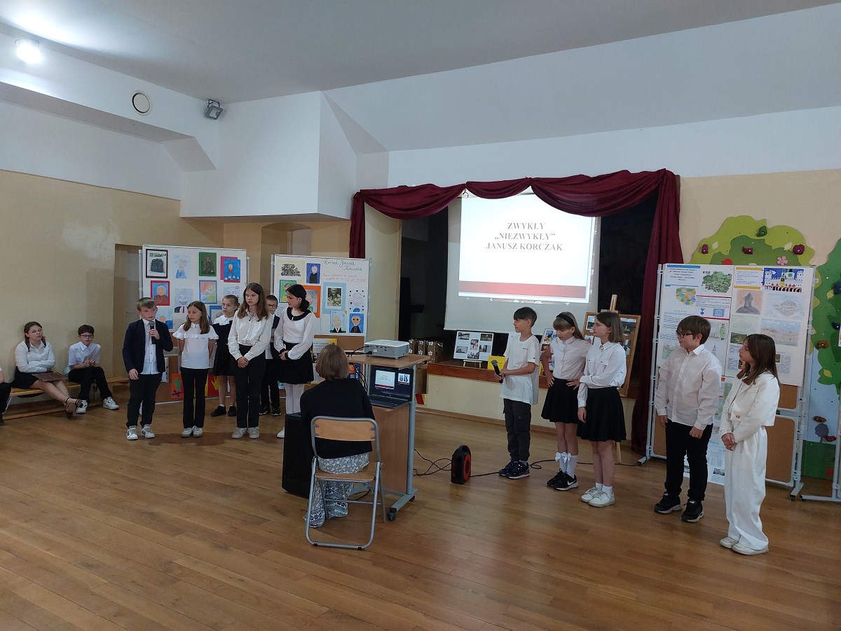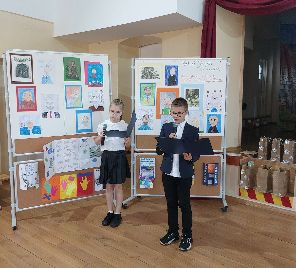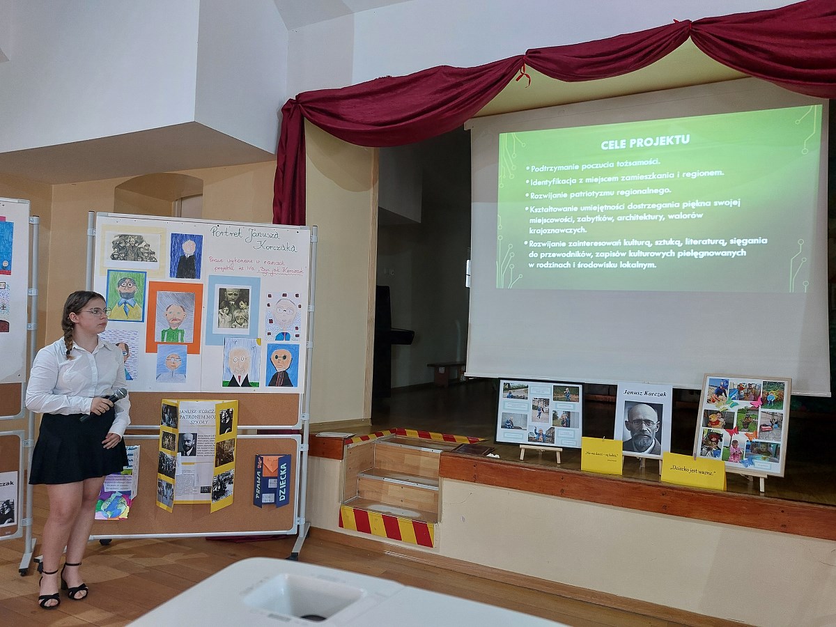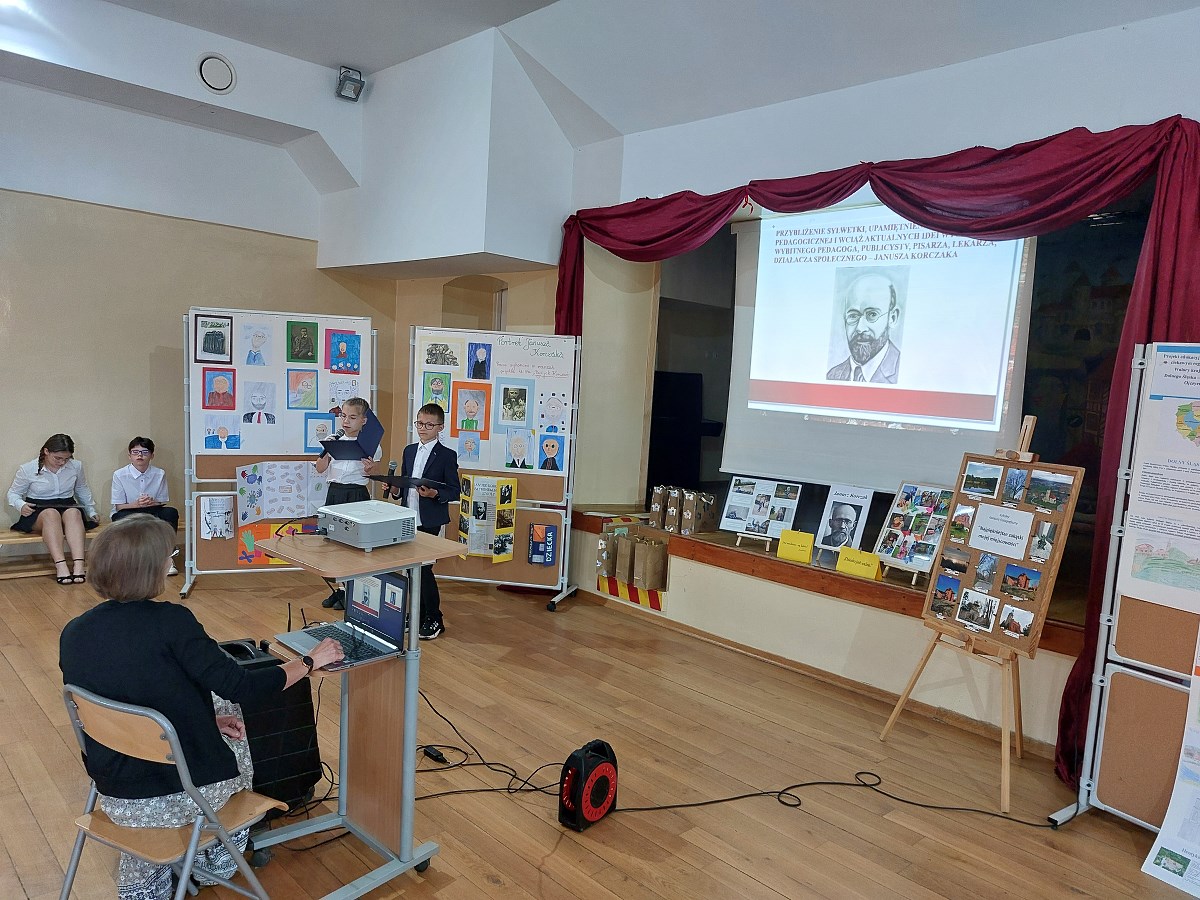 Następnie wychowawczyni klasy 4a – Sylwia Wilczak - przedstawiła prezentację klasy, w której zamieszczone były konkretne rezultaty projektu o patronie ph. „Być jak Korczak”. O projekcie opowiadali przedstawiciele klasy – Kalina Rachwał i Sebastian Brańka.