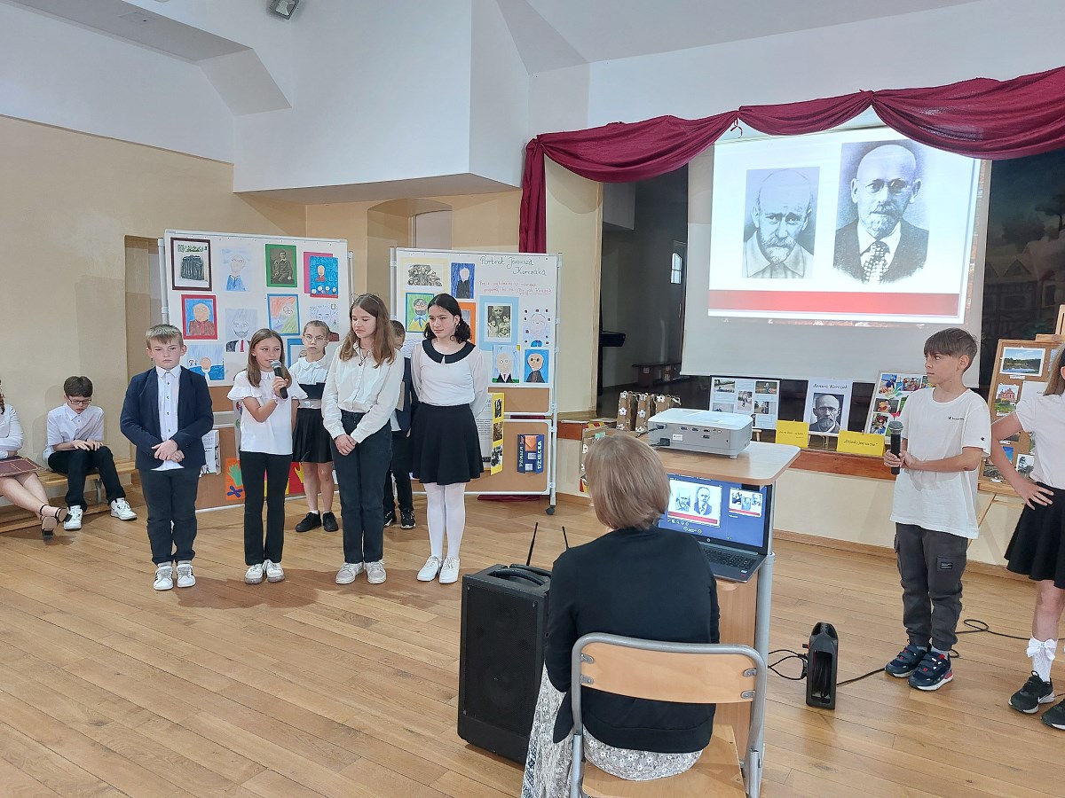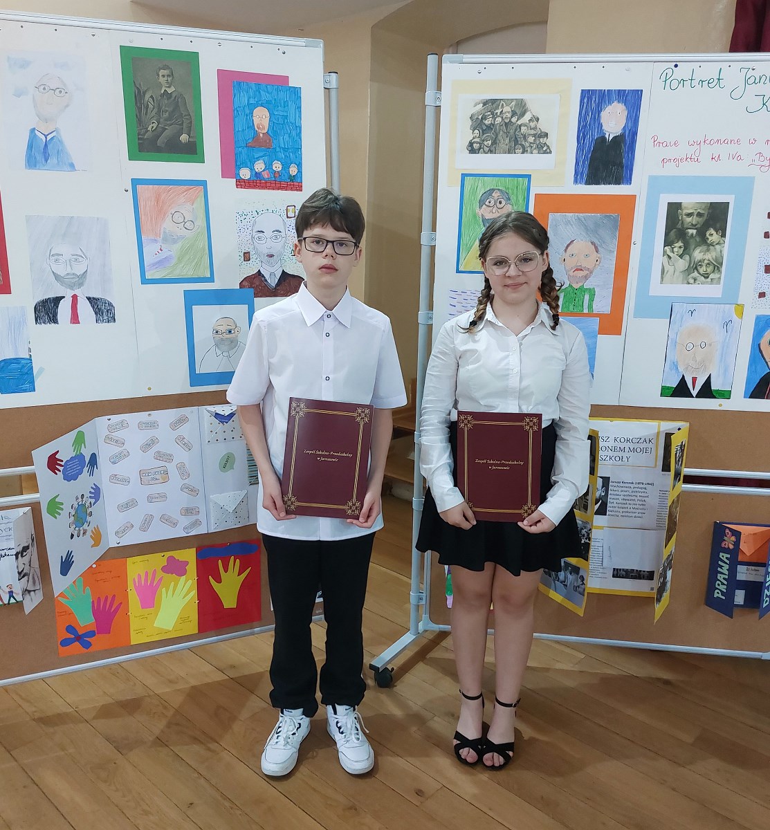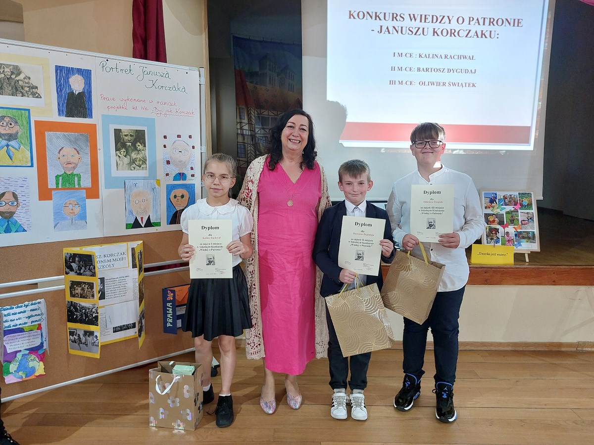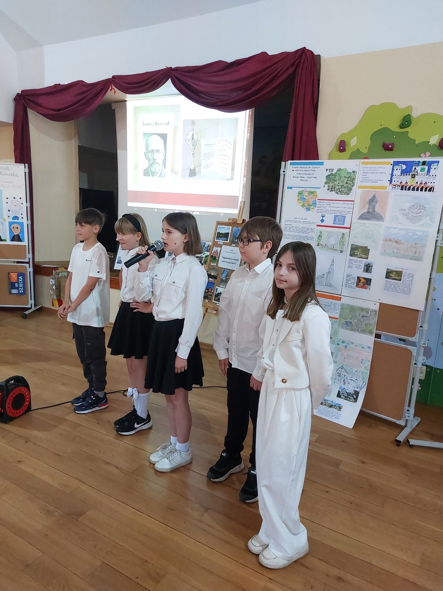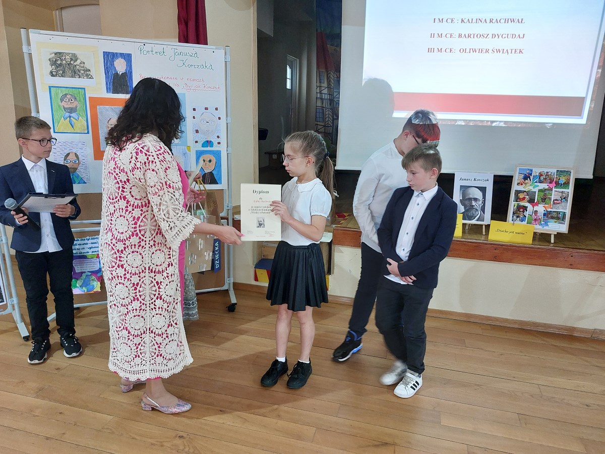 Następnie wychowawczyni klasy 4a – Sylwia Wilczak - przedstawiła prezentację klasy, w której zamieszczone były konkretne rezultaty projektu o patronie ph. „Być jak Korczak”. O projekcie opowiadali przedstawiciele klasy – Kalina Rachwał i Sebastian Brańka.