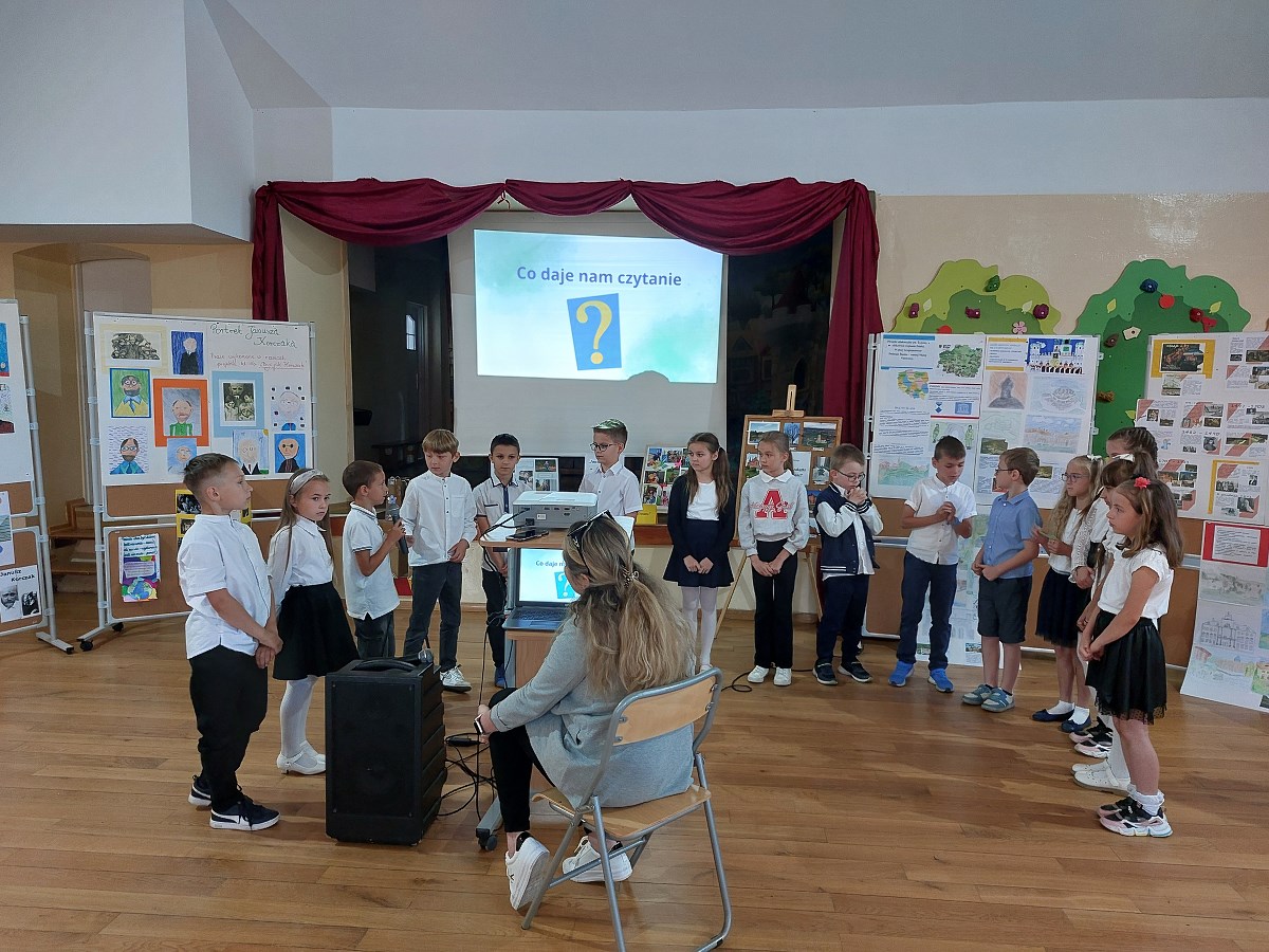 Najpierw swoją prezentację multimedialną przedstawiły wychowawczynie klas drugich – Marzena Białek i Dominika Pieszko, które wraz z dziećmi zrealizowały projekt czytelniczy ph. „Czytanie na dywanie”. Dzieci wystąpiły także przed publicznością.