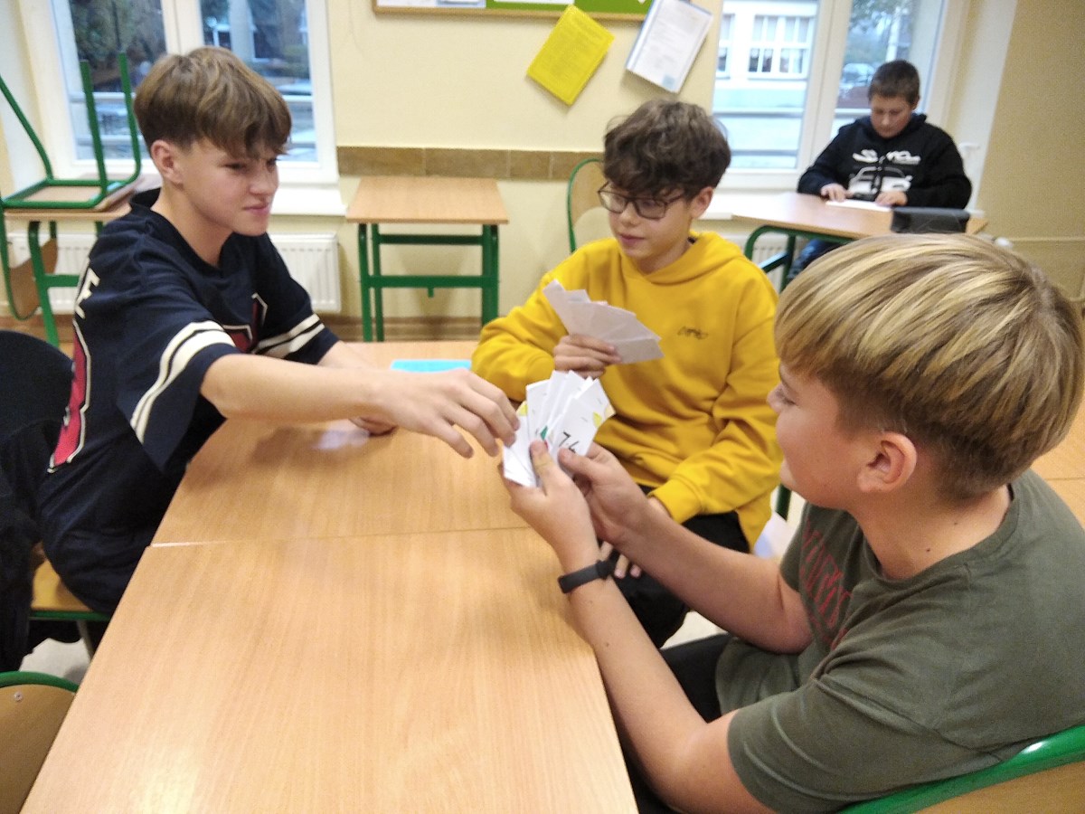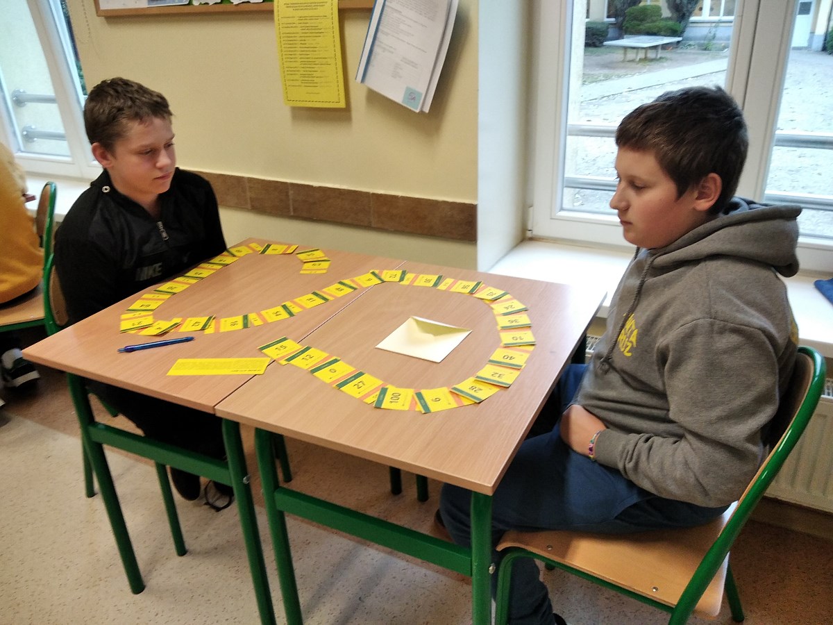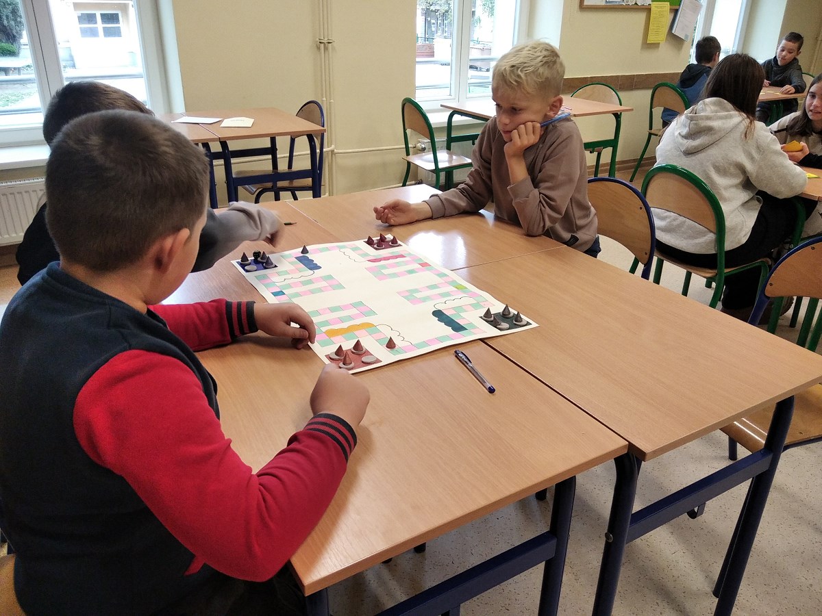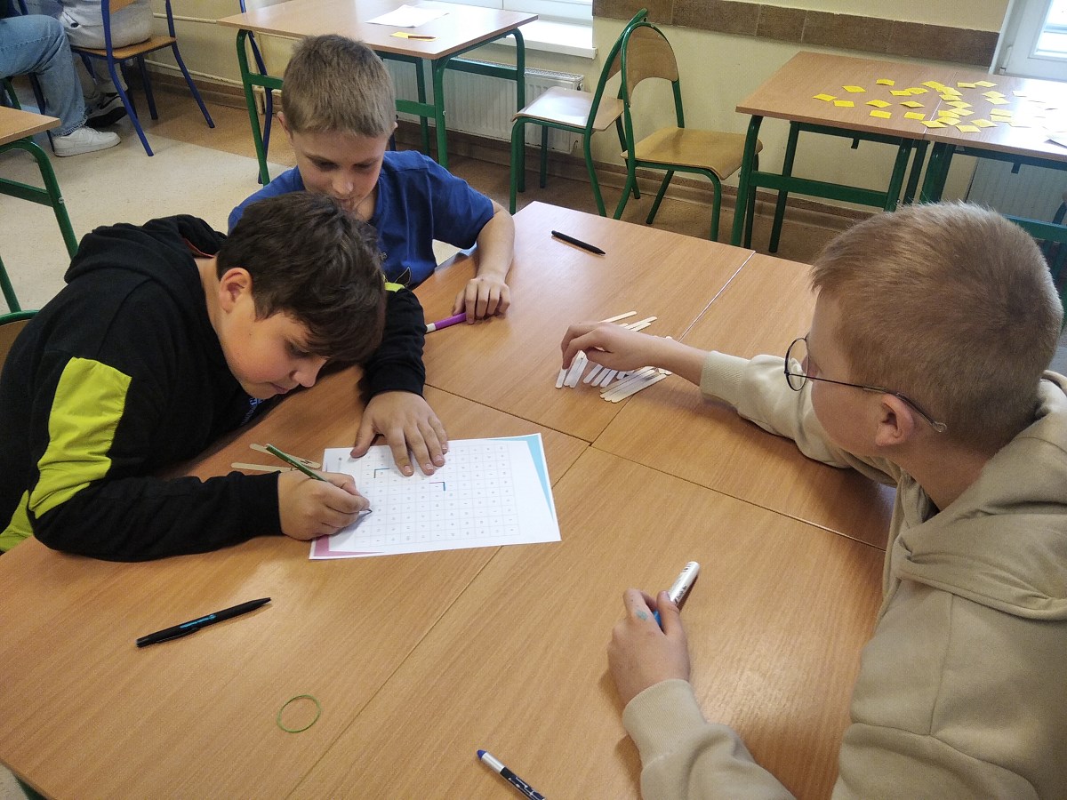 Ponadto podczas zajęć matematycznych wprowadzono elementy gry i rywalizacji. Wszyscy uczniowie mieli okazję do zaprezentowania swoich znajomości „tabliczkowych” podczas gier. Uczniowie podzieleni na mniejsze grupy zmagali się z grami typu: „Piotruś Pan matematyczny”, „Matematyczne memory”, „ Ja mam, kto ma”, „Kabum”, „ Zamykanie kwadratów”, a także budowali „wieżę” z kubeczków. Wszyscy chętnie próbowali swoich sił w różnych grach wiedząc, że większość z nich została przygotowana przez uczniów klasy siódmej.