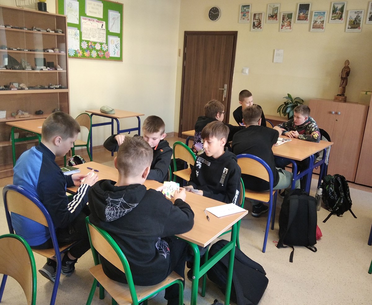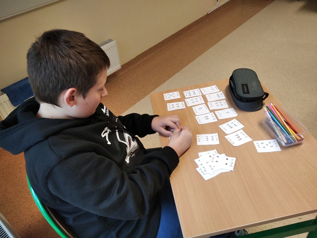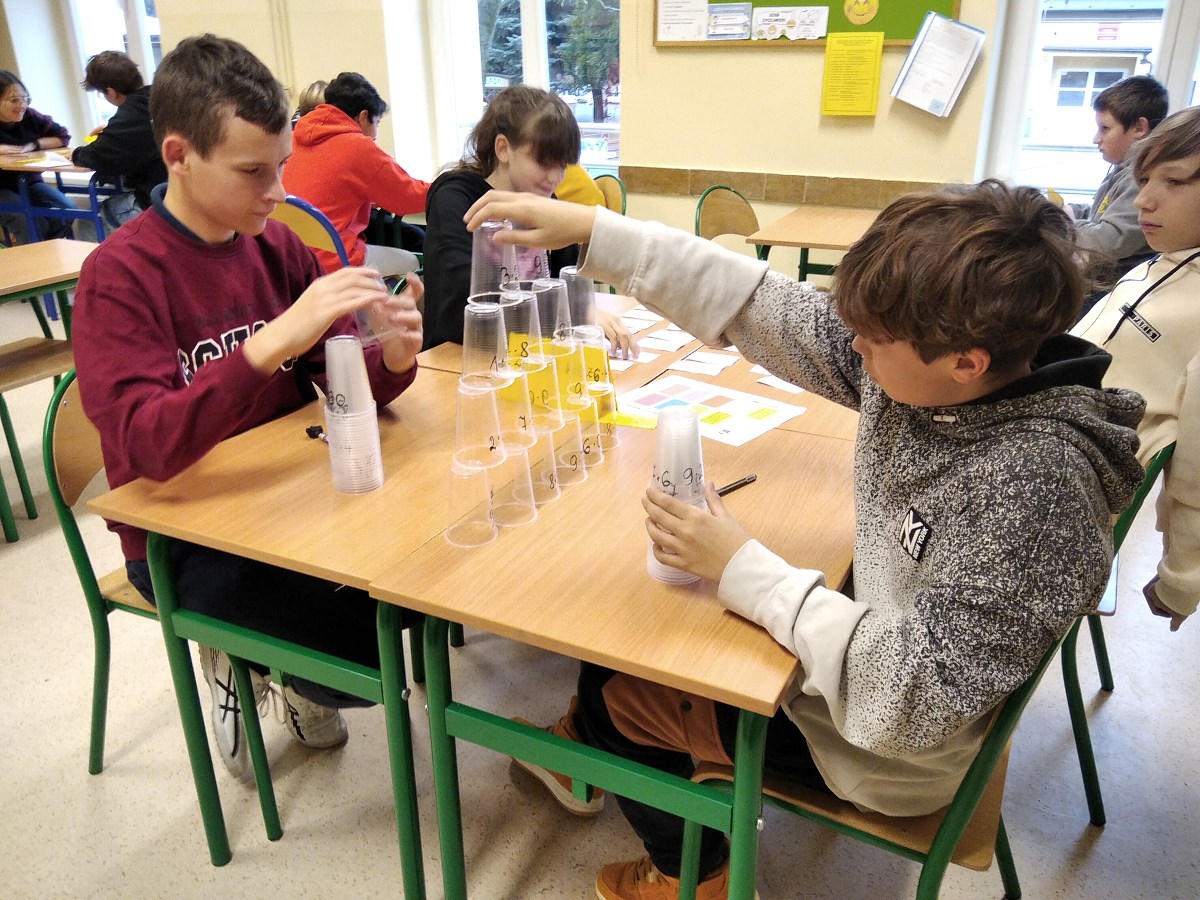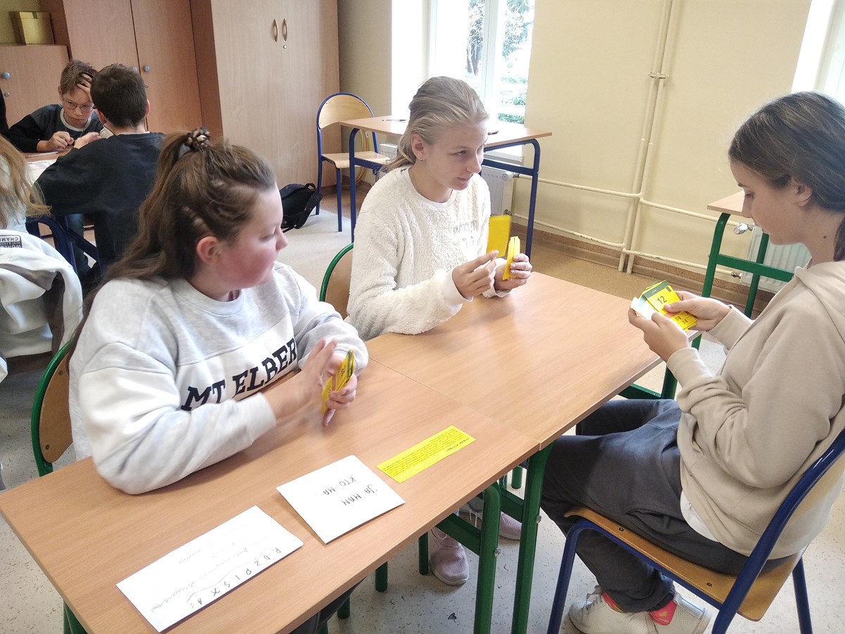 Ponadto podczas zajęć matematycznych wprowadzono elementy gry i rywalizacji. Wszyscy uczniowie mieli okazję do zaprezentowania swoich znajomości „tabliczkowych” podczas gier. Uczniowie podzieleni na mniejsze grupy zmagali się z grami typu: „Piotruś Pan matematyczny”, „Matematyczne memory”, „ Ja mam, kto ma”, „Kabum”, „ Zamykanie kwadratów”, a także budowali „wieżę” z kubeczków. Wszyscy chętnie próbowali swoich sił w różnych grach wiedząc, że większość z nich została przygotowana przez uczniów klasy siódmej.