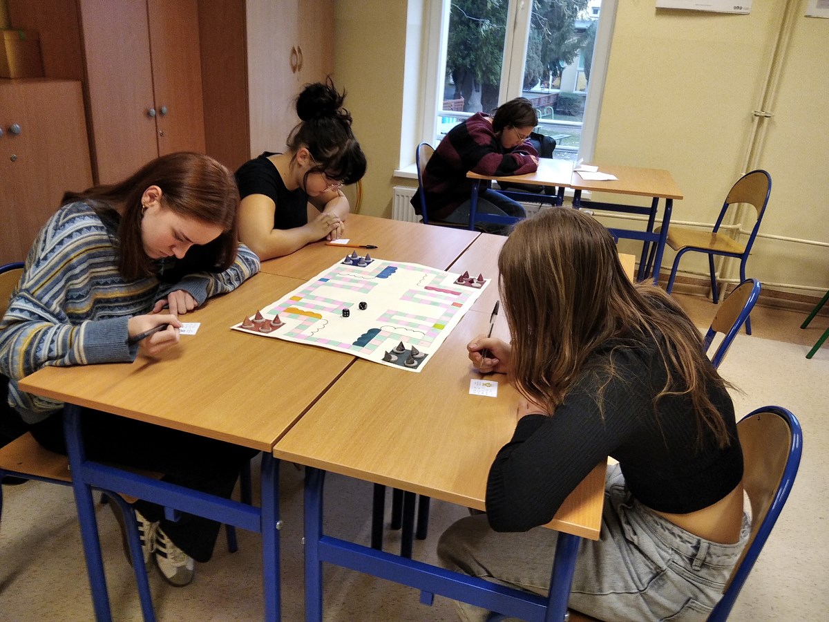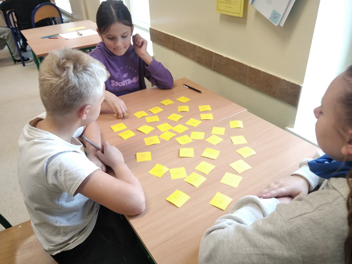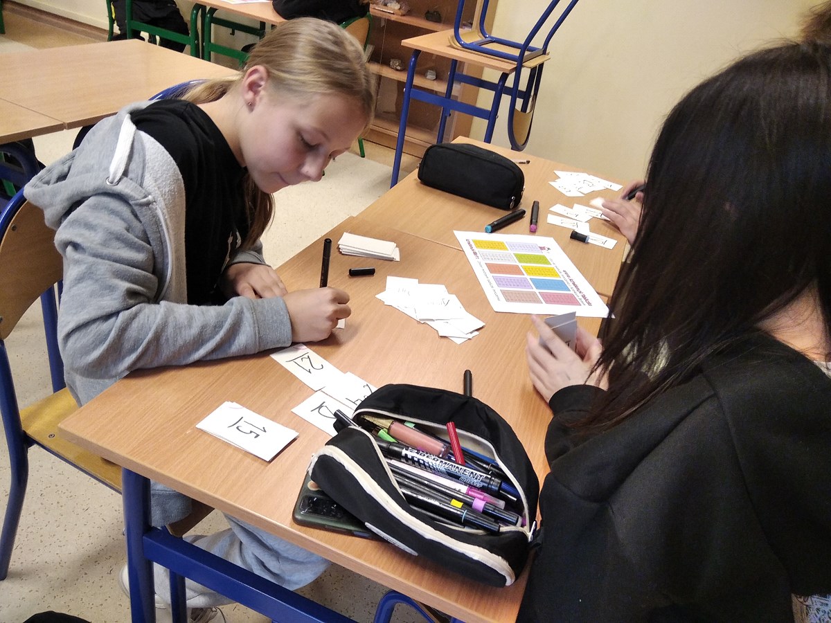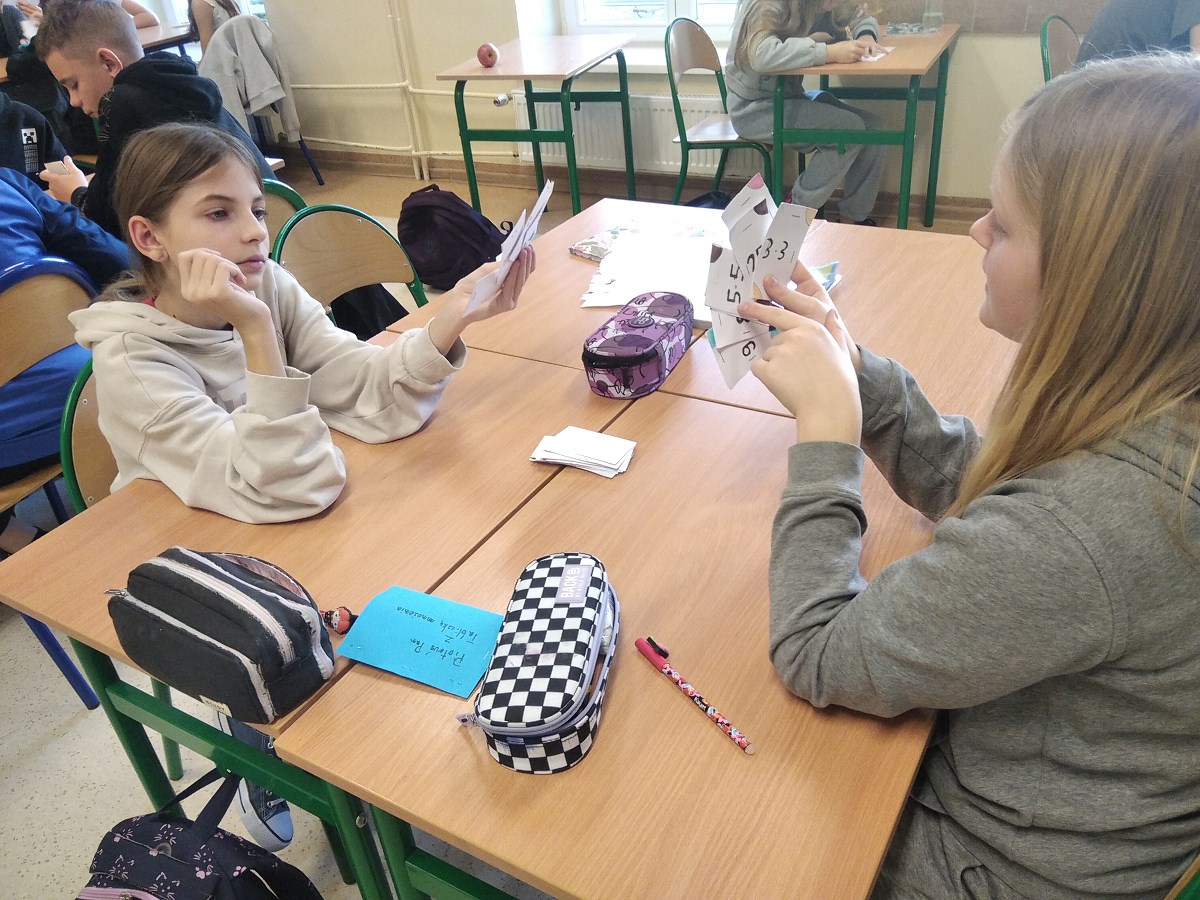 Ponadto podczas zajęć matematycznych wprowadzono elementy gry i rywalizacji. Wszyscy uczniowie mieli okazję do zaprezentowania swoich znajomości „tabliczkowych” podczas gier. Uczniowie podzieleni na mniejsze grupy zmagali się z grami typu: „Piotruś Pan matematyczny”, „Matematyczne memory”, „ Ja mam, kto ma”, „Kabum”, „ Zamykanie kwadratów”, a także budowali „wieżę” z kubeczków. Wszyscy chętnie próbowali swoich sił w różnych grach wiedząc, że większość z nich została przygotowana przez uczniów klasy siódmej.