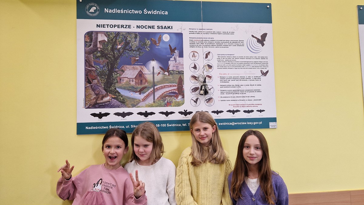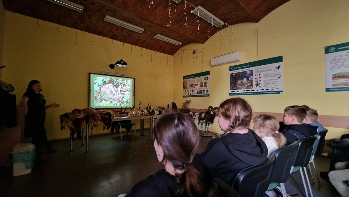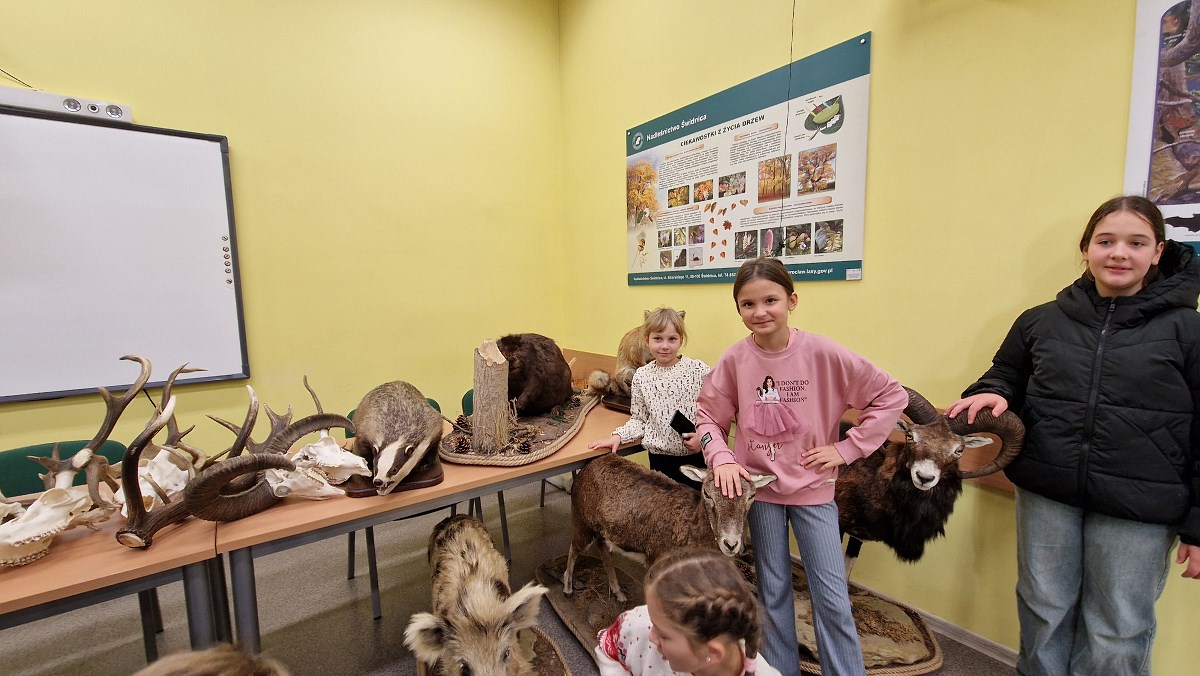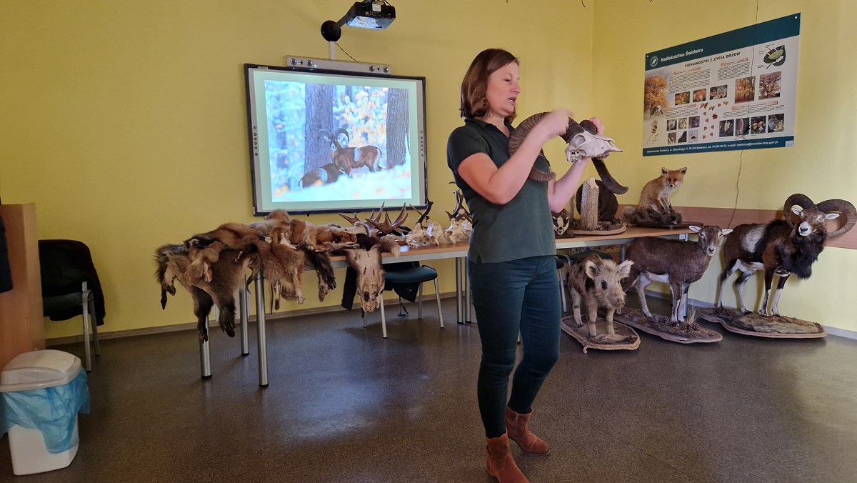 Dzieci miały możliwość aktywnie włączyć się do prezentacji, dzieląc się własną wiedzą na temat tych niewielkich, latających ssaków. Poznały zasoby przyrodnicze salki dydaktycznej, w której można było przyjrzeć się porożom różnych gatunków jeleniowatych, ślimom muflona i skórom dzikich leśnych zwierząt. A to wszystko pod czujnym okiem i z komentarzem pani Moniki Drozdowskiej- starszej specjalistki ds. ochrony przyrody i edukacji leśnej.