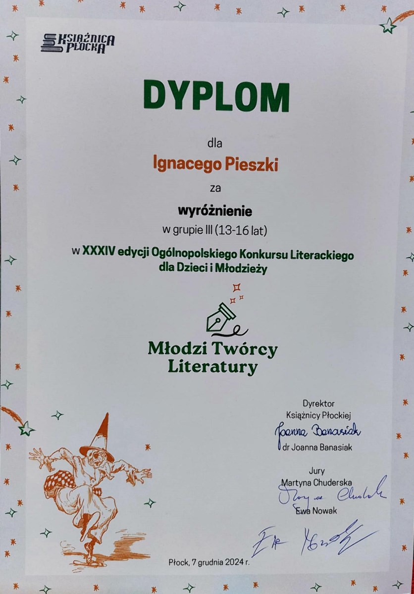W sobotę - 7 grudnia 2024 r. - w Płocku odbyła się uroczystość wręczenia nagród laureatom XXXIV Ogólnopolskiego Konkursu Młodzi Twórcy Literatury. Wśród wyróżnionych byli uczniowie z Zespołu Szkolno – Przedszkolnego w Jaroszowie – Kalina Rachwał i Ignacy Pieszko.