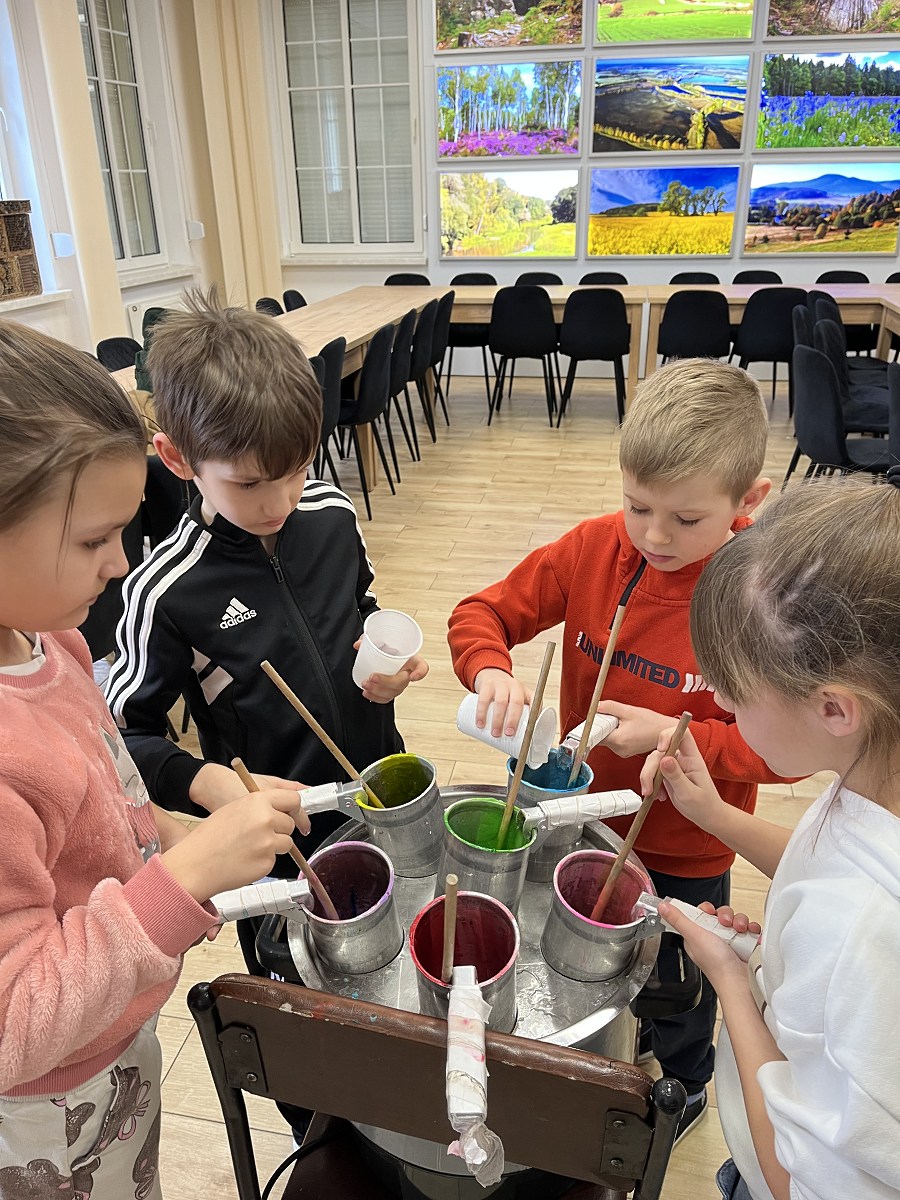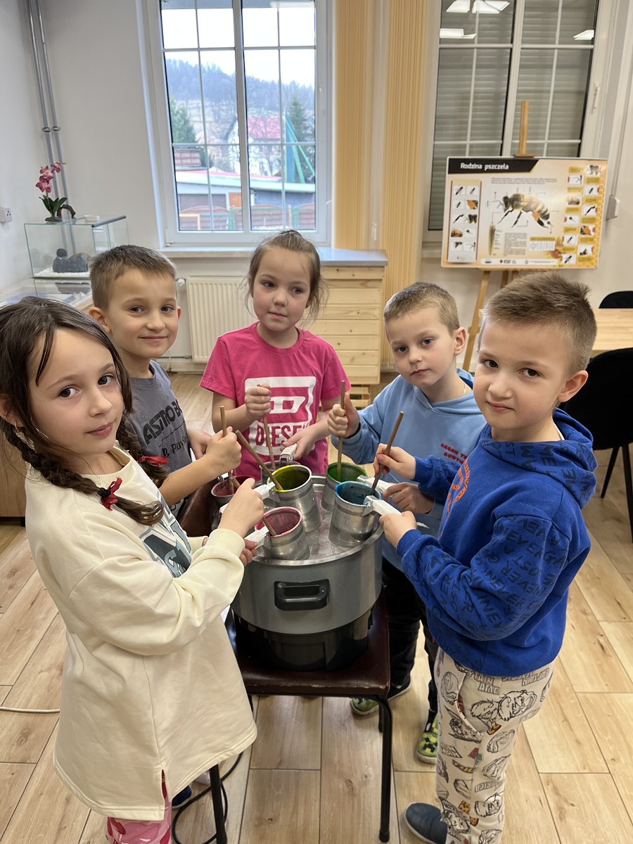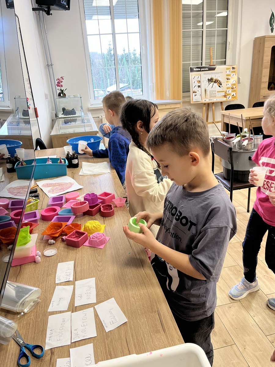 Drugą część wycieczki stanowiły warsztaty mydlarskie, podczas których dzieci miały okazję własnoręcznie wykonać pachnące mydełka. To kreatywne zajęcie sprawiło im wiele radości i pozwoliło na rozwijanie zdolności manualnych.