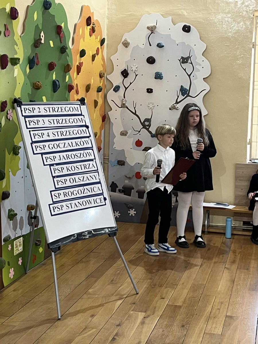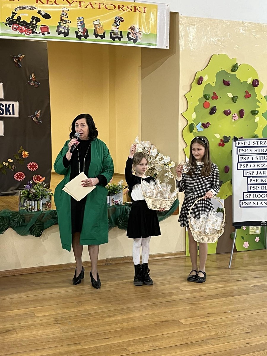 Dyrektor szkoły w Jaroszowie - Beata Jankiewicz przywitała przybyłych Gości, a wśród nich Komisję Konkursową: Marię Kierko – emerytowaną nauczycielkę jaroszowskiej szkoły, Reginę Puczkę – dyrektor Biblioteki Publicznej Miasta i Gminy Strzegom, Ewę Beretę – pracownika Strzegomskiego Centrum Kultury oraz uczestników konkursu wraz z opiekunami.