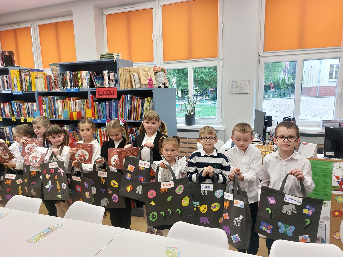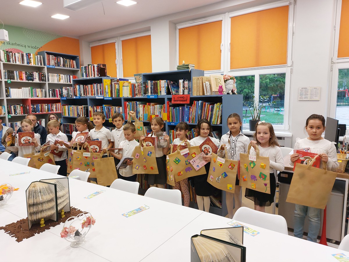 Pierwszoklasiści z obu klas pierwszych otrzymali zeszyty biblioteczne i wyjątkowe, personalizowane zakładki do książek. Listę prezentów uzupełniły także książki i wyjątkowo ozdobione torby, w których uczniowie otrzymają podręczniki do klasy drugiej oraz pamiątkowe listy dla Rodziców. Okolicznościowe przedstawienie przygotowali uczniowie z aktywu bibliotecznego, którzy przez cały rok szkolny uczęszczają na zajęcia teatralne w ramach gminnego projektu „Nowoczesna edukacja w gminie Strzegom”.