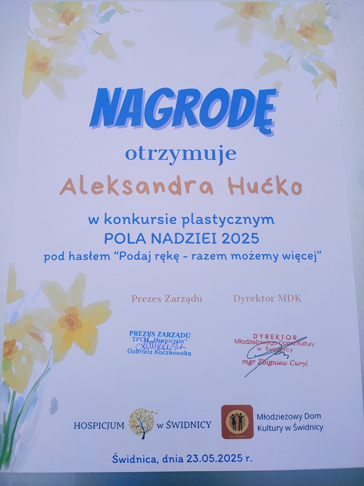 W dniu 23 maja 2025 r. siódmoklasistka z Zespołu Szkolno – Przedszkolnego w Jaroszowie Aleksandra Hućko brała udział w uroczystym podsumowaniu II Edycji Konkursu Plastycznego „POLA NADZIEI” 2025 „PODAJ RĘKĘ- RAZEM MOŻEMY WIĘCEJ.”