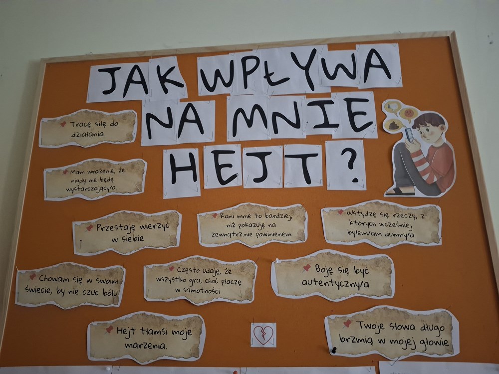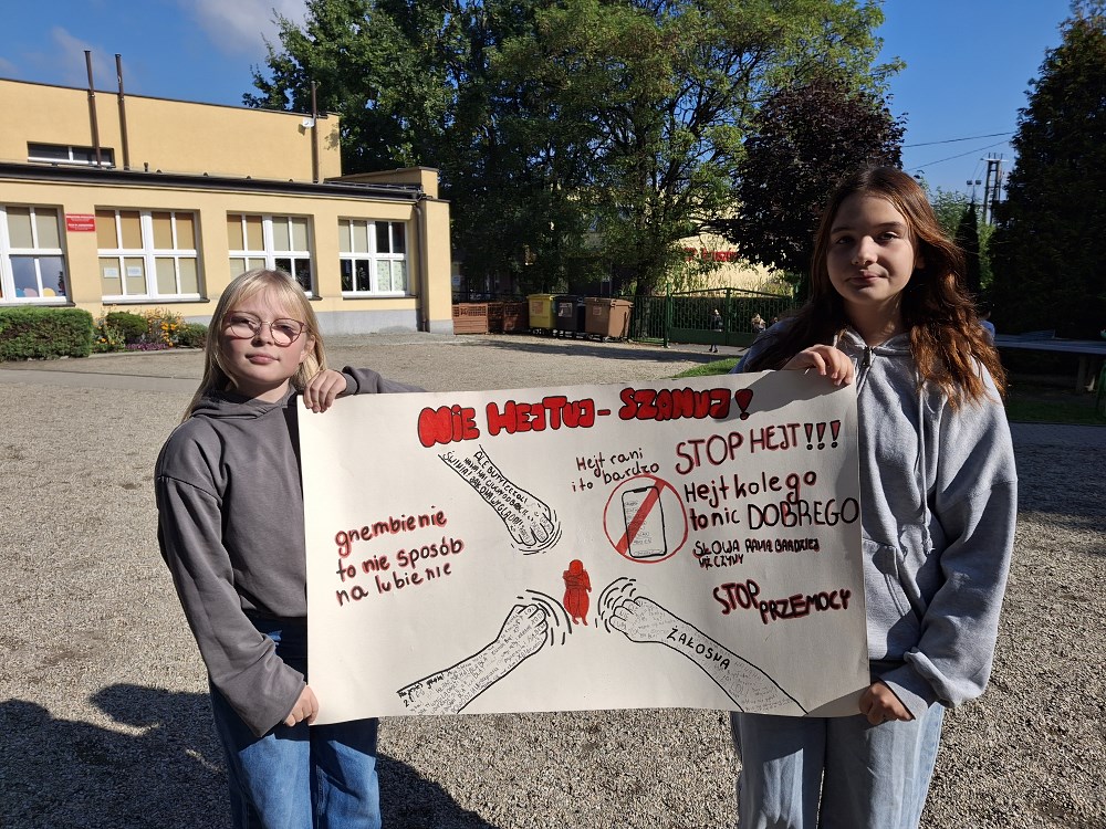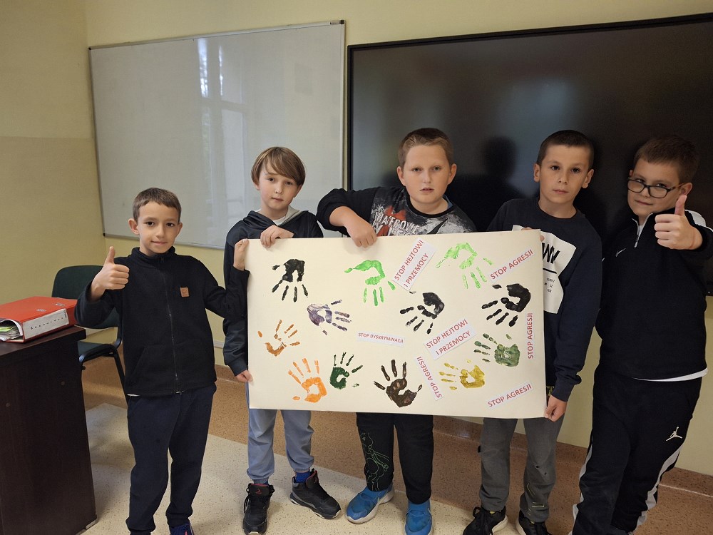 Podczas warsztatów, uczniowie wspólnie wykonywali plakaty nawołujące do szacunku, wspólnej tolerancji i akceptacji. Prace plastyczne zostały rozwieszone w korytarzach szkolnych. Uczestnicy wspólnie zastanawiali się, jak reagować, gdy są świadkami przemocy, jak wspierać innych oraz jak budować klasę opartą na szacunku i wzajemnej życzliwości.