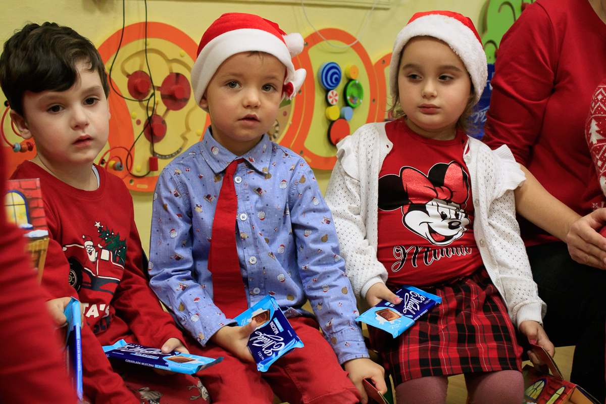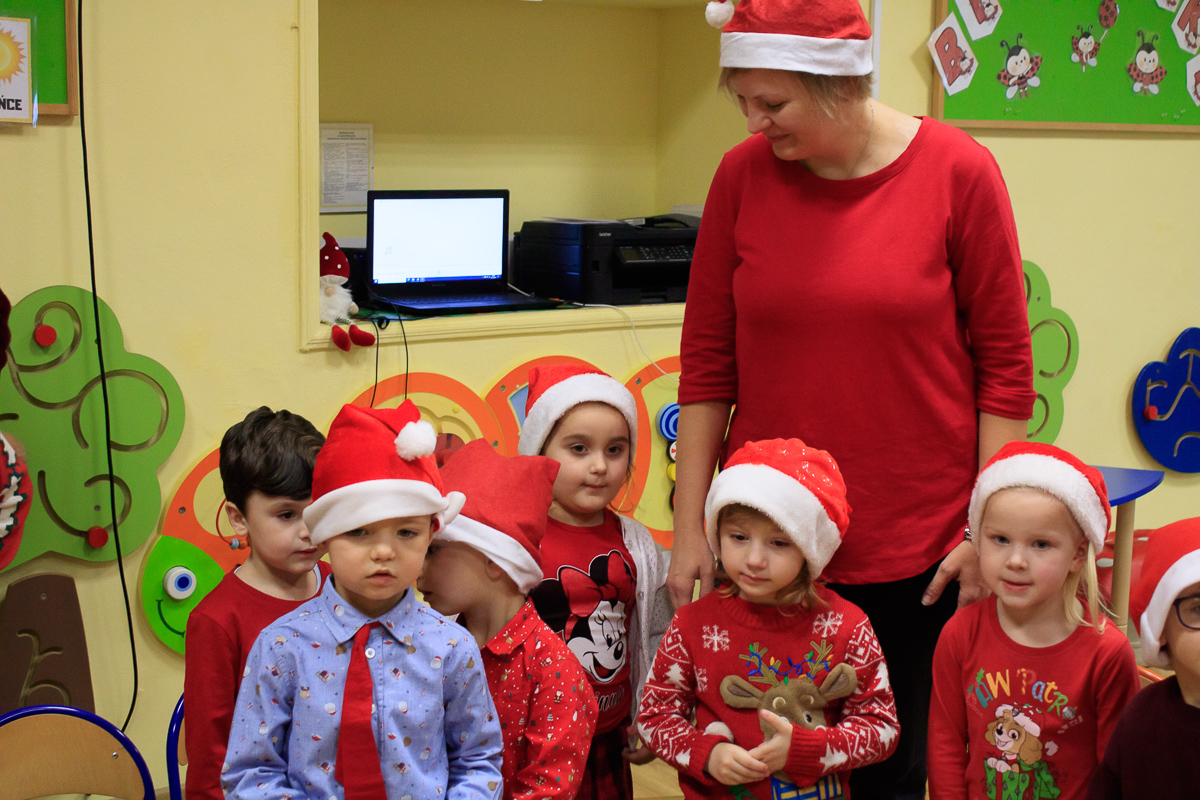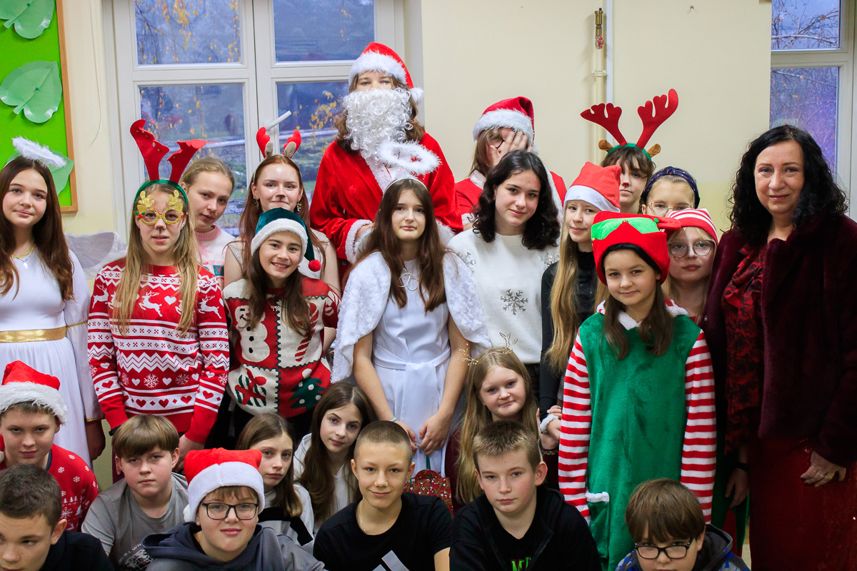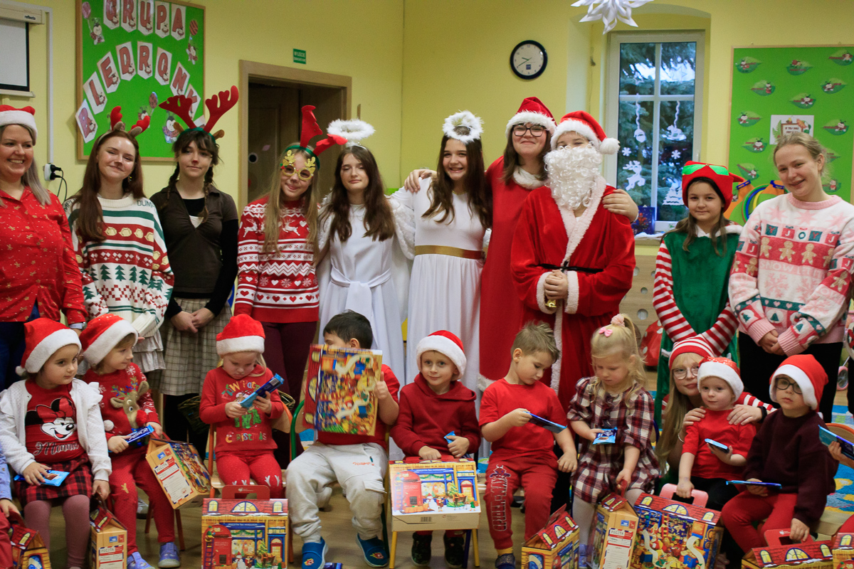 Po zakończeniu wizyt w budynku szkoły, barwny orszak przemaszerował do przedszkola, gdzie dzieciaki były bardzo zaskoczone niecodziennymi gośćmi. Były piosenki, życzenia i wierszyki dla Mikołaja oraz oczywiście prezenty i wspólna zabawa. Uczniom i przedszkolakom towarzyszyła także dyrektor szkoły – Beata Jankiewicz.