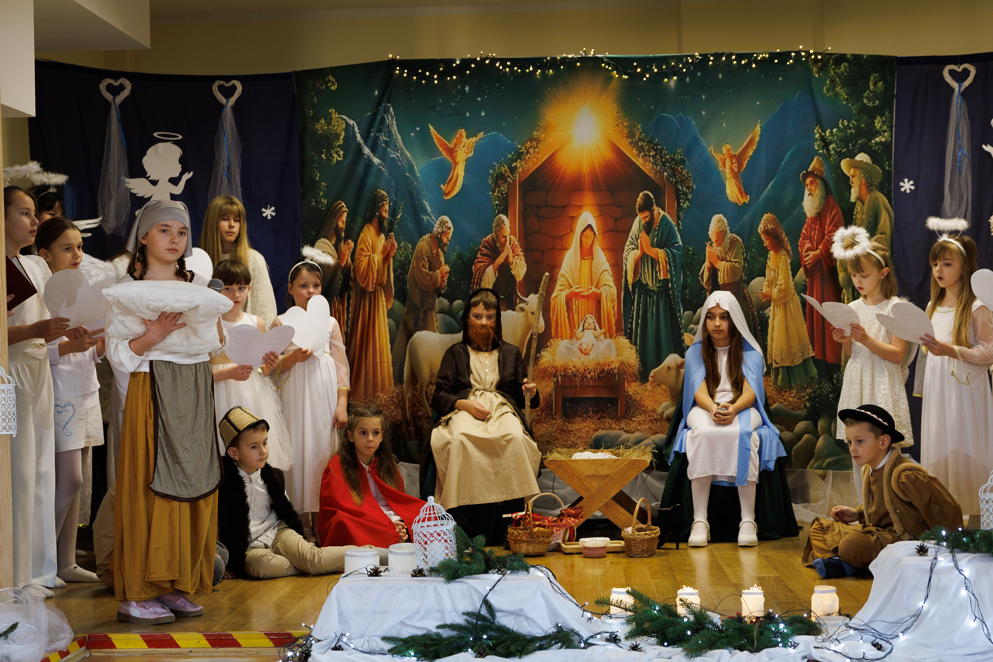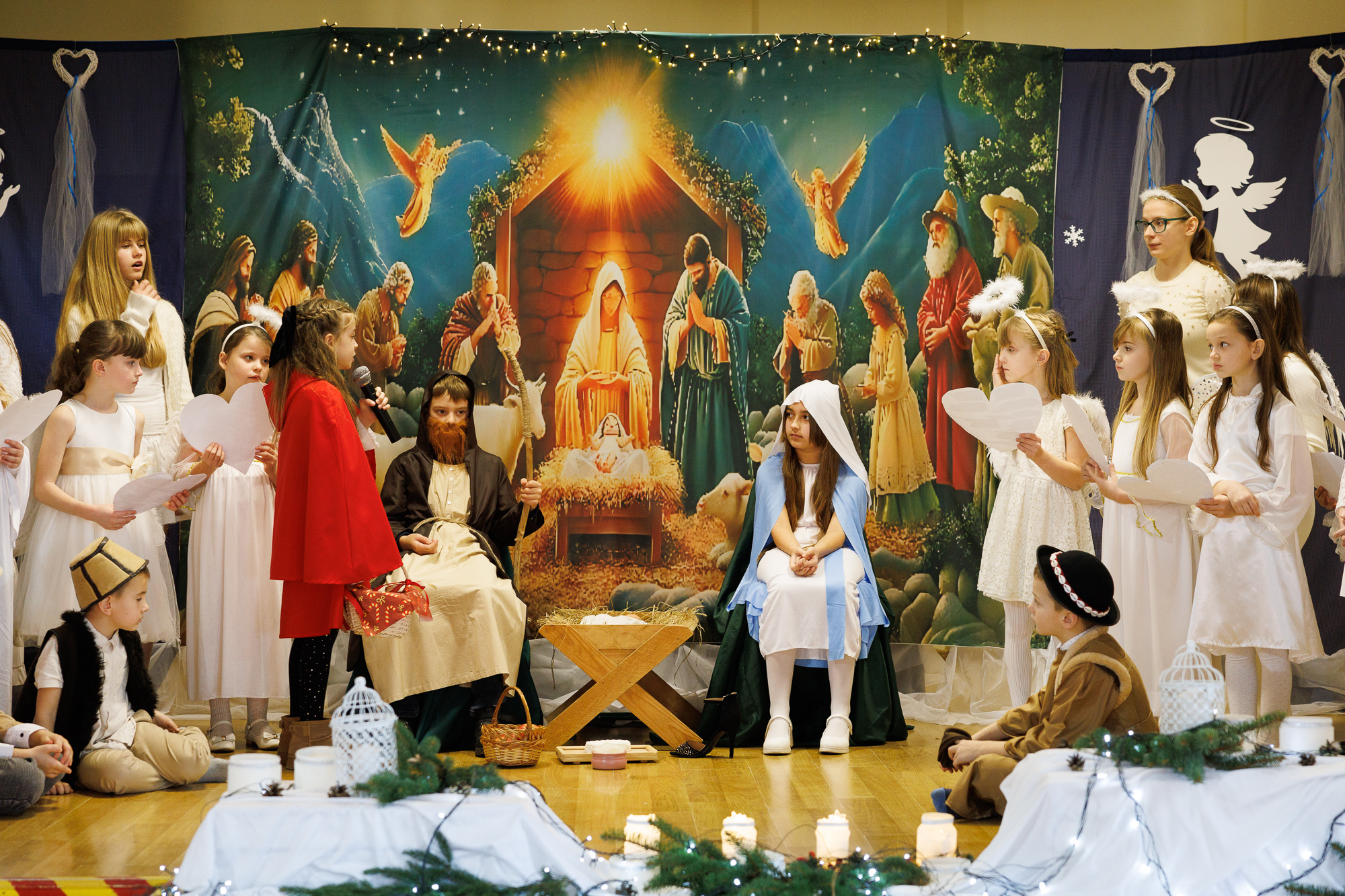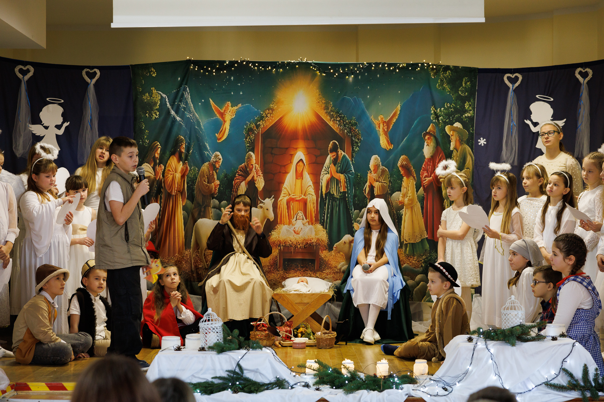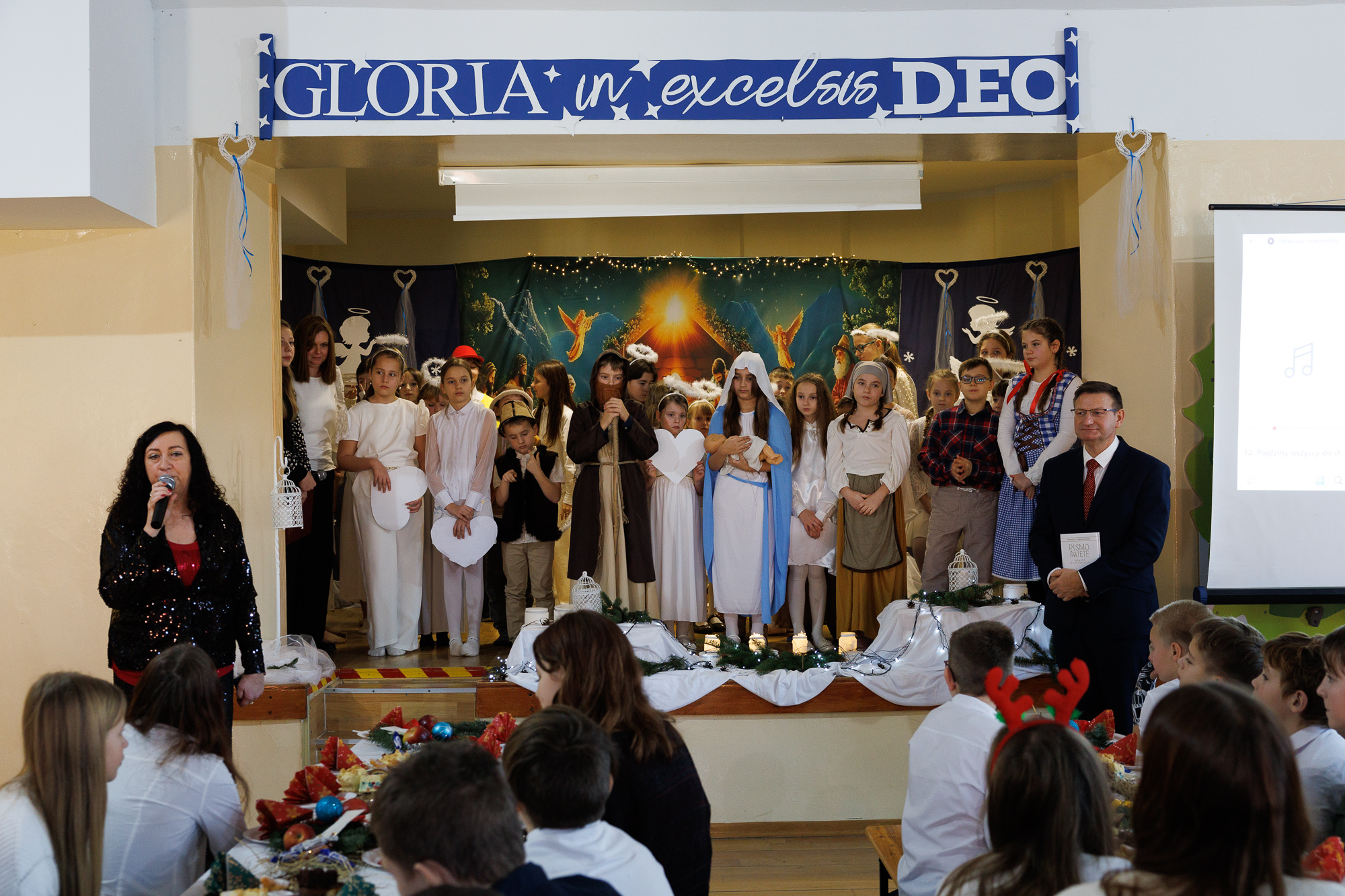 Przedstawienie bożonarodzeniowe wprowadziło uczniów, nauczycieli oraz zaproszonych gości w radosną atmosferę wigilii szkolnej i tradycyjnego wspólnego kolędowania, które zakończyły zajęcia szkolne przed zimową przerwą świąteczną.