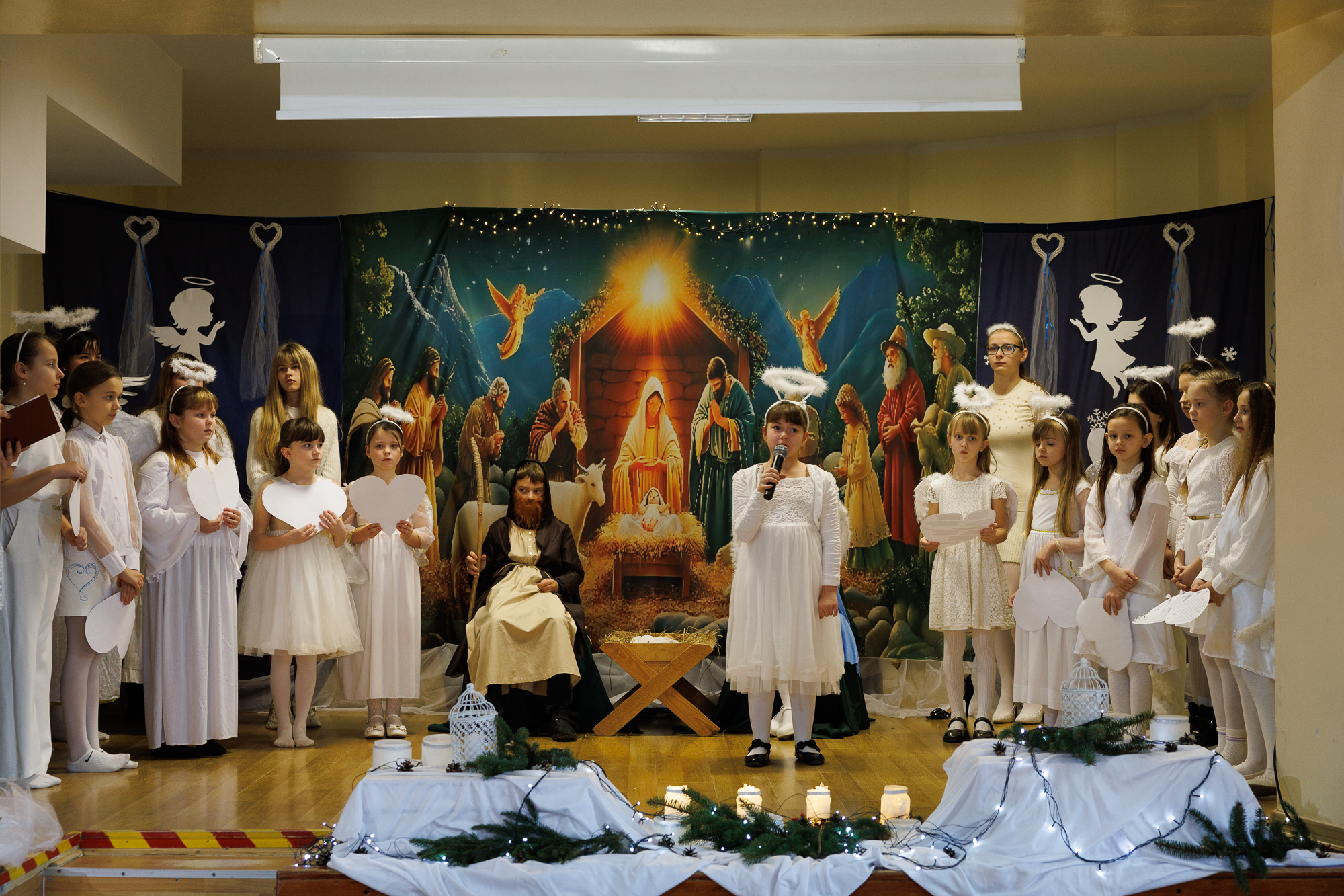 W tegorocznych Jasełkach wystąpili: Layla Jarzmik (Maryja), Antoni Nycz (św. Józef), Magdalena Kossowicz (narrator), pasterze: Tomasz Łata, Franciszek Głód i Piotr Rychel, aniołowie: Melania Ciepła, Maja Czapla, Zofia Czapla, Wiktoria Dobrowolska (wokalistka), Magdalena Dworak, Zuzanna Gajos, Amelia Grajna, Leonie Gajewska, Joanna Brokos, Władysława Fomenko, Zofia Kogut, Natalia Kowalska, Eliza Łosiak, Marcelina Łyczak, Emilia Mrozek, Joanna Różańska, Adrianna Senczyna, Wiktoria Senczyna, Klaudia Szymańska, Martyna Szymańska i Laura Świątek, bohaterowie znanych bajek: Zuzanna Miklaszewska (Czerwony Kapturek), Karol Pieszko (Jaś), Zuzanna Kaszuba (Małgosia), Klaudia Hordyńska (Sierotka Marysia), Zuzanna Rychel (Calineczka, wokalistka), Anna Szczepek (Pinokio) i Błażej Wiraszka (Rybak ze złotą rybką). Gra aktorska uczniów oraz śpiew kolęd i pastorałek zostały wzbogacone dopasowanymi do danej sytuacji scenicznej podkładami muzycznymi.