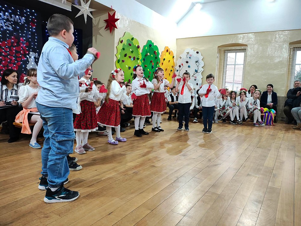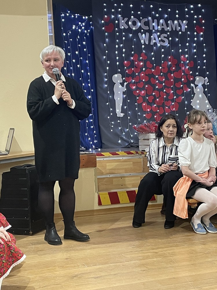 Już od pierwszych chwil widać było ogromne zaangażowanie dzieci. Na scenie pojawiły się barwne dekoracje z motywem serc i kwiatów. Występ rozpoczął się pięknymi wierszami dla Dziadków, które zawierały przepiękne życzenia.