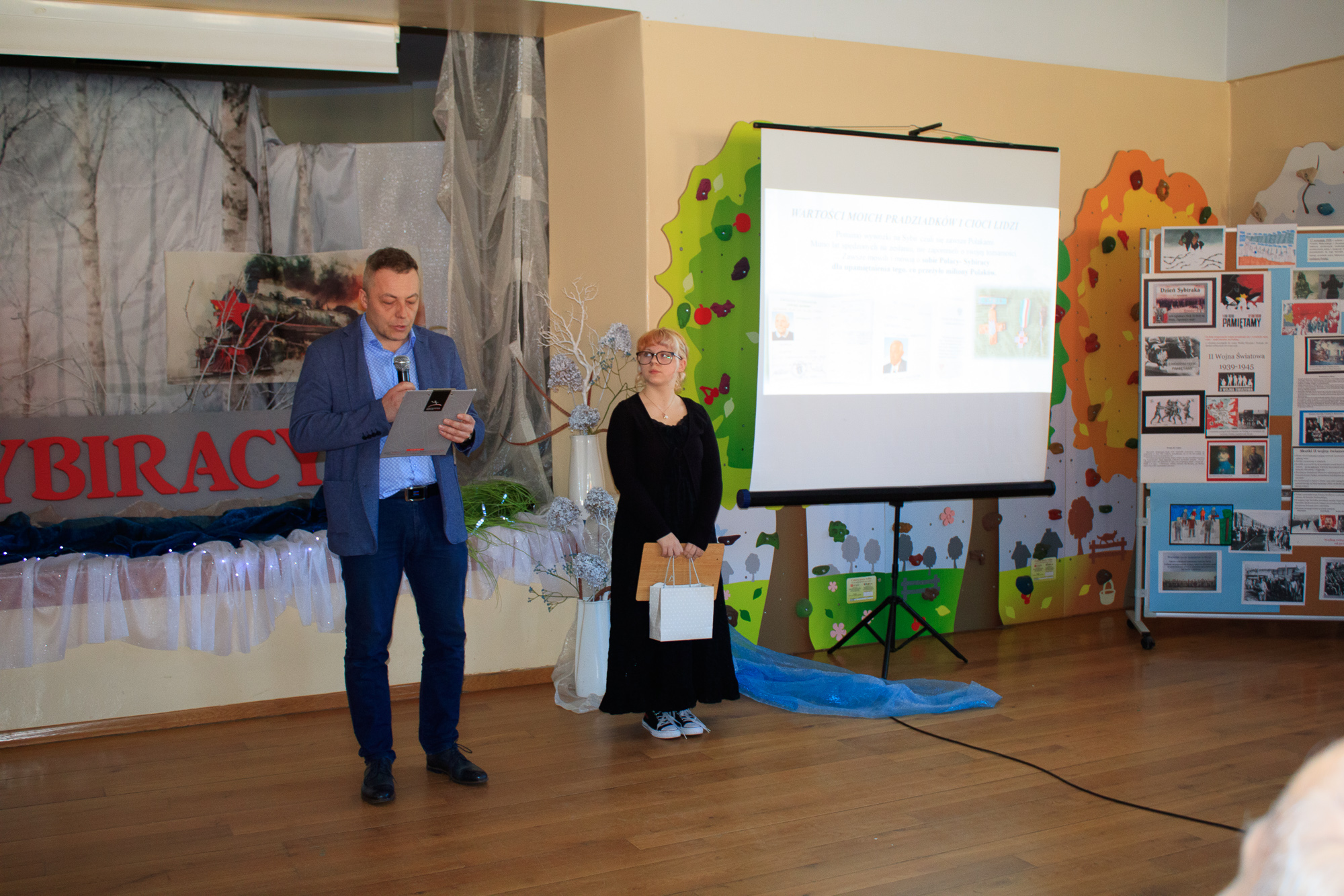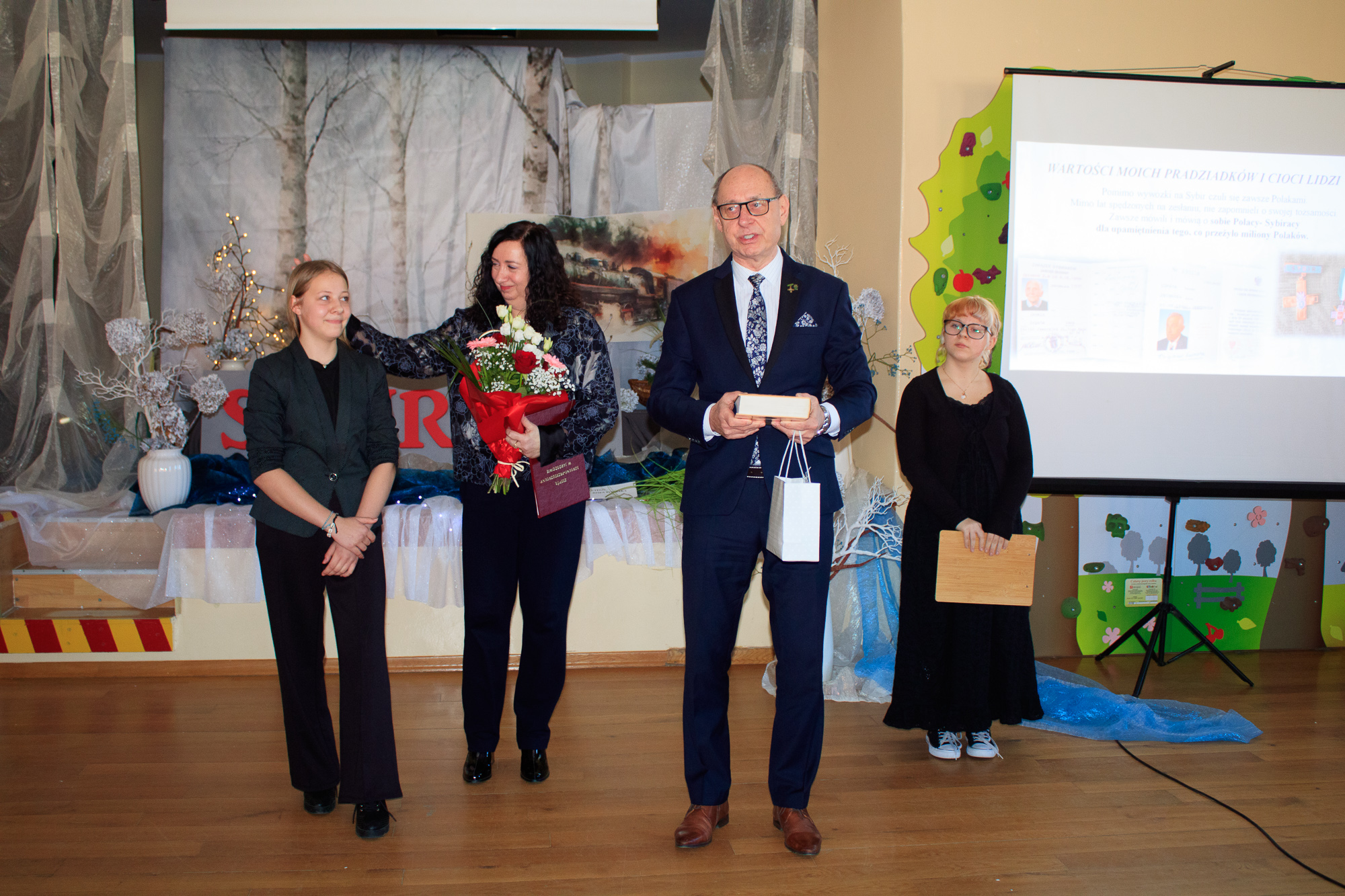 Na początku dyrektor szkoły Beata Jankiewicz serdecznie powitała przybyłych gości: Romana Asyngera – prezesa Koła Związku Sybiraków w Strzegomiu, Józefa Białka – sekretarza Koła Związku Sybiraków oraz Marcina Kossowicza - rodzica uczennicy kl.8 - Magdaleny.
