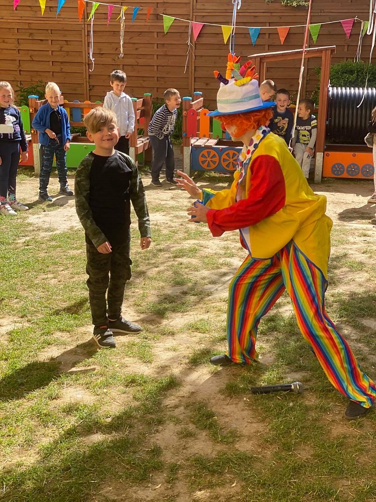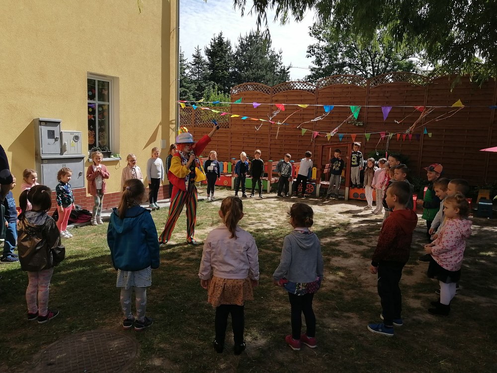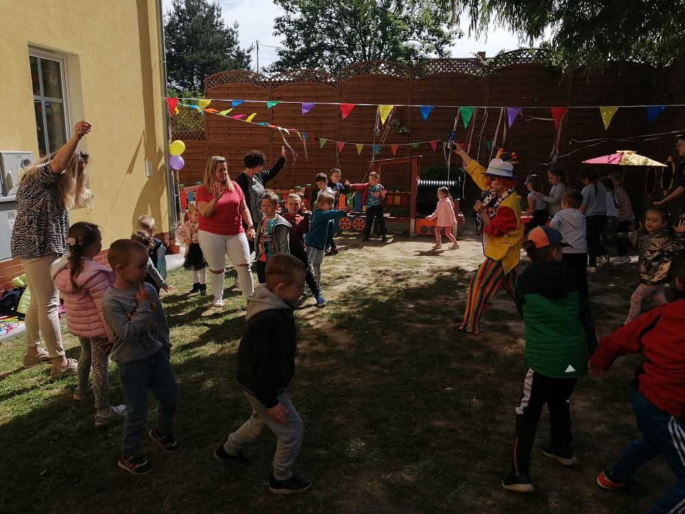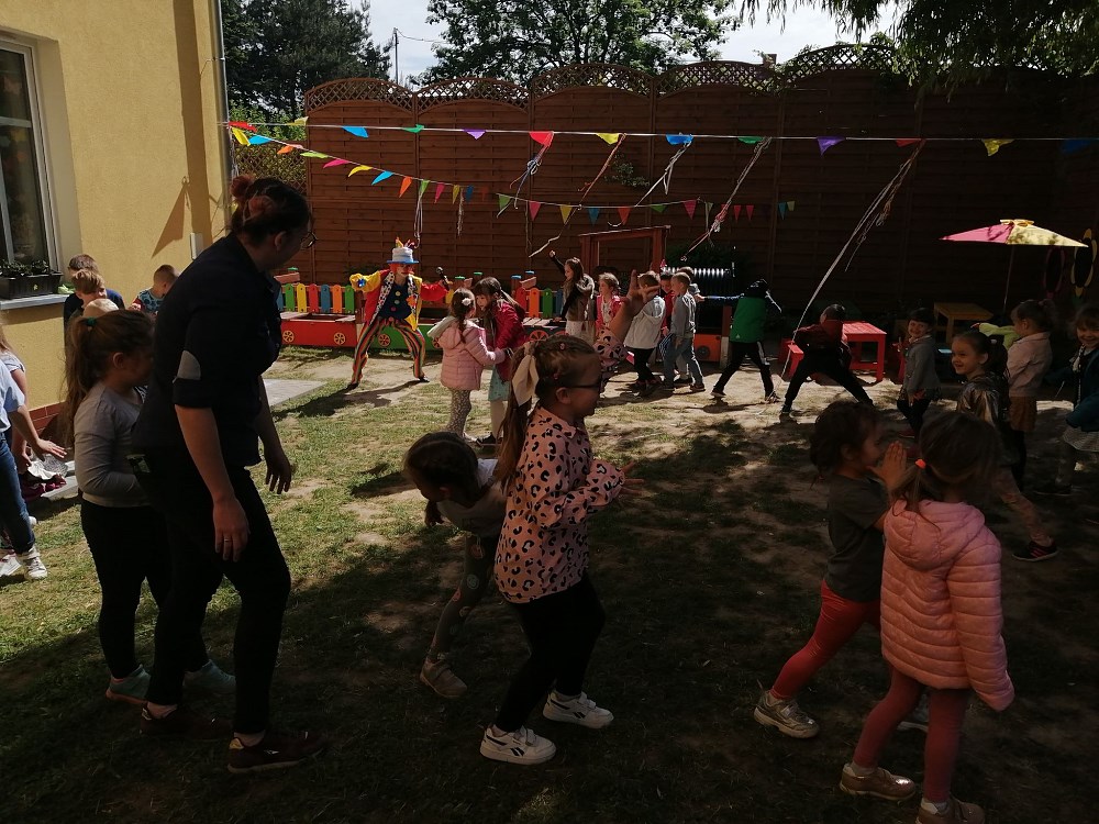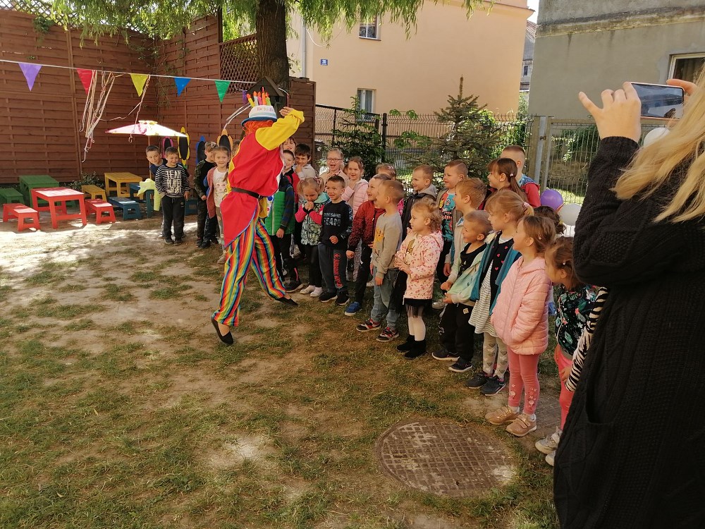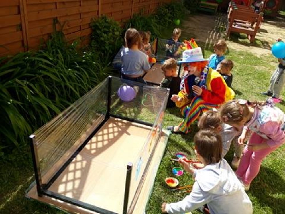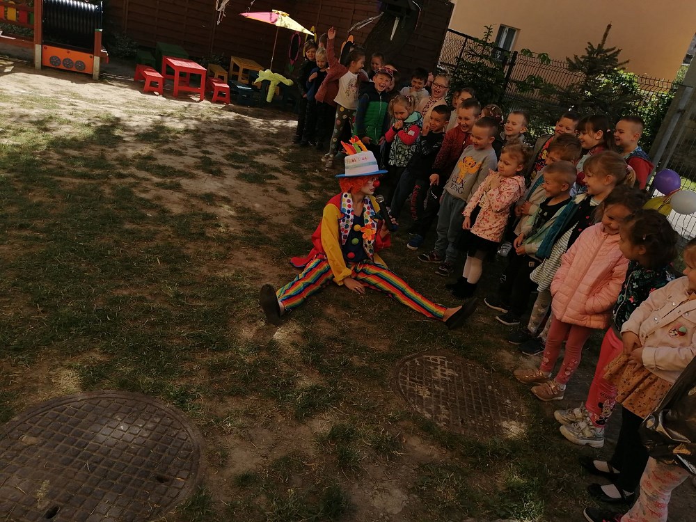 Najpierw do przedszkola zawitał niespodziewany gość - Klaun Bobik, który przygotował ciekawe zabawy i tańce dla dzieci. Potem przedszkolaki malowały na folii i puszczały bańki. Nie zabrakło również jednej z ulubionych atrakcji dzieci czyli malowania twarzy w ciekawe wzory.