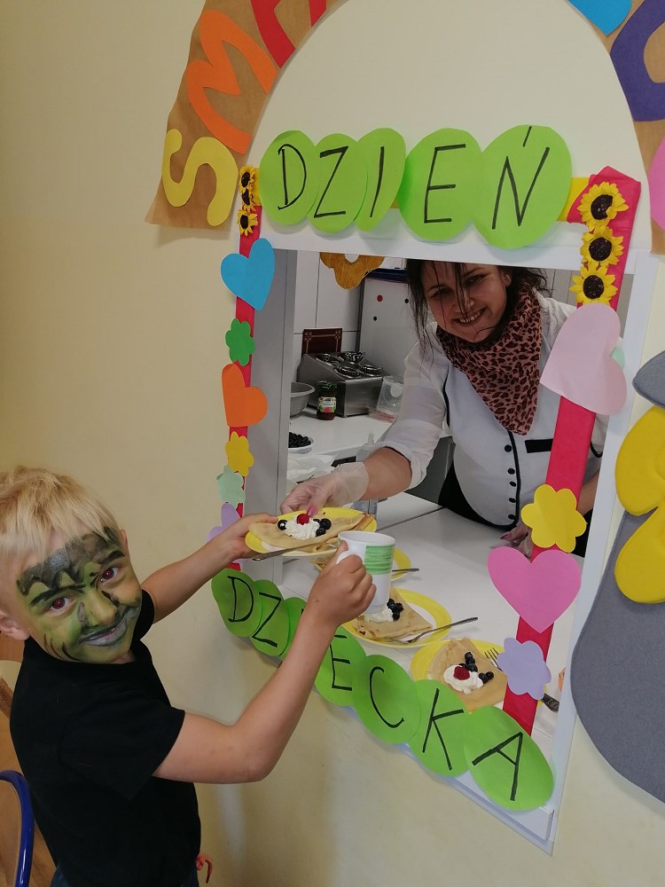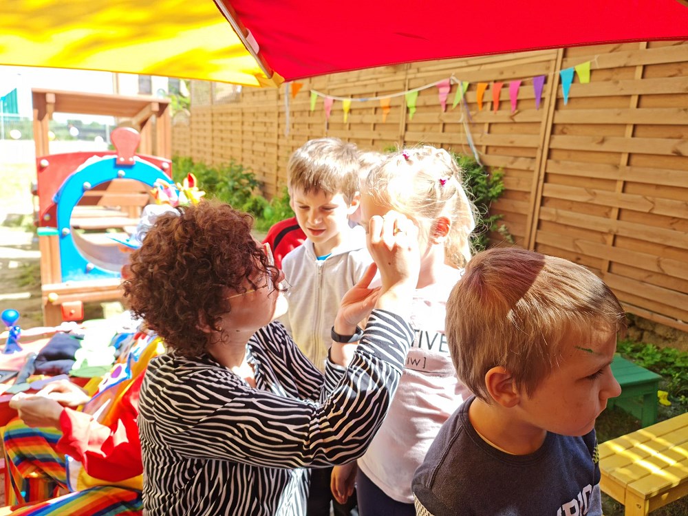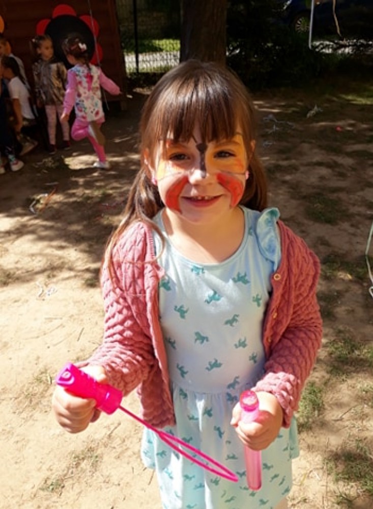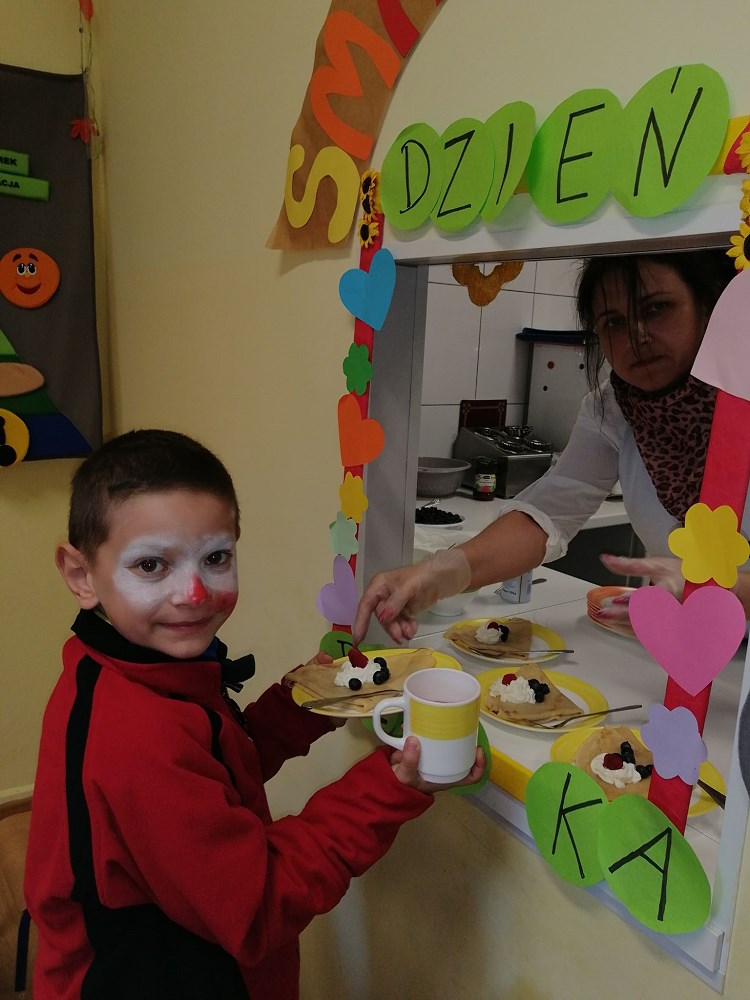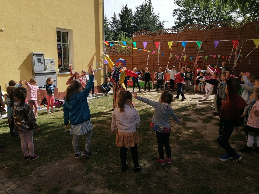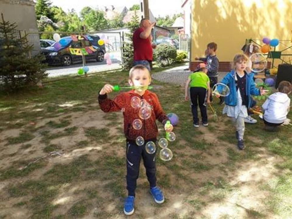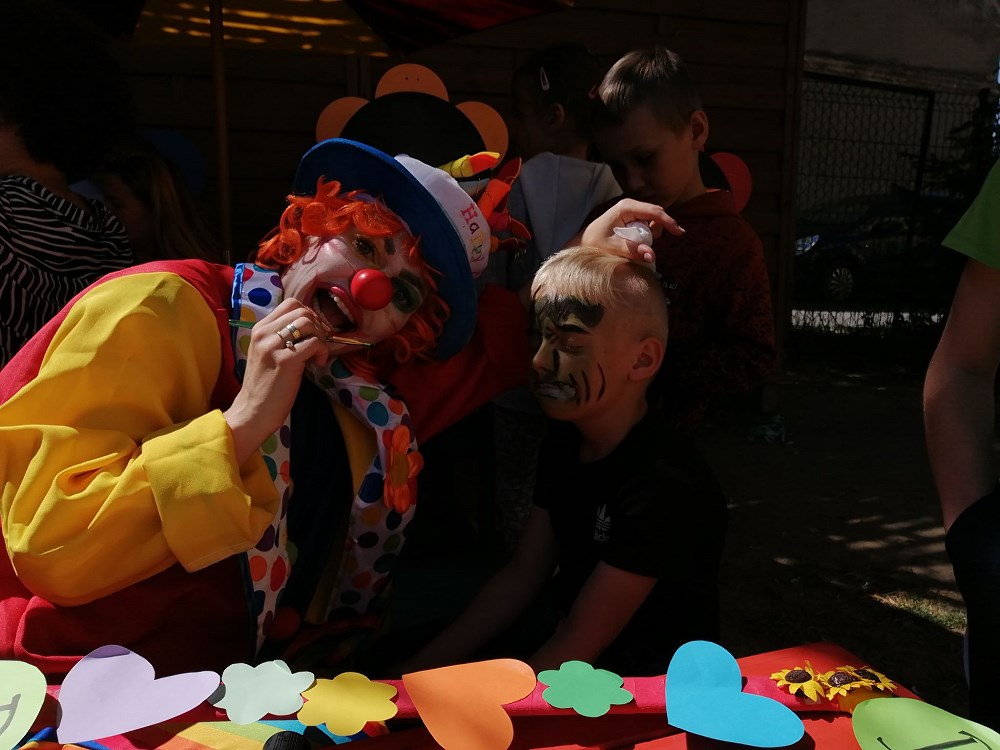 Najpierw do przedszkola zawitał niespodziewany gość - Klaun Bobik, który przygotował ciekawe zabawy i tańce dla dzieci. Potem przedszkolaki malowały na folii i puszczały bańki. Nie zabrakło również jednej z ulubionych atrakcji dzieci czyli malowania twarzy w ciekawe wzory.
