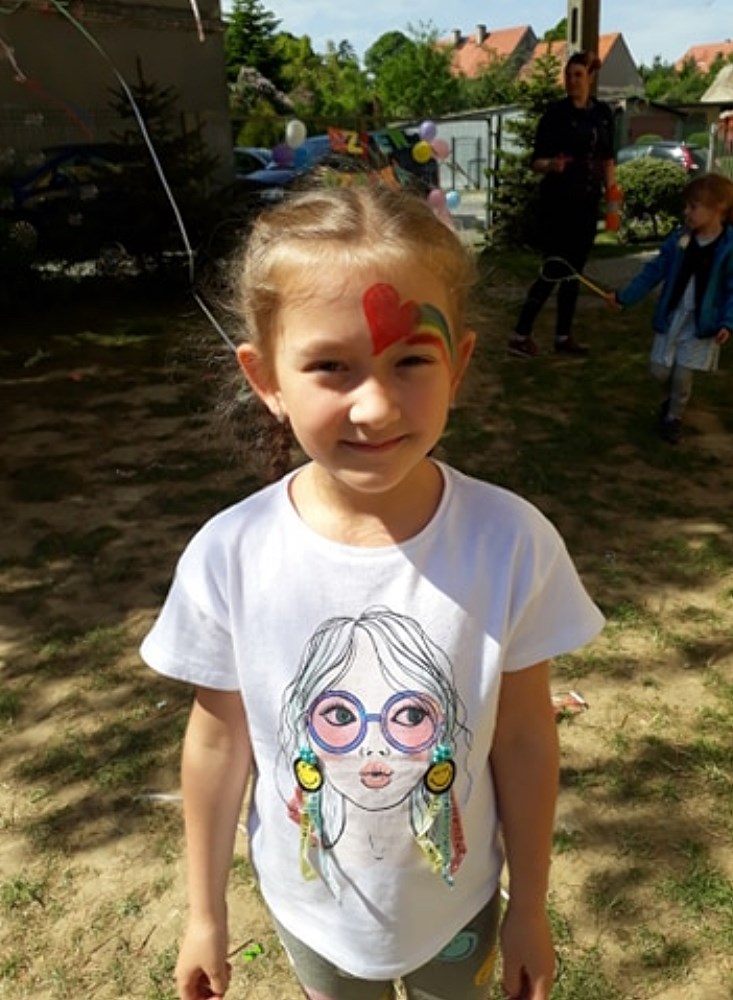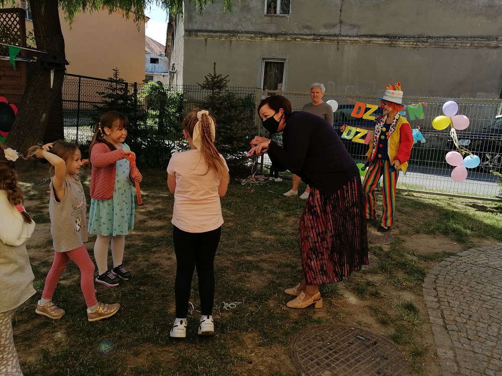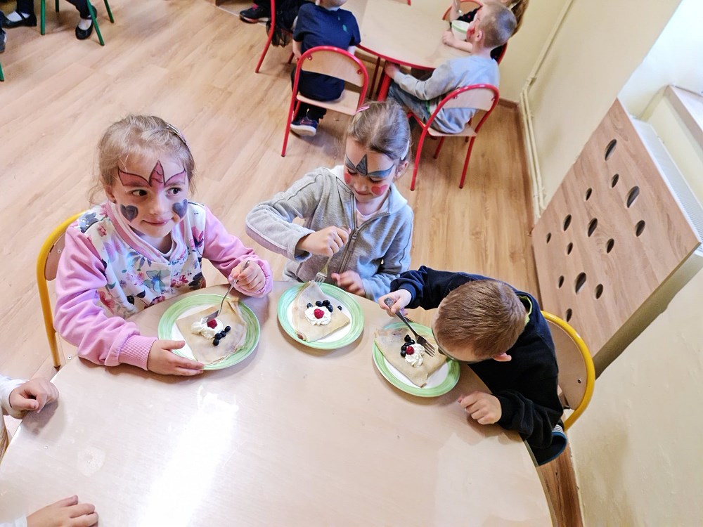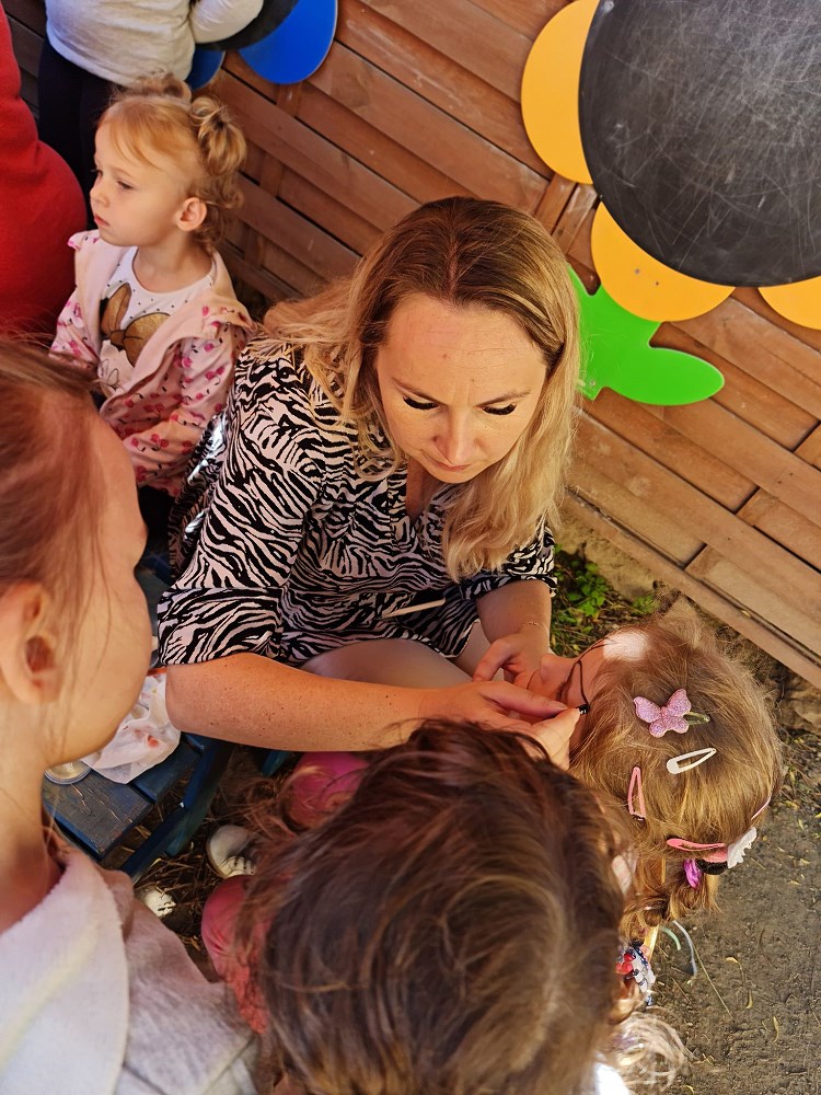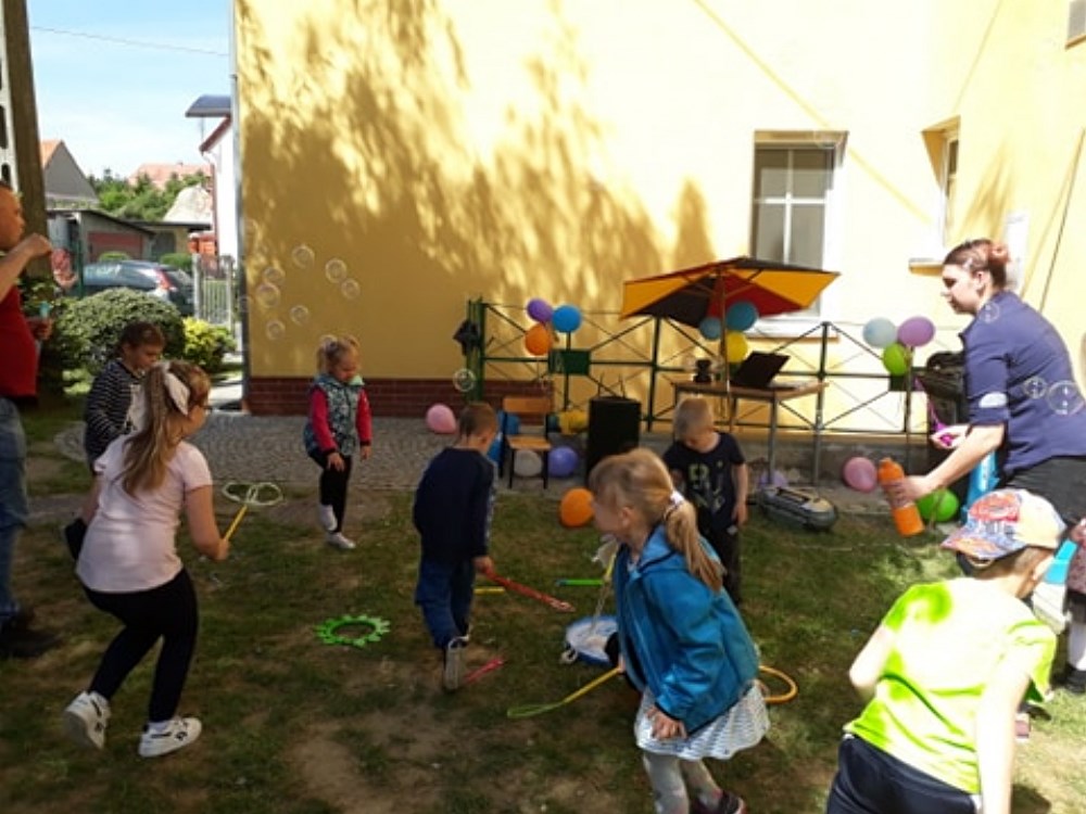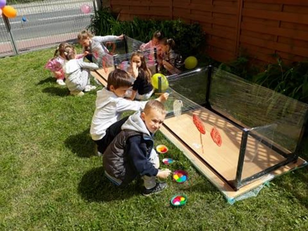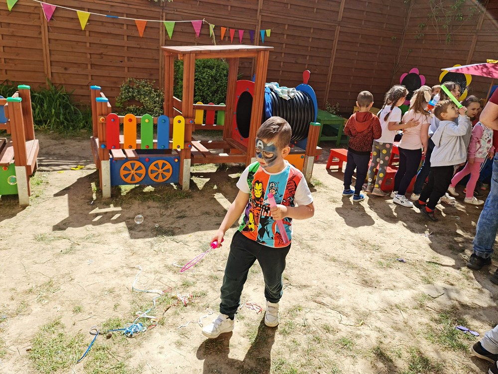 Najpierw do przedszkola zawitał niespodziewany gość - Klaun Bobik, który przygotował ciekawe zabawy i tańce dla dzieci. Potem przedszkolaki malowały na folii i puszczały bańki. Nie zabrakło również jednej z ulubionych atrakcji dzieci czyli malowania twarzy w ciekawe wzory.