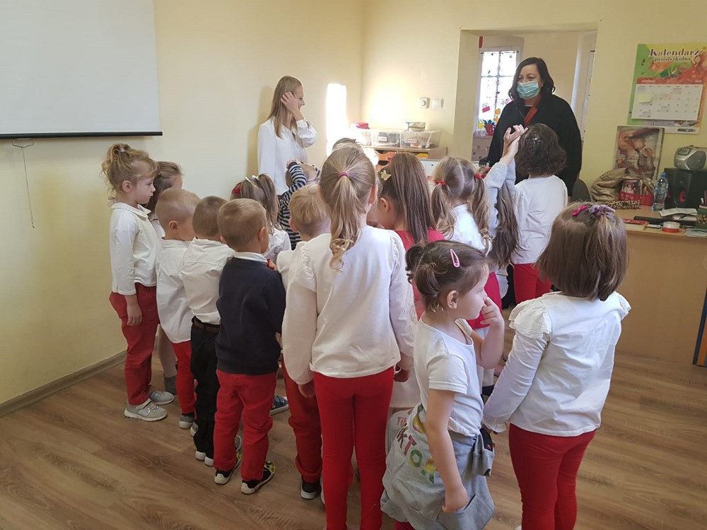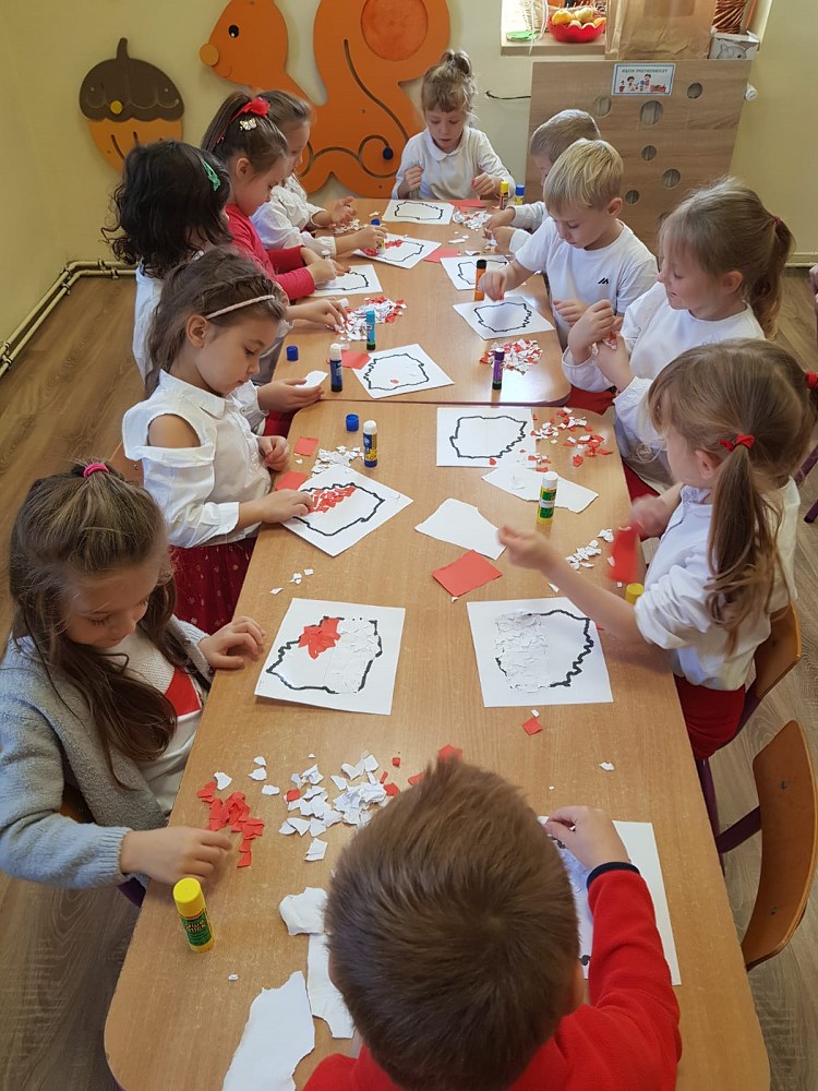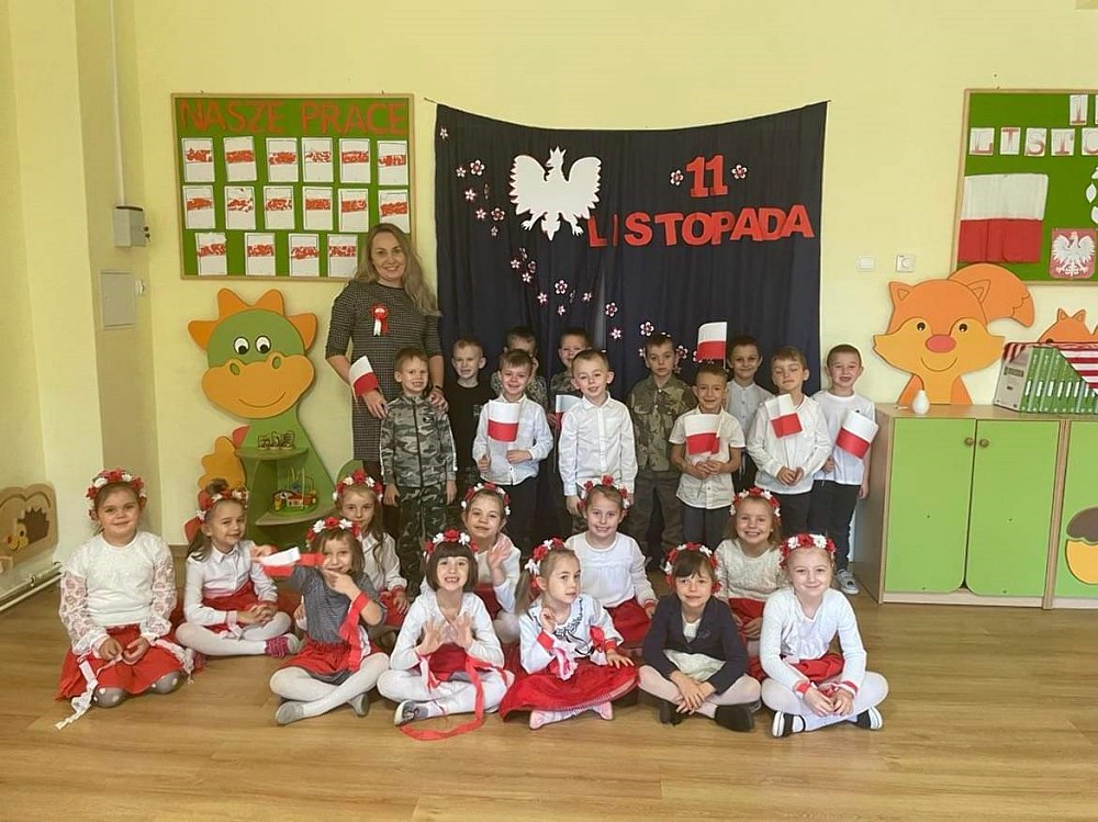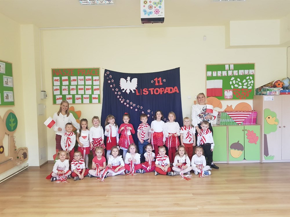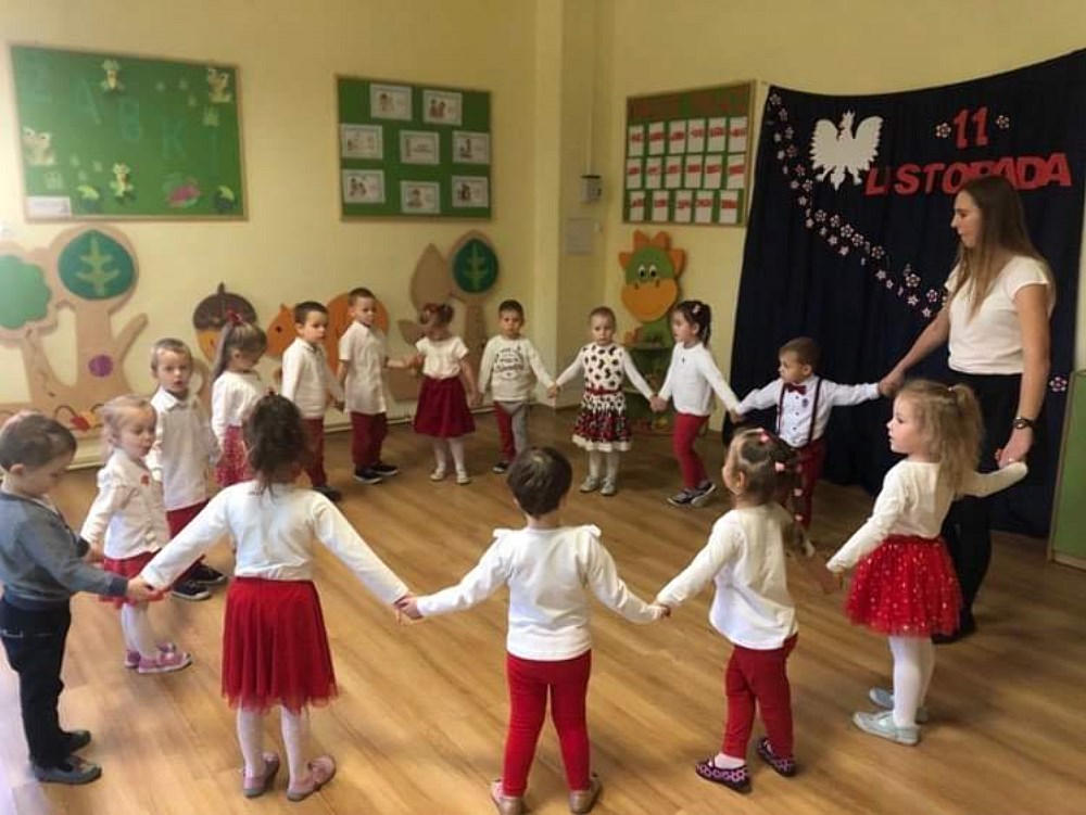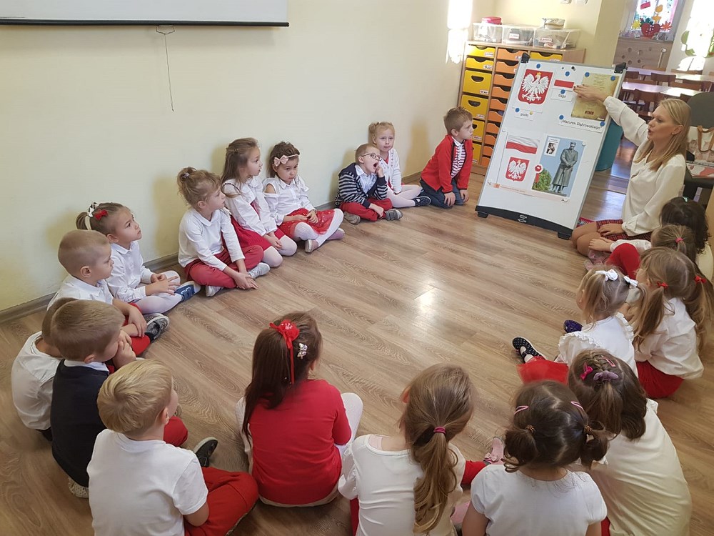 Przedszkolaki utrwalały nazwy symboli narodowych. Na zakończenie uroczystości - o godzinie 11:11 - ubrani na galowo oraz z zachowaniem właściwej postawy dzieci i nauczyciele odśpiewali hymn Polski - „Mazurek Dąbrowskiego”.