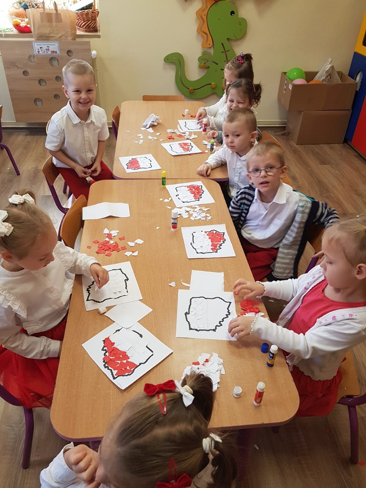Biedroneczki zaśpiewały i zatańczyły taniec do piosenki „Mały Polak, przedszkolak” oraz oglądnęły prezentację multimedialną pt. „Symbole narodowe”. Dla utrwalenia barw narodowych, wykonały flagę Polski z wykorzystaniem kolorowego papieru.