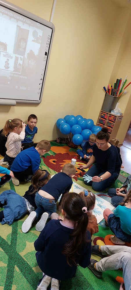 Wszystkie grupy przedszkolne wykonały prace plastyczne. Dzieci odbijały rączki pomalowane na niebiesko tworząc plakaty. Tego dnia wychowankowie i nauczyciele przyszli ubrani na niebiesko, jako symbol solidarności ze wszystkimi dziećmi na świecie.