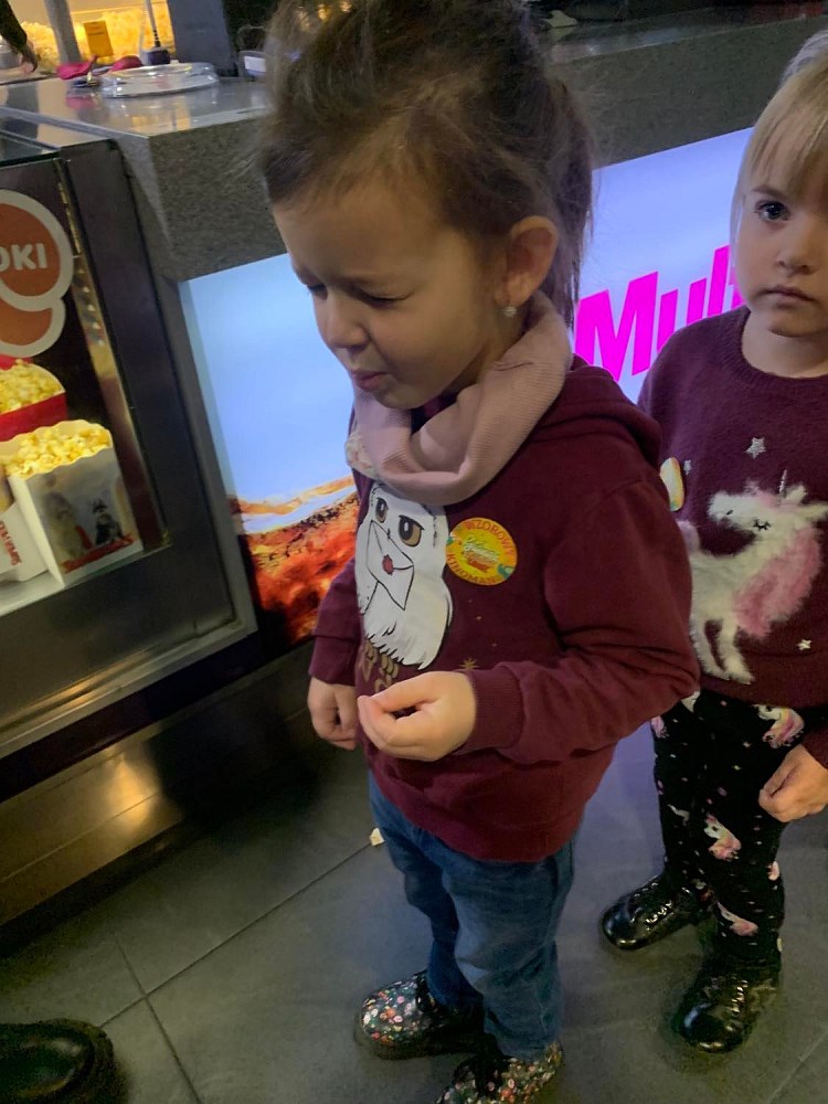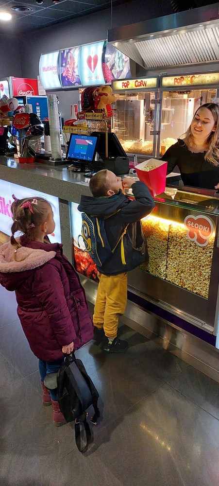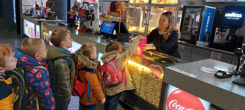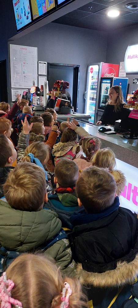 Dzieci miały okazję zwiedzić kino. Dowiedziały się tego, jak robi się „kinowy” popcorn i w jaki sposób kupuje się bilety. Następnie udały się na zwiedzanie sal kinowych. Pracownice „Multikina” opowiedziały jak wygląda praca w tym miejscu, w jaki sposób przechowywane są dyski z bajkami i filmami. Przedszkolaki miały okazję popatrzeć przez noktowizor (urządzenie, które sprawdza czy ktoś nie nagrywa filmu).