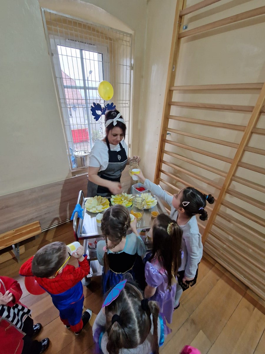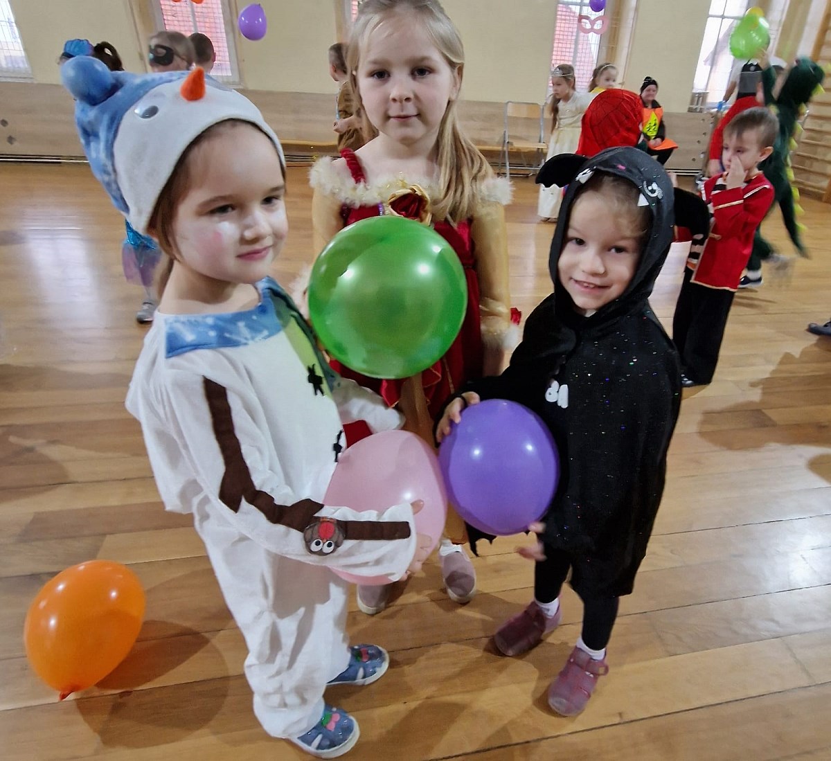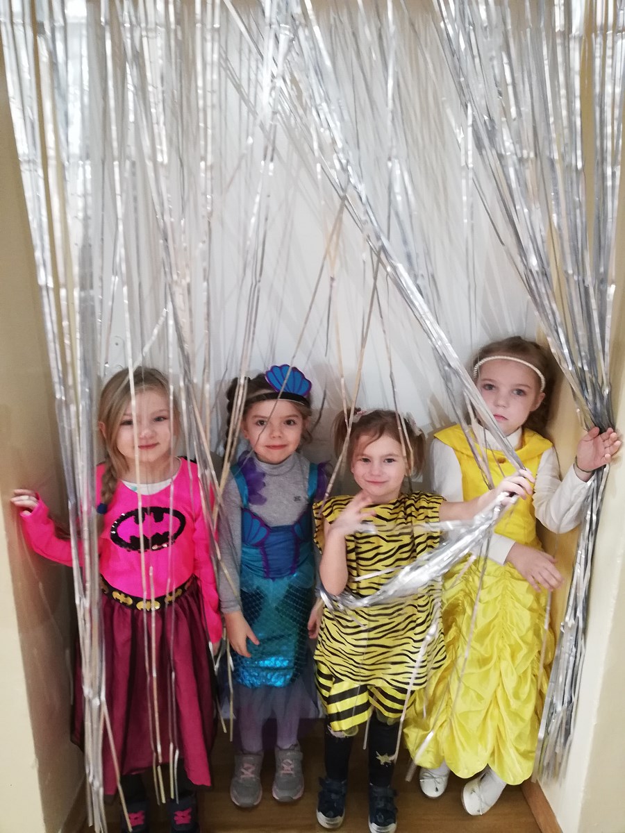 W dniu, tak ważnego wydarzenia, przedszkolaki od rana przybywały do swoich sal w kolorowych przebraniach. Nie zabrakło wróżek, księżniczek, syrenek, rycerzy, policjantów, strażaków, czy też znanych postaci z bajek. Bal odbył się w sali gimnastycznej, przystrojonej w balony i kolorowe maski w stylu weneckim. Sówki, Pszczółki i Żabki z dumą zaprezentowały swoje stroje, przechodząc po czerwonym dywanie, w rytm wesołej muzyki. Podczas świętowania wszyscy bawili się znakomicie. Odbyły się wspólne tańce – połamańce, pociąg, zabawy z chustą animacyjną i z balonami.