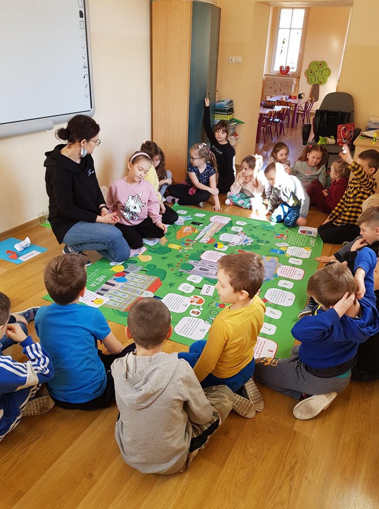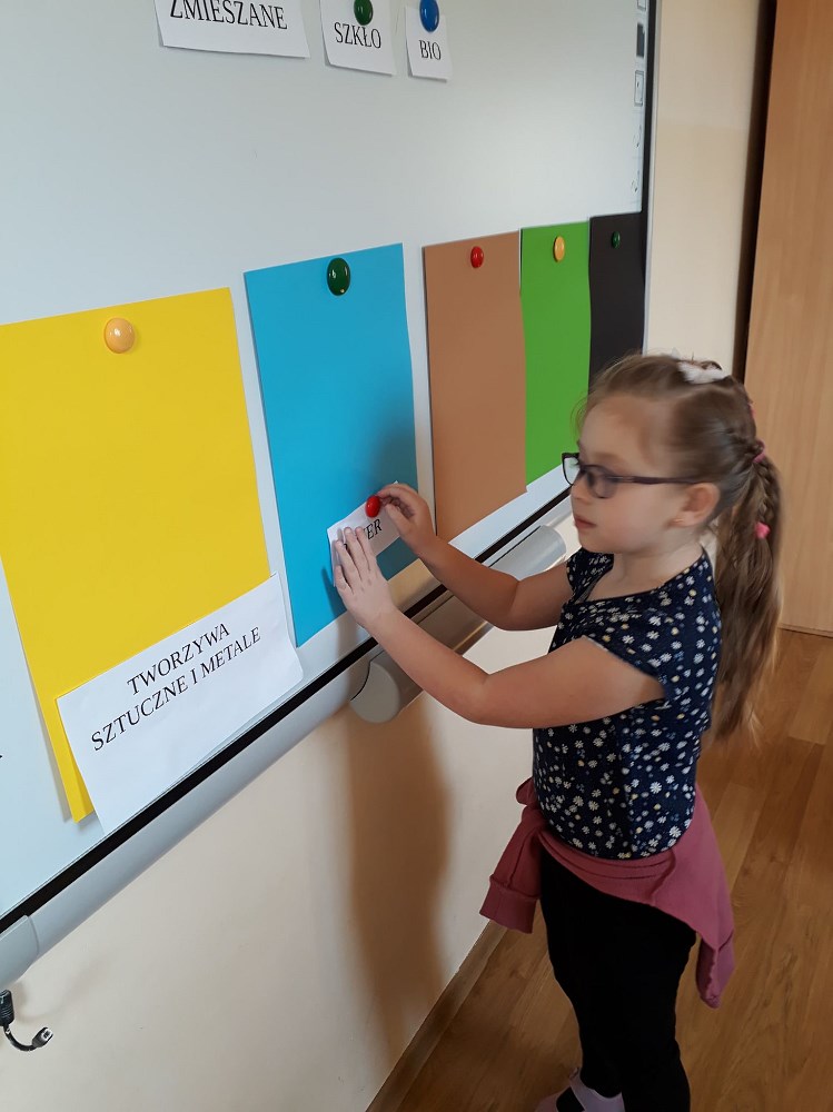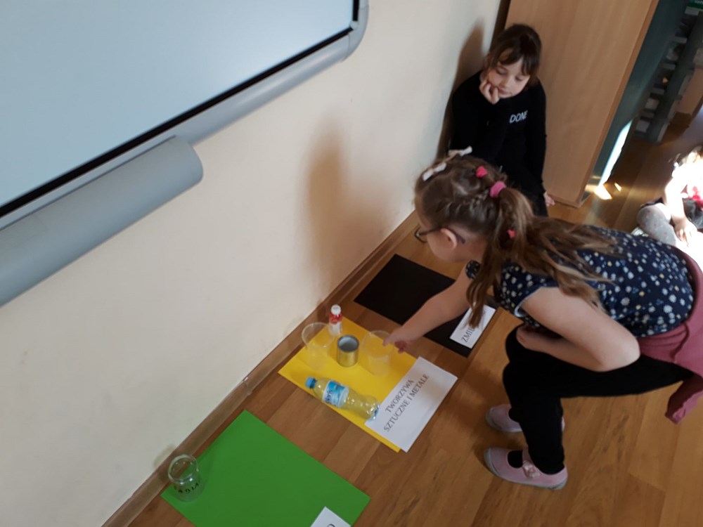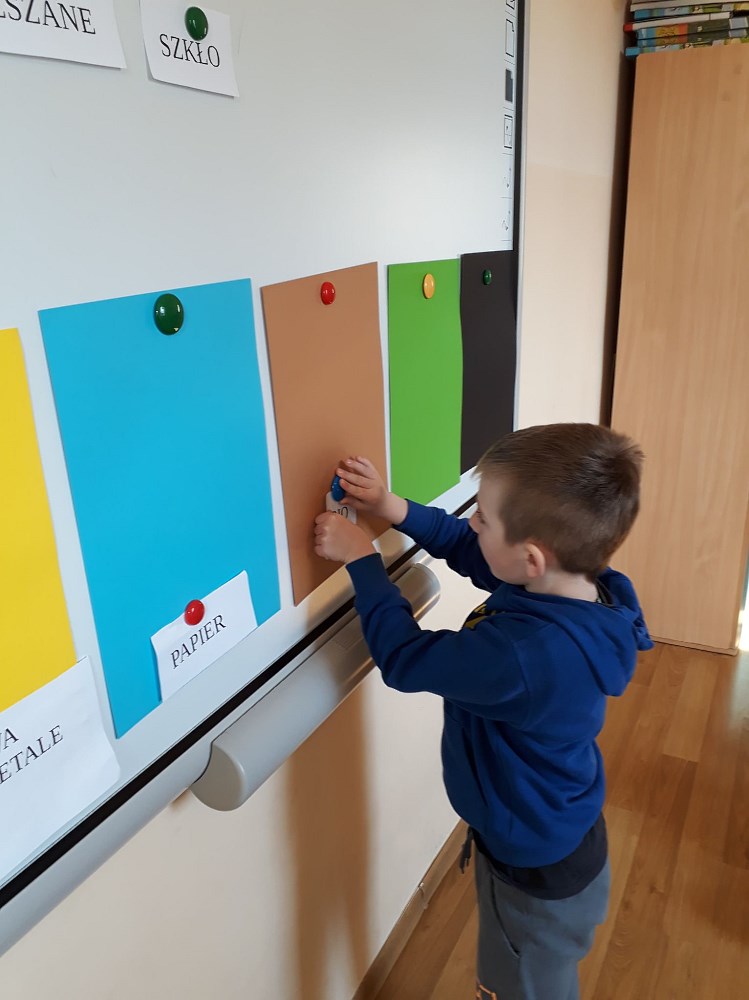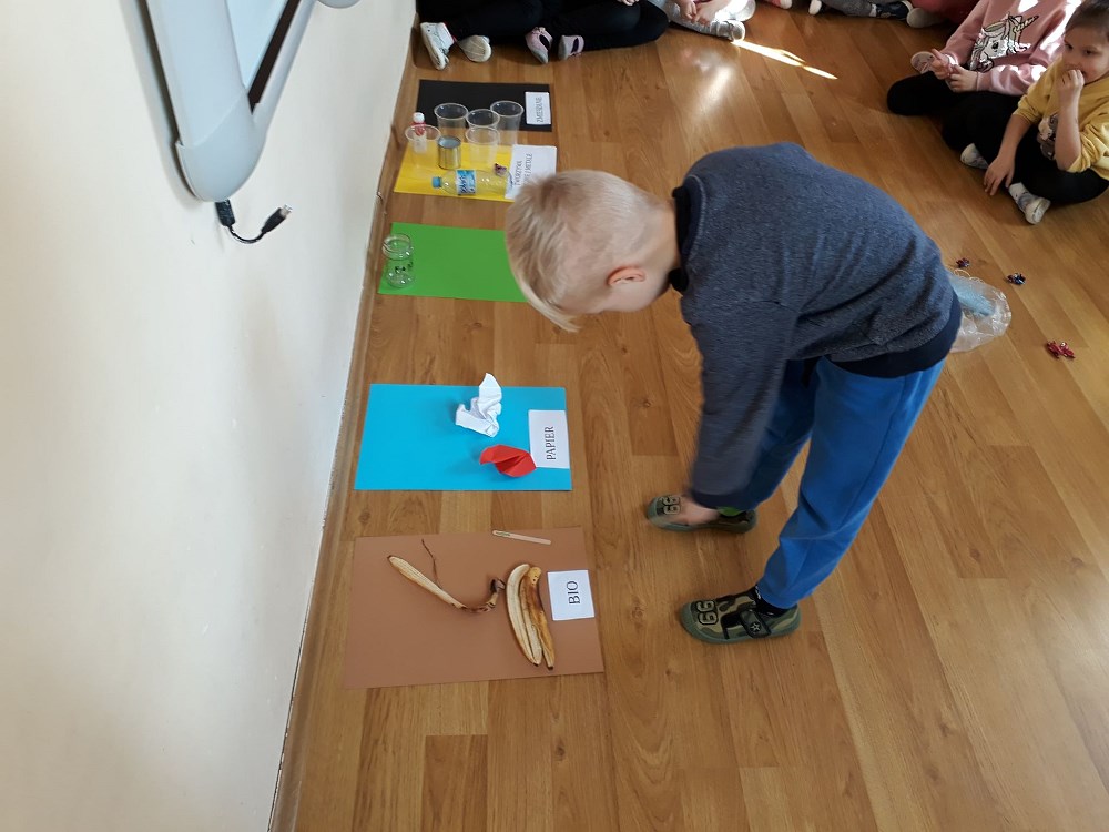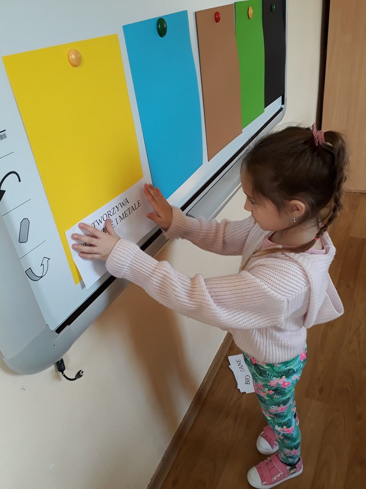 Dzieci doskonale poradziły sobie z rozpoznawaniem materiałów, z których wykonane były odpady, następnie segregowały je do odpowiednich pojemników. Grały również w grę, w której rozwiązywały zadania związane z zachowaniami proekologicznymi.