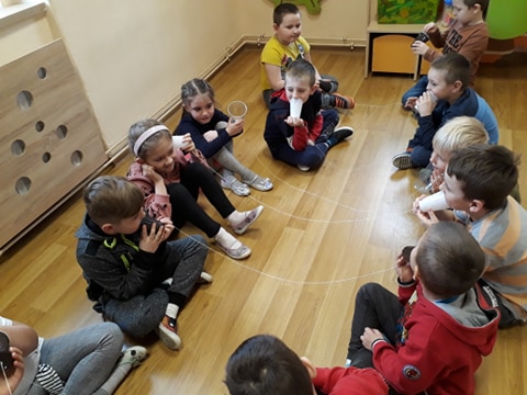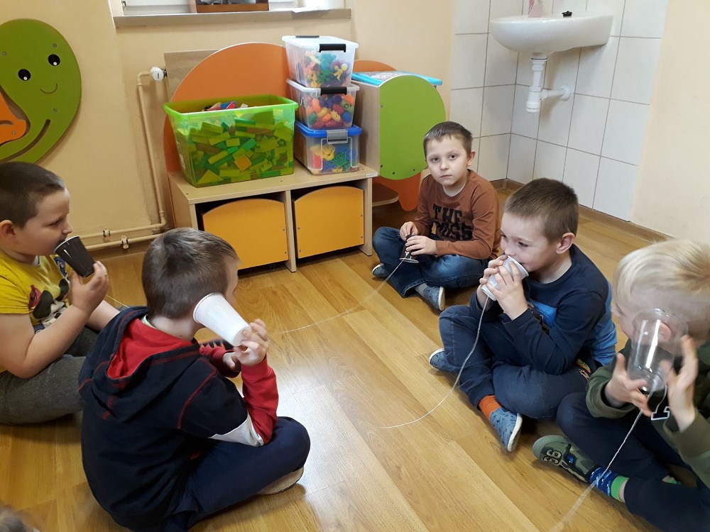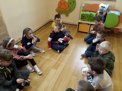 „Żabki” doskonale wiedzą co znaczy segregacja i recykling. Wykonały eko- telefony, wykorzystały do tego kubeczki plastikowe. Na koniec zajęć zaśpiewały piosenkę „Świat w moich rękach”, która zachęca dorosłych oraz dzieci do segregacji odpadów, a tym samym do dbania o nasze środowisko.