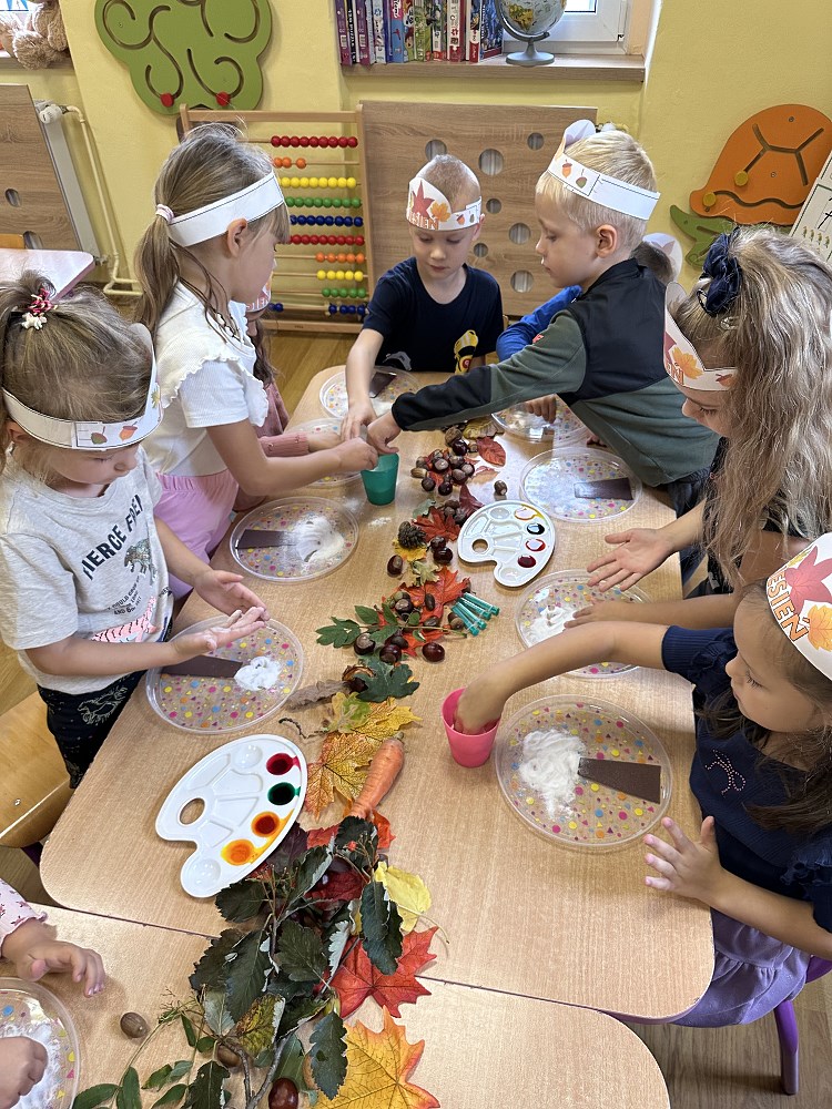 Dzieci wybrały się na jesienny spacer, podczas którego obserwowały zmiany zachodzące z przyrodzie. Z wielkim zainteresowaniem przyglądały się spadającym liściom, zbierały kasztany i kolorowe liście, które później wykorzystały w swoich pracach.