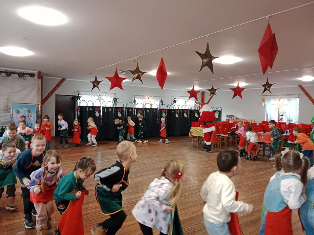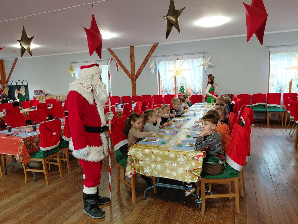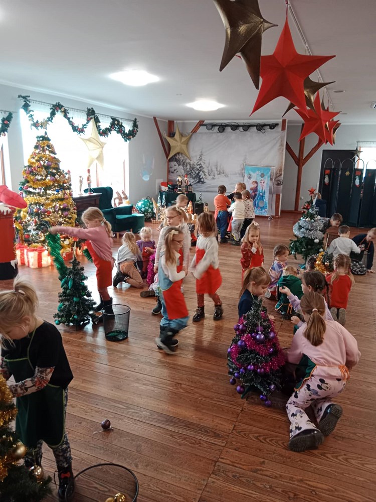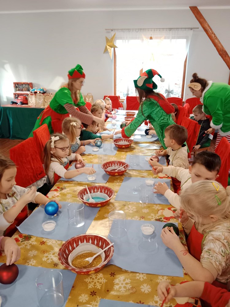 Warsztaty rozpoczęły się od powitania dzieci przez elfa, następnie przedszkolaki przystąpiły do napisania listu do Świętego Mikołaja. Po tym zadaniu przyszły kolejne takie jak: ozdabianie pierników, dekorowanie bombki i ozdób gipsowych, wspólne ubieranie choinki, zabawy przy muzyce z elfami. Najważniejszym i najbardziej oczekiwanym punktem było spotkanie i zabawy ze Świętym Mikołajem. Spotkanie to wywołało wiele radości i uśmiechów na twarzach dzieci. Dzieci wróciły zadowolone, z pięknymi ozdobami świątecznymi, które zabrały do domu.