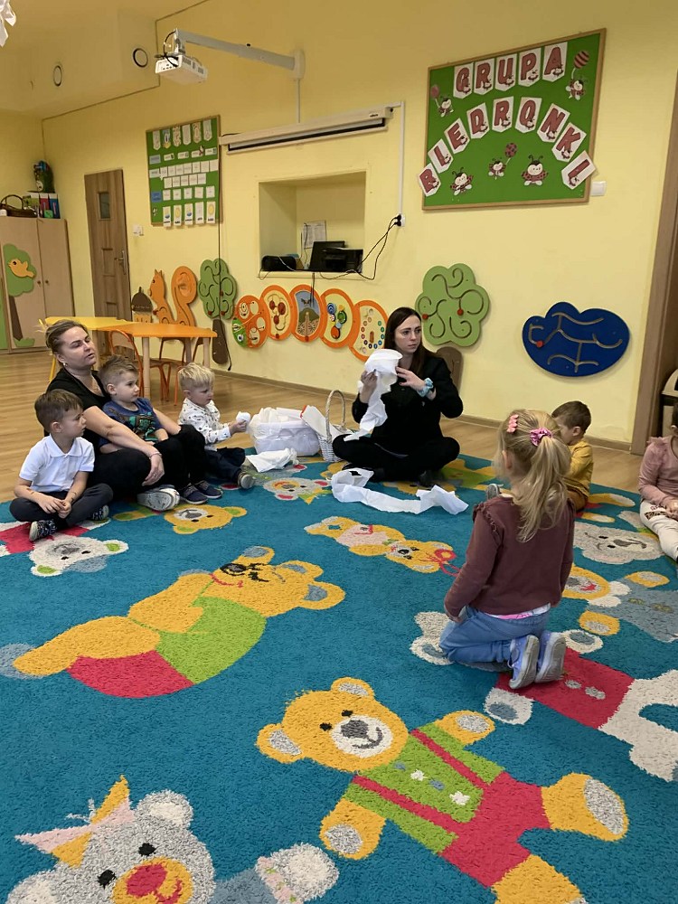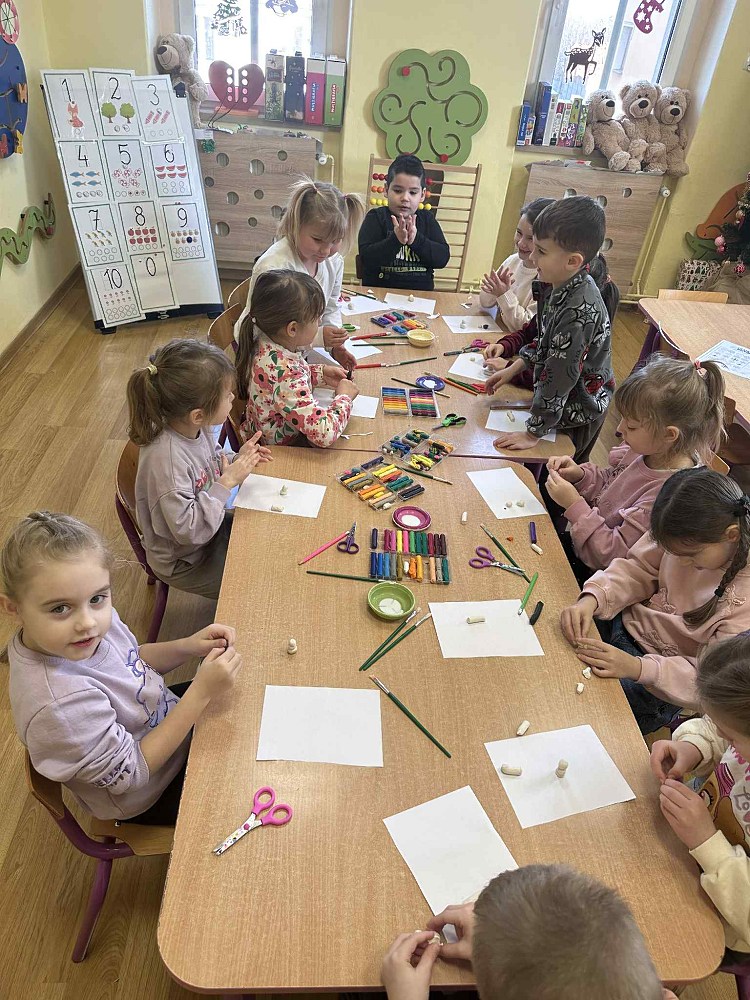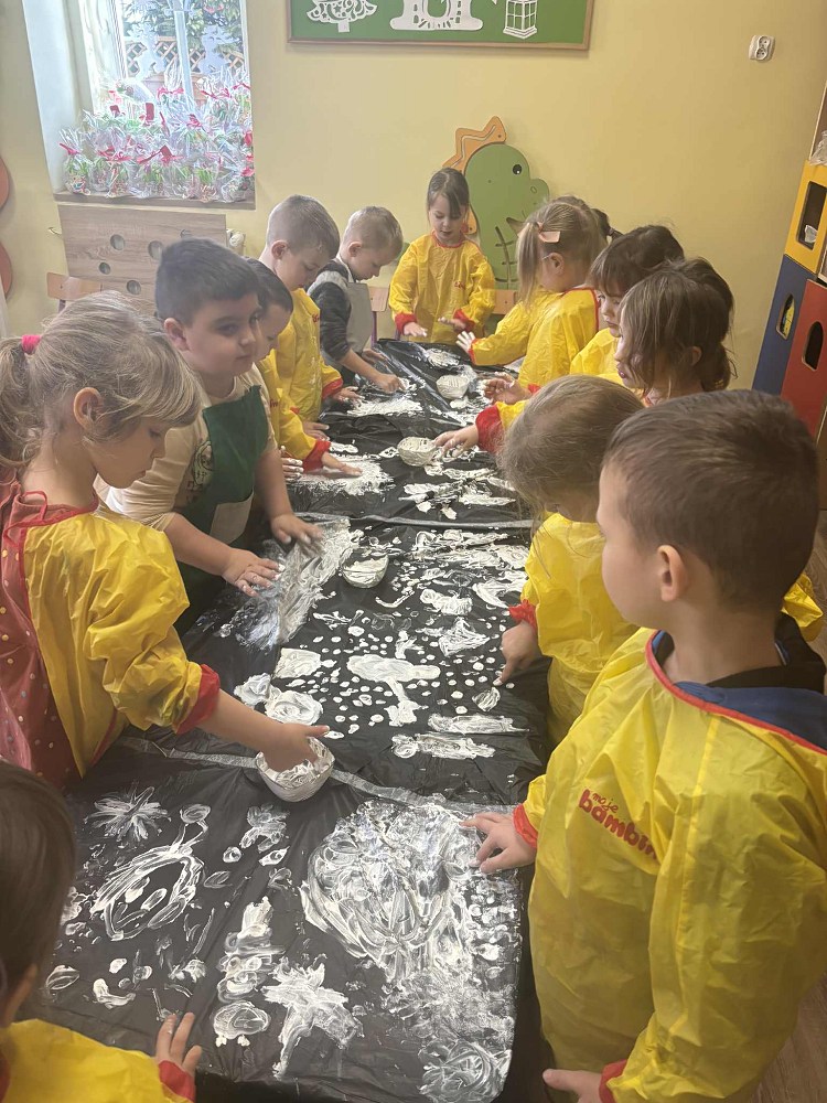 Na zajęciach dzieci próbowały odpowiedzieć na pytania: co to jest śnieg?, z czego powstają śnieżynki?, czy śnieg jest czysty?, dlaczego potrzebny jest śnieg?. Dzieciom zostały przypomniane zasady zapewniajace bezpieczeństwo zabaw na śniegu. Nie zabrakło również zabaw plastycznych i sensorycznych tj.: malowanie palcami, lepienie z plasteliny oraz lepienie ze sztucznego śniegu zrobionego w przedszkolu. Choć w tym dniu za okami nie było śniegu, to w przedszkolu panowała prawdziwie zimowa aura.