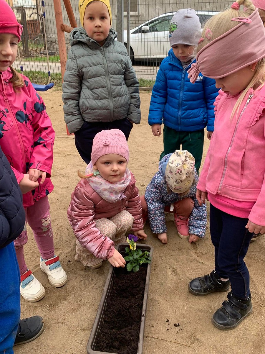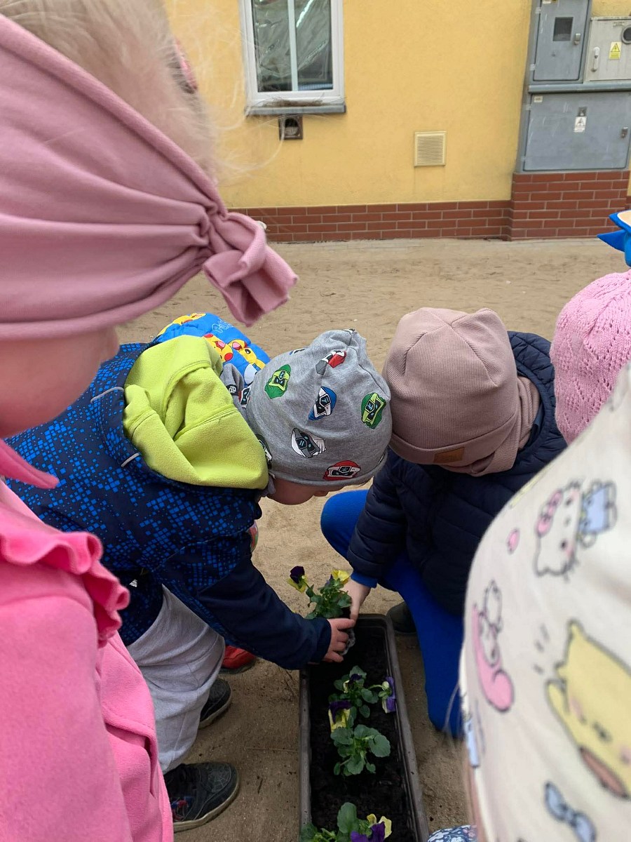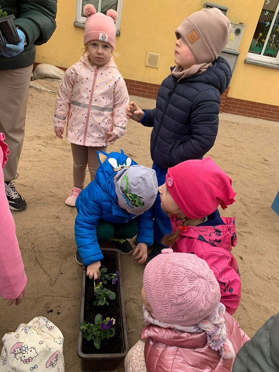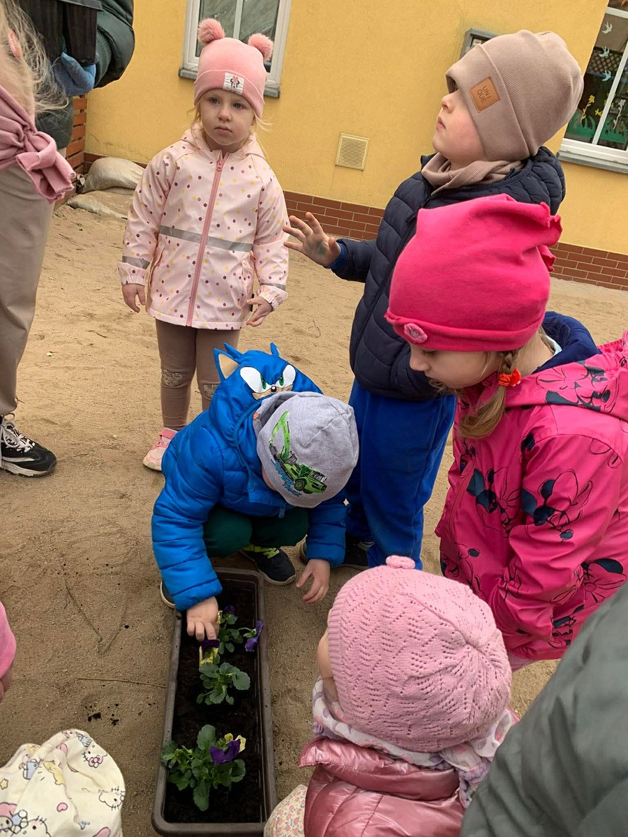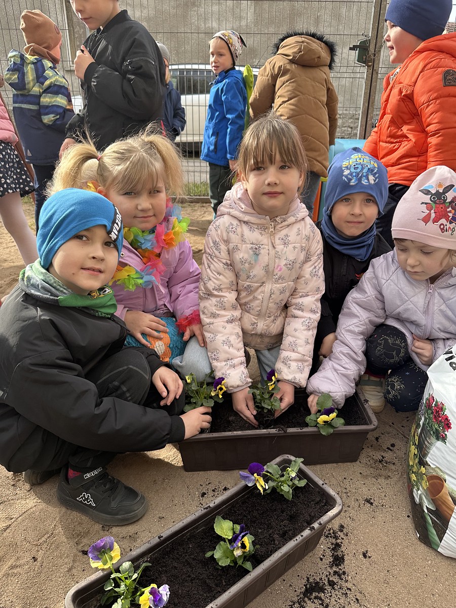 Po powrocie do przedszkola na dzieci czekało kolejne zadanie – sadzenie bratków. Przedszkolaki z ogromnym zaangażowaniem posadziły kwiaty, które już wkrótce ozdobią przedszkolny ogródek. Była to nie tylko świetna zabawa, ale także cenna lekcja dbania o rośliny i środowisko.