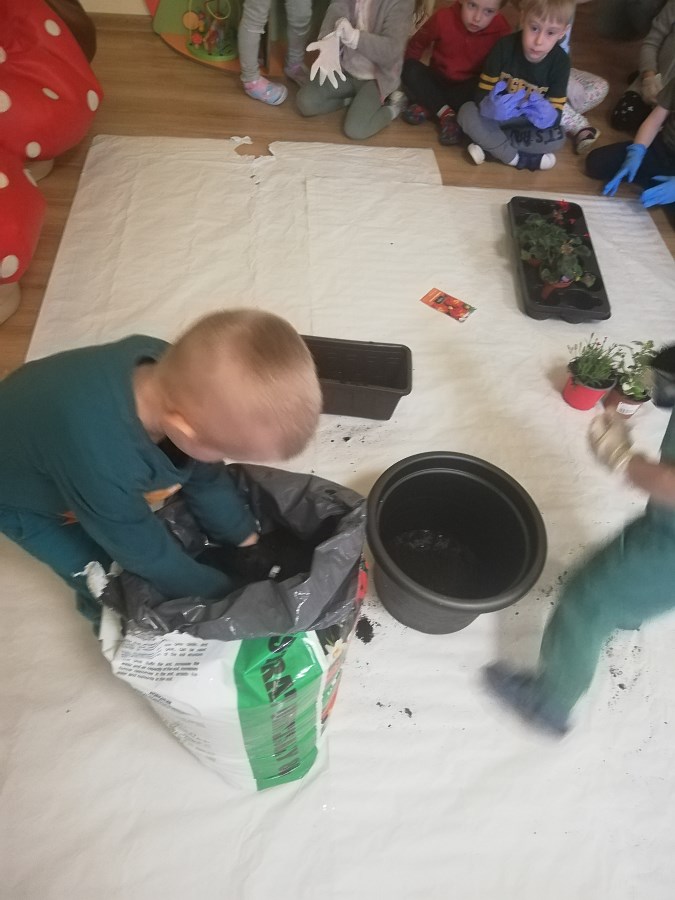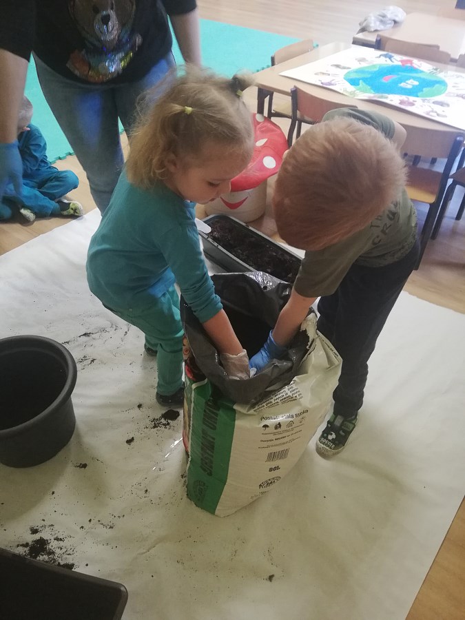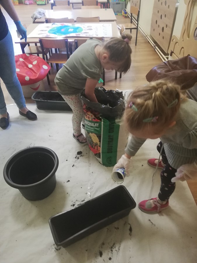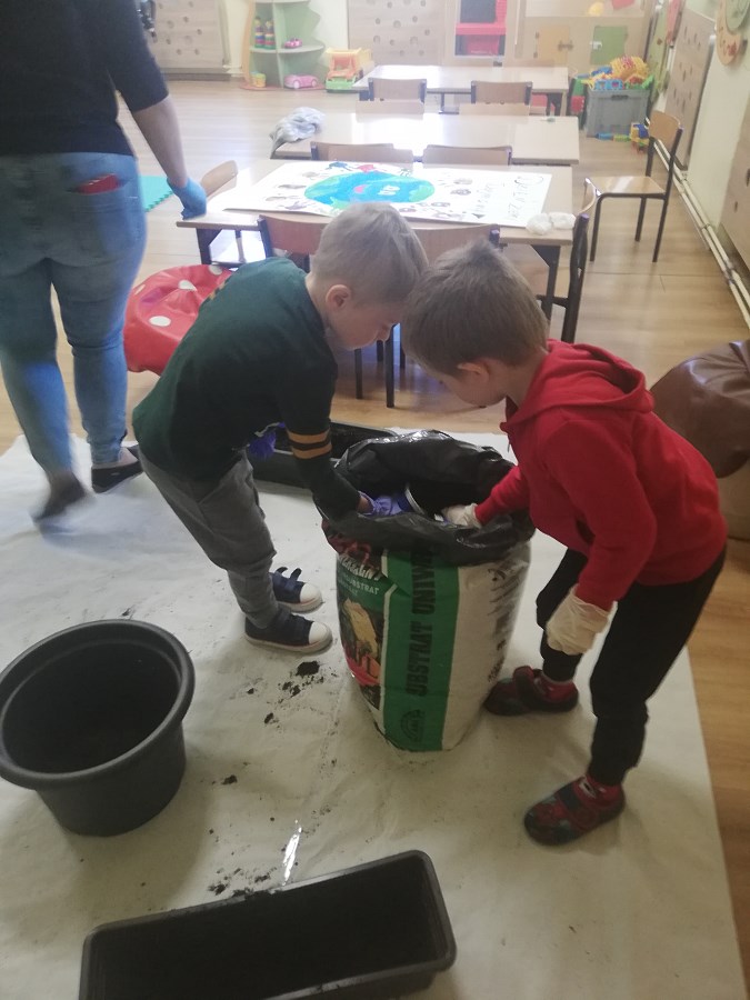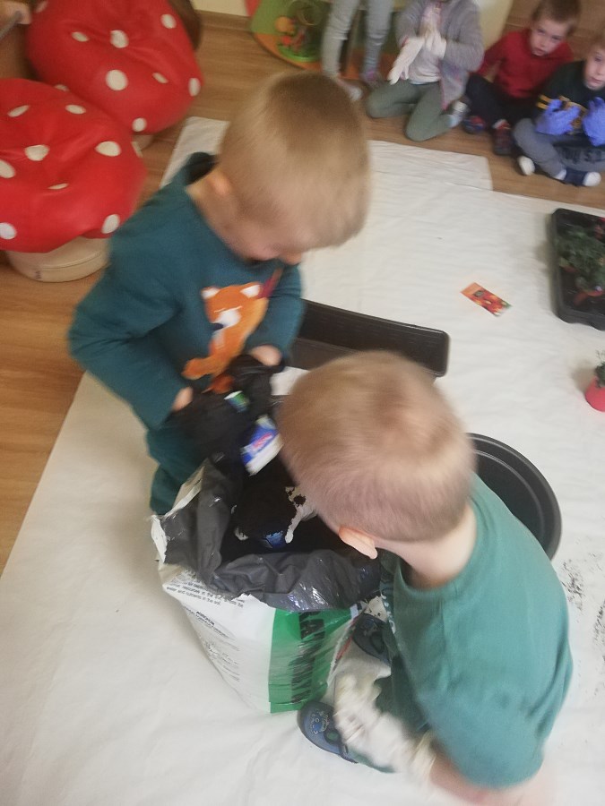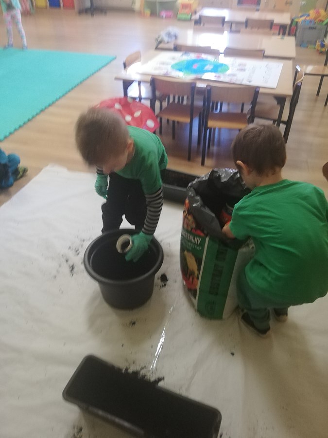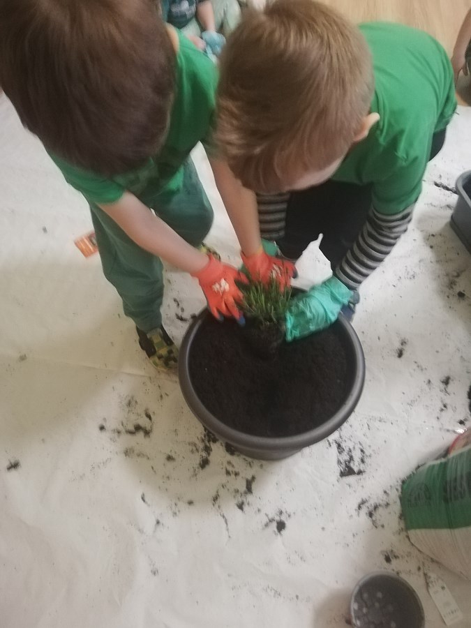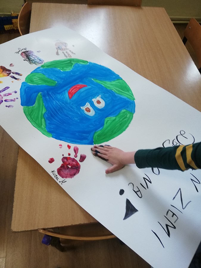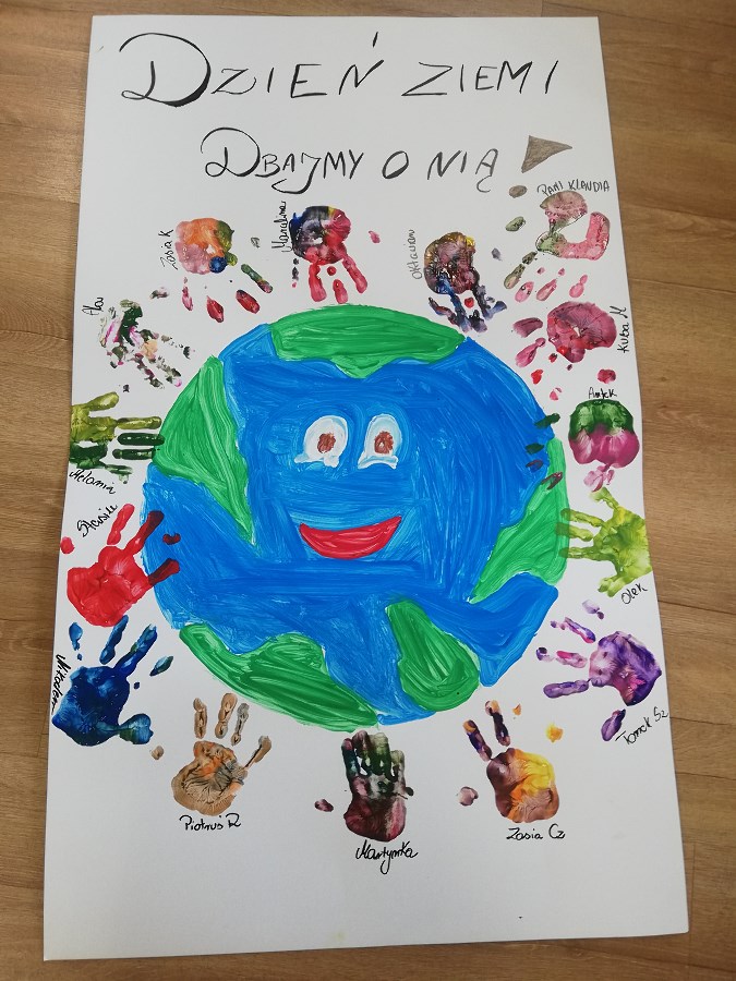 Przedszkolaki rozmawiały o zasadach segregacji odpadów. W całym przedszkolu, tak jak i w grupie najmłodszych dzieci, dominował kolor zielony. „Biedroneczki” wspólnie z wychowawczynią siały oraz sadziły kwiaty. Na koniec dnia, został wykonany wspólny plakat, który wisi dumnie w naszym przedszkolu.